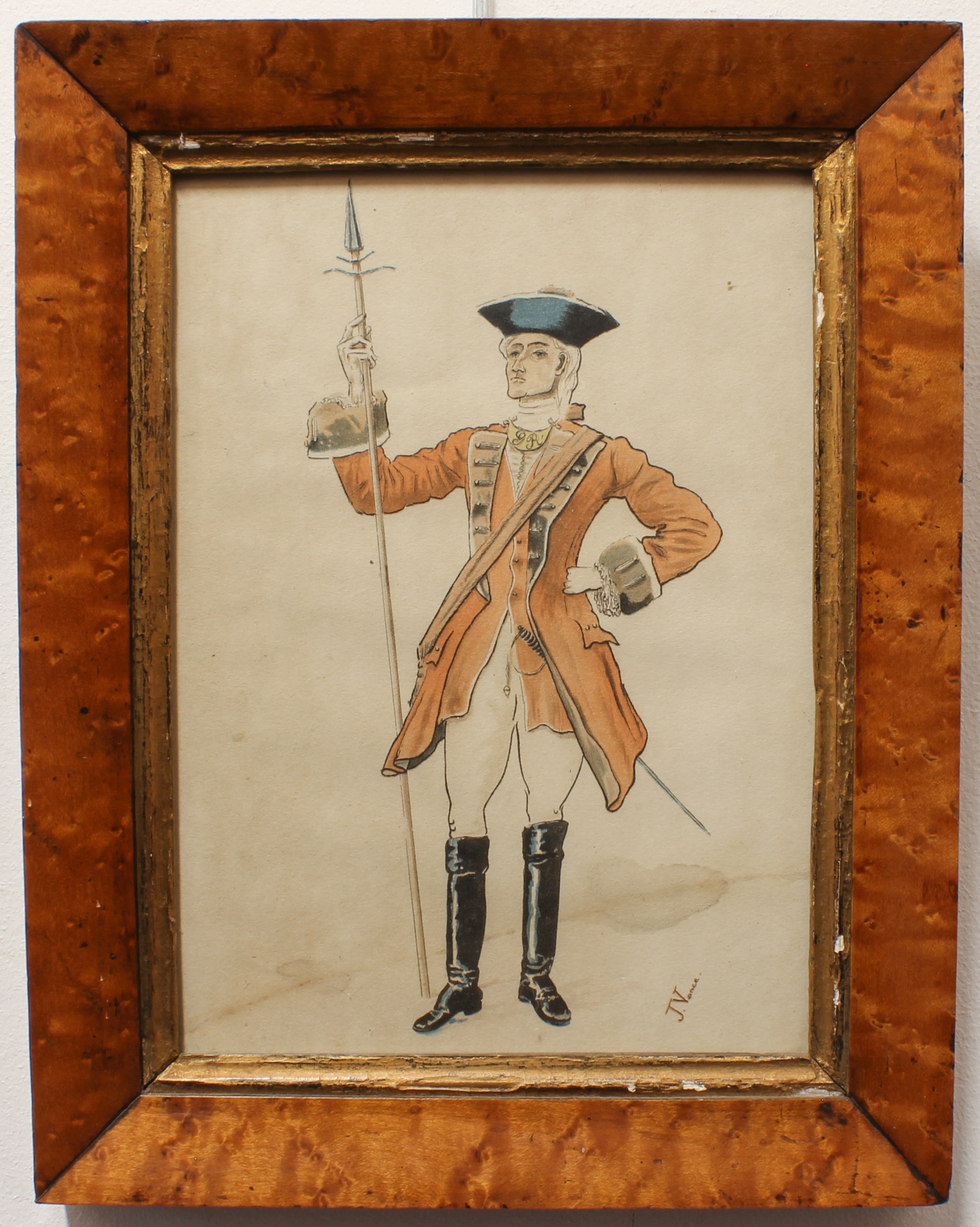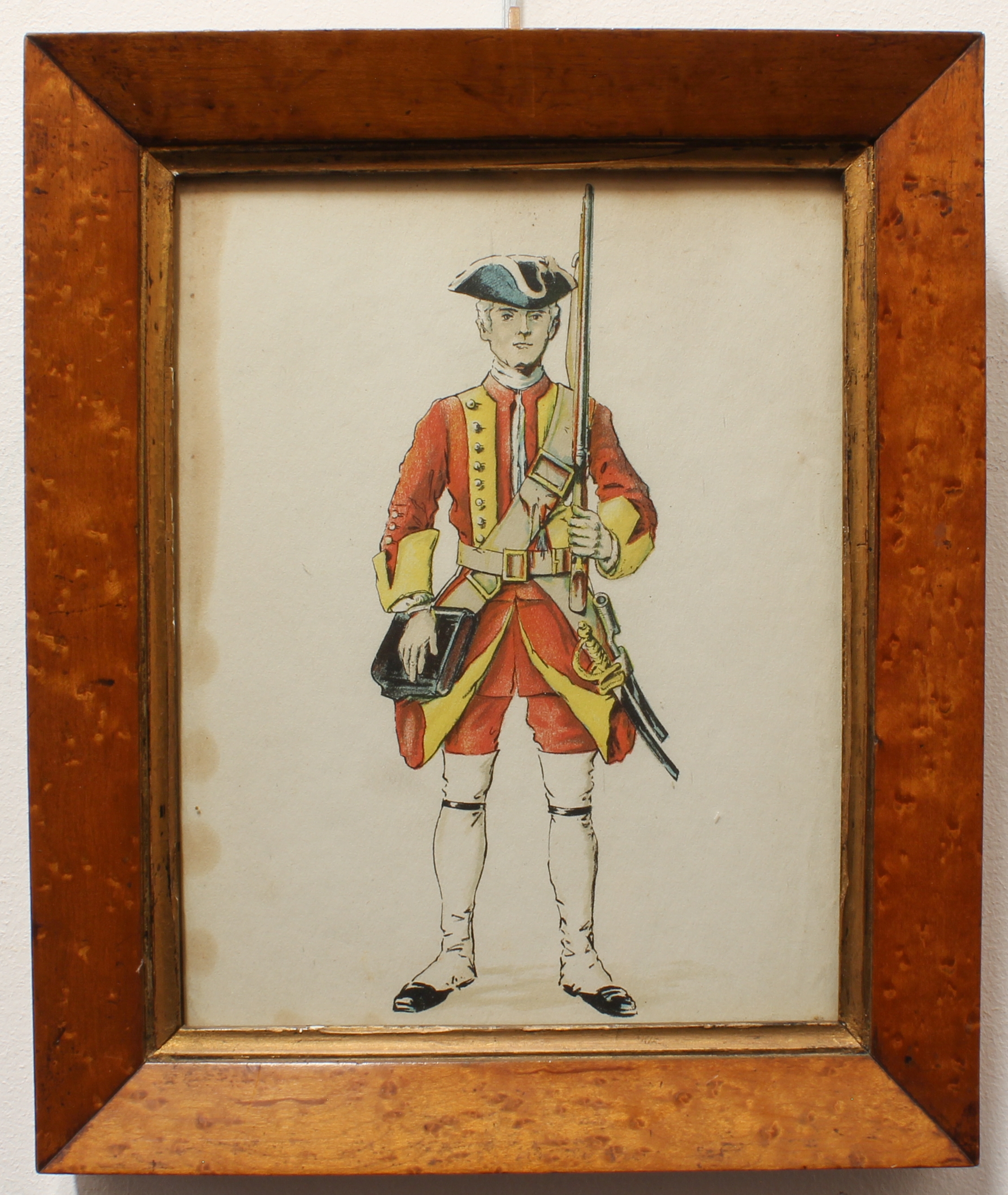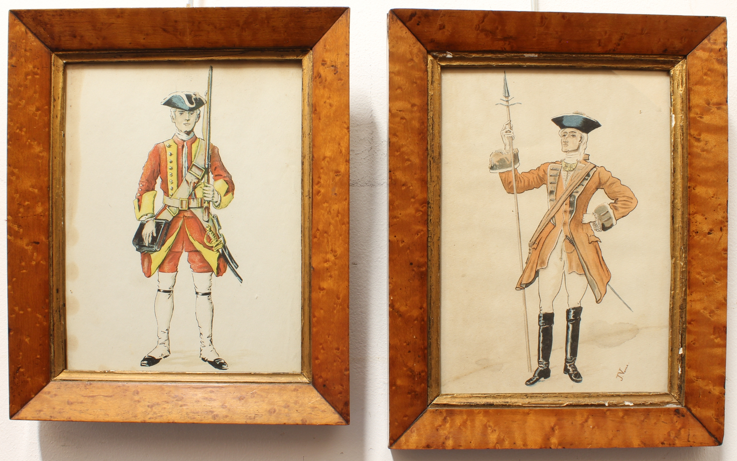 2. After J. VANCE - two prints, soldiers in uniform. (Parcel-gilt bird's-eye maple frames approx. 30 x 23.5 cm).