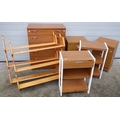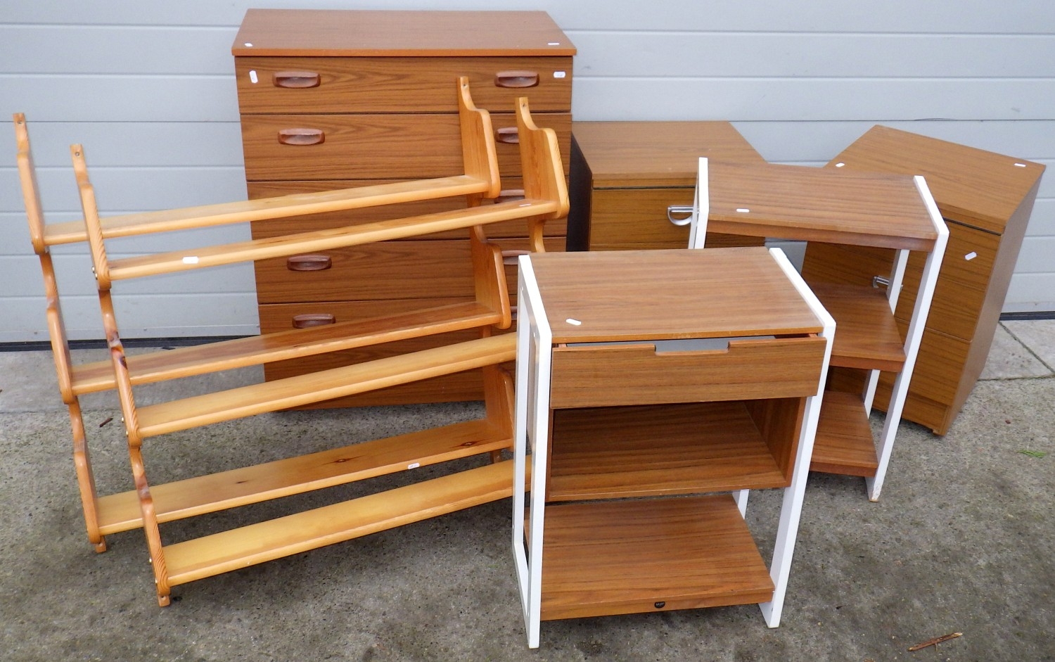A Schreiber chest of drawers, pair of hanging shelves, pair of bedside chests, two small shelves (7)