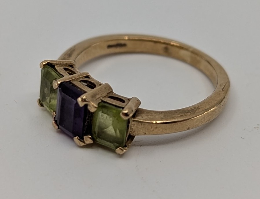 set with a central approx. 0.40ct rectangular step cut deep purple amethyst and two approx. 0.35ct rectangular step cut light green peridots, hallmarked "375" for 9ct gold, size L, approx. 2.8g gross