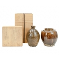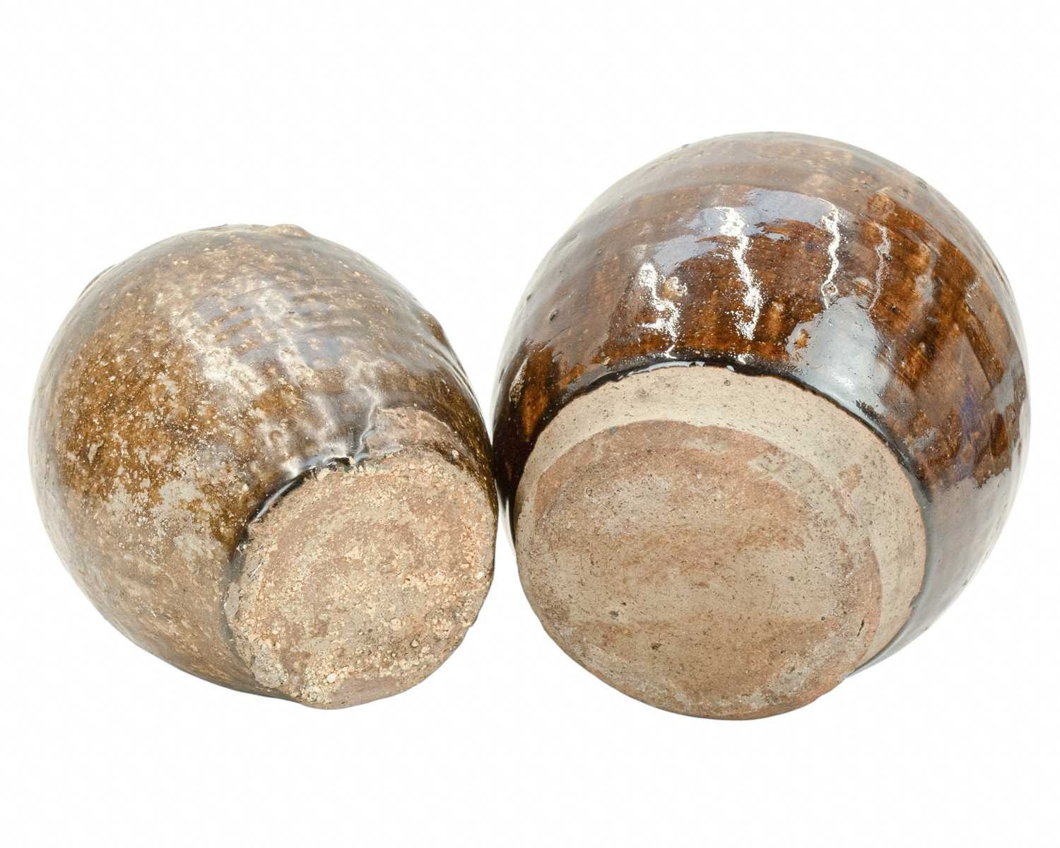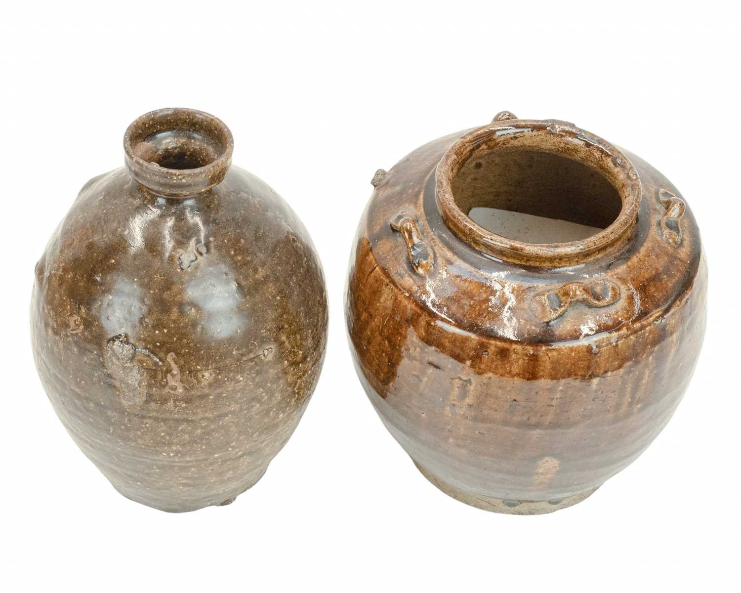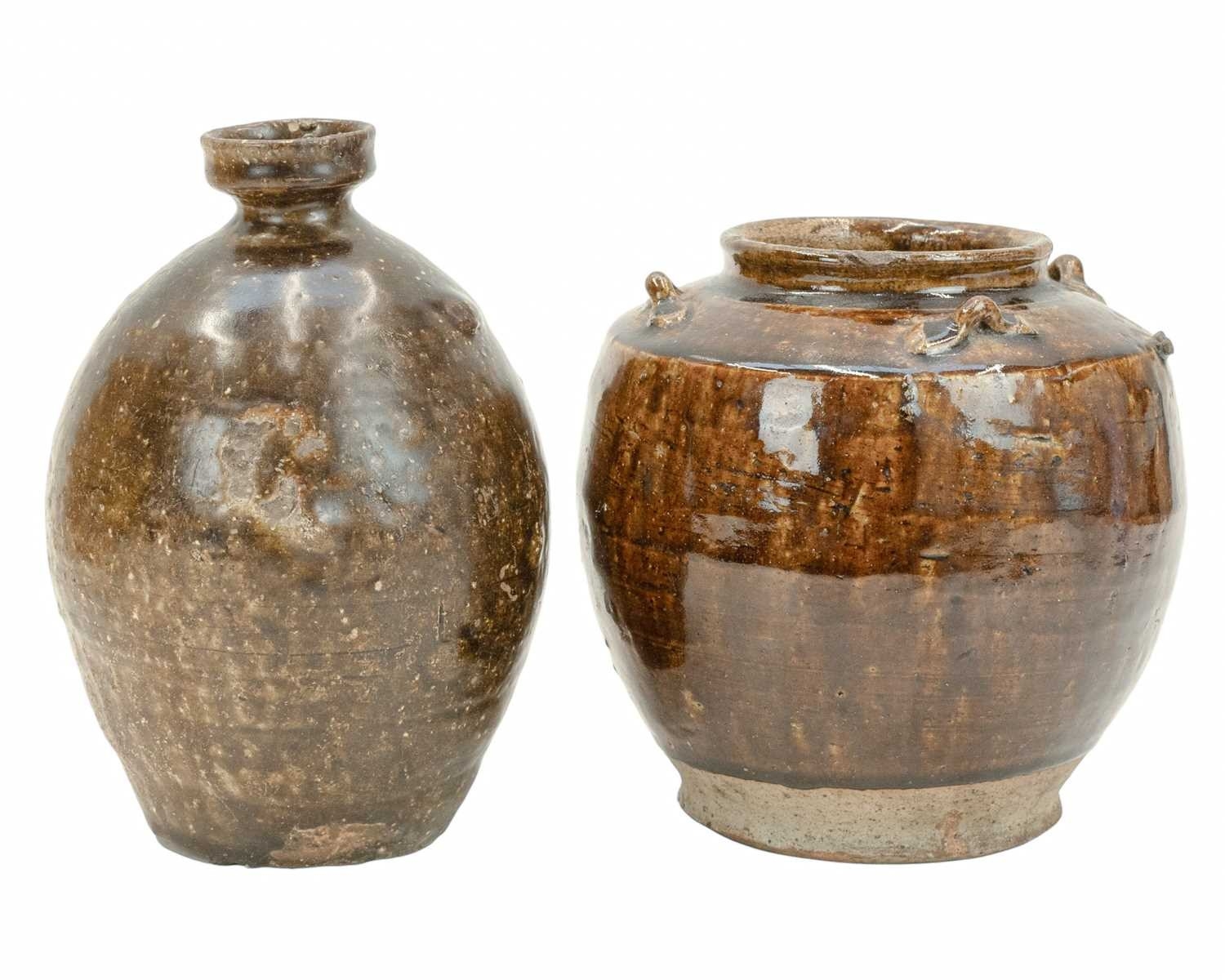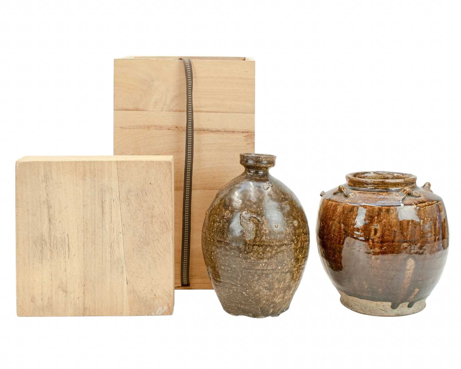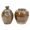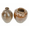 Two Korean pots. 18th century or earlier, each with a deep brown glaze, the first with an ovoid body and cylindrical rim, height 20.5cm, in a display box, labelled for the Hans Collection, the second with four lugs, height 18cm (2). The collection of the late potter Peter Smith of Bojewyan Pottery in West Cornwall. Fellow of the Craftsman Potters Association, member of Newlyn Society of Artists and later chairman of Newlyn Gallery. Peter was also an influential teacher of ceramics at Falmouth University, where he encouraged a spontaneous and improvised approach based on developing technique and an understanding of the medium of clay as an expressive and practical form. Peter originally started as a research chemist before turning to pottery after attending evening classes. He started his own pottery at Bojewyan in West Cornwall in 1974. As well as being a renowned and experimental potter and tutor, he was also a keen collector of medieval and later pottery from the UK and further afield. His Guardian obituary can be read here: https://www.theguardian.com/artanddesign/2025/aug/13/peter-smith-obituary