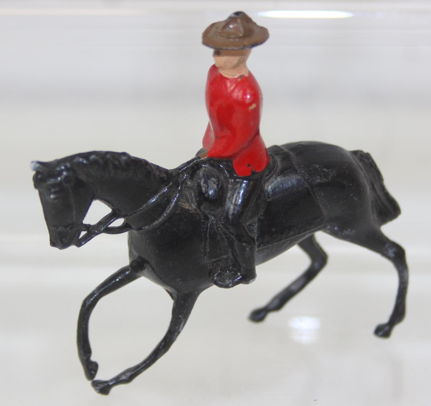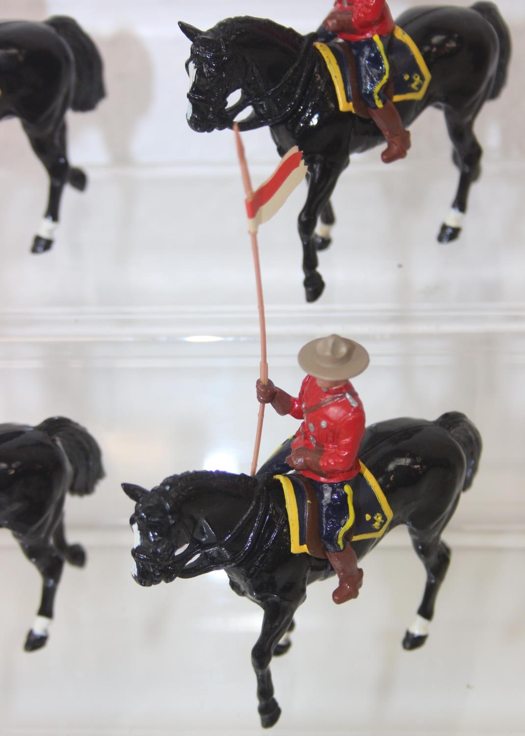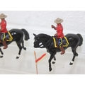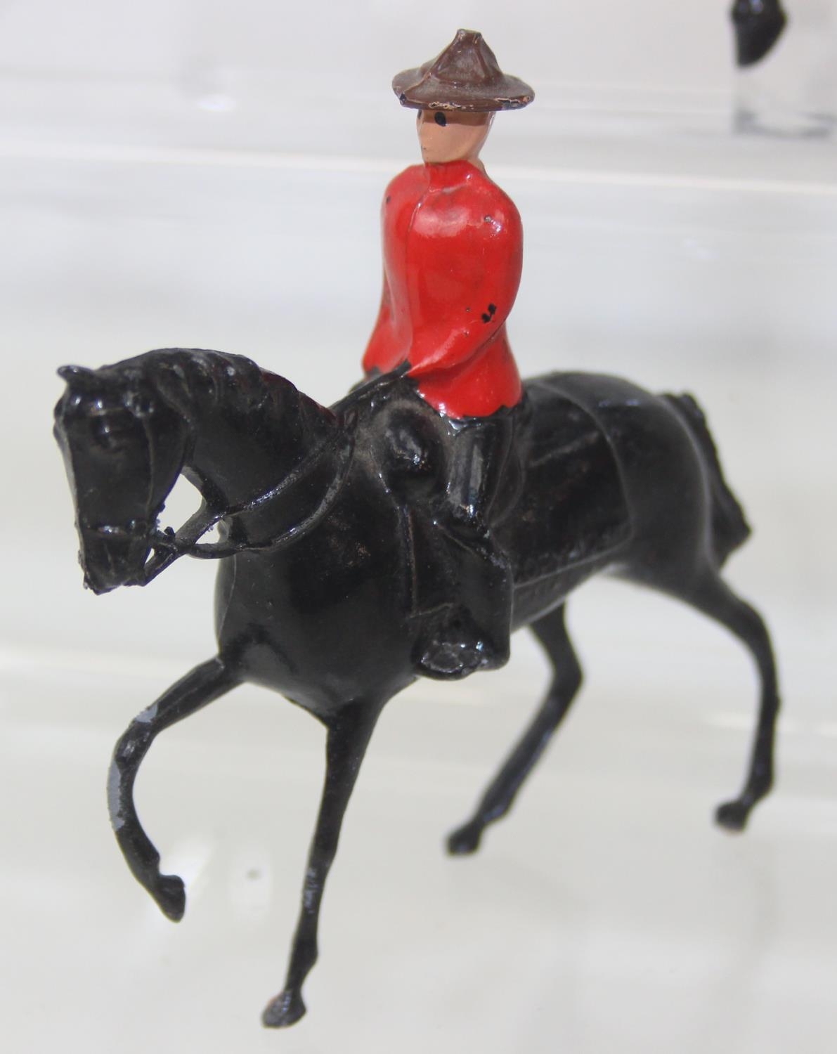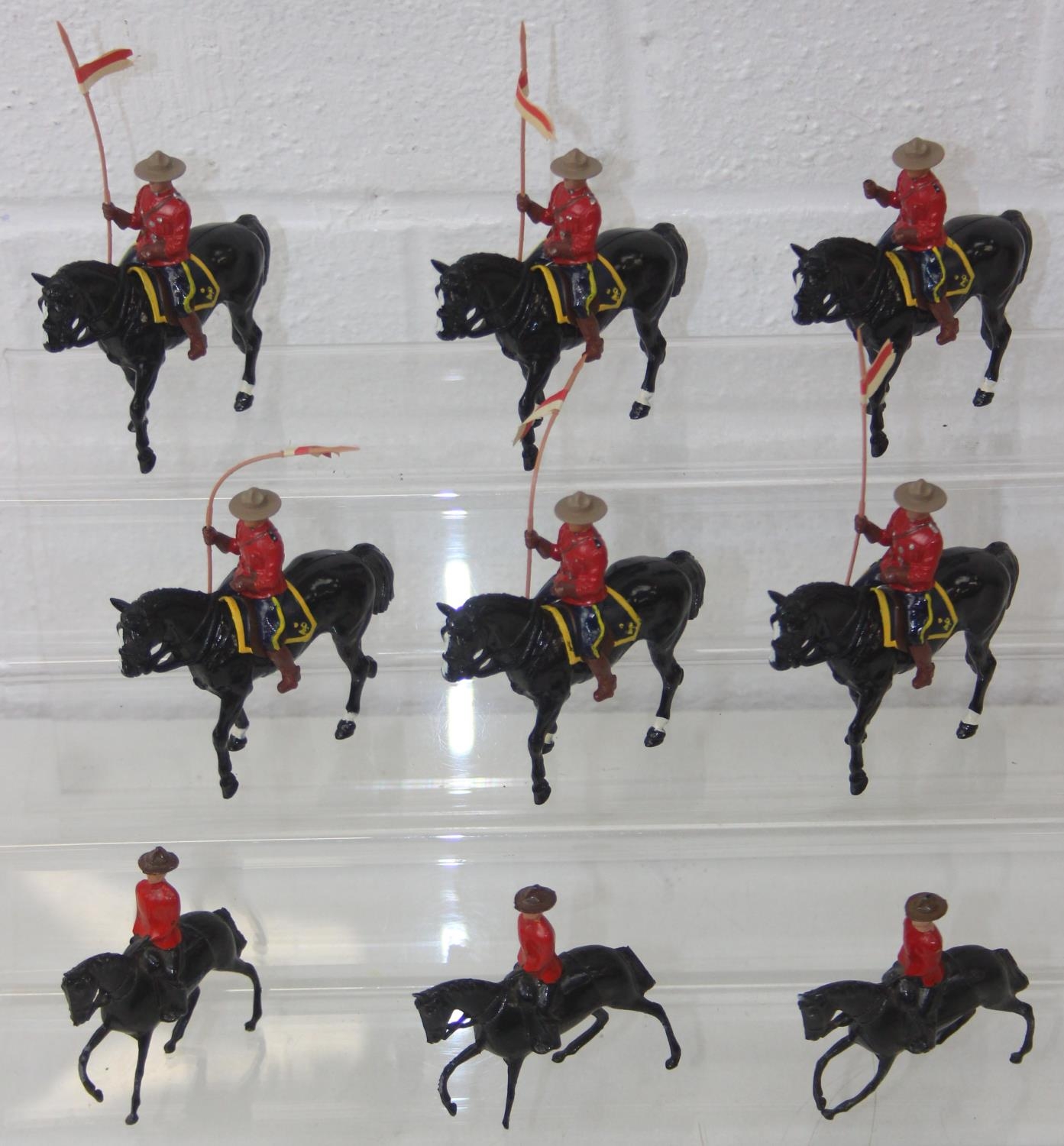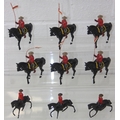 Nine assorted painted die-cast lead figures, all RCMP (Royal Canadian Mounted Police) or Mounties, on horseback, three marked Britains the other six believed to be Britains Swoppets [9]
