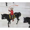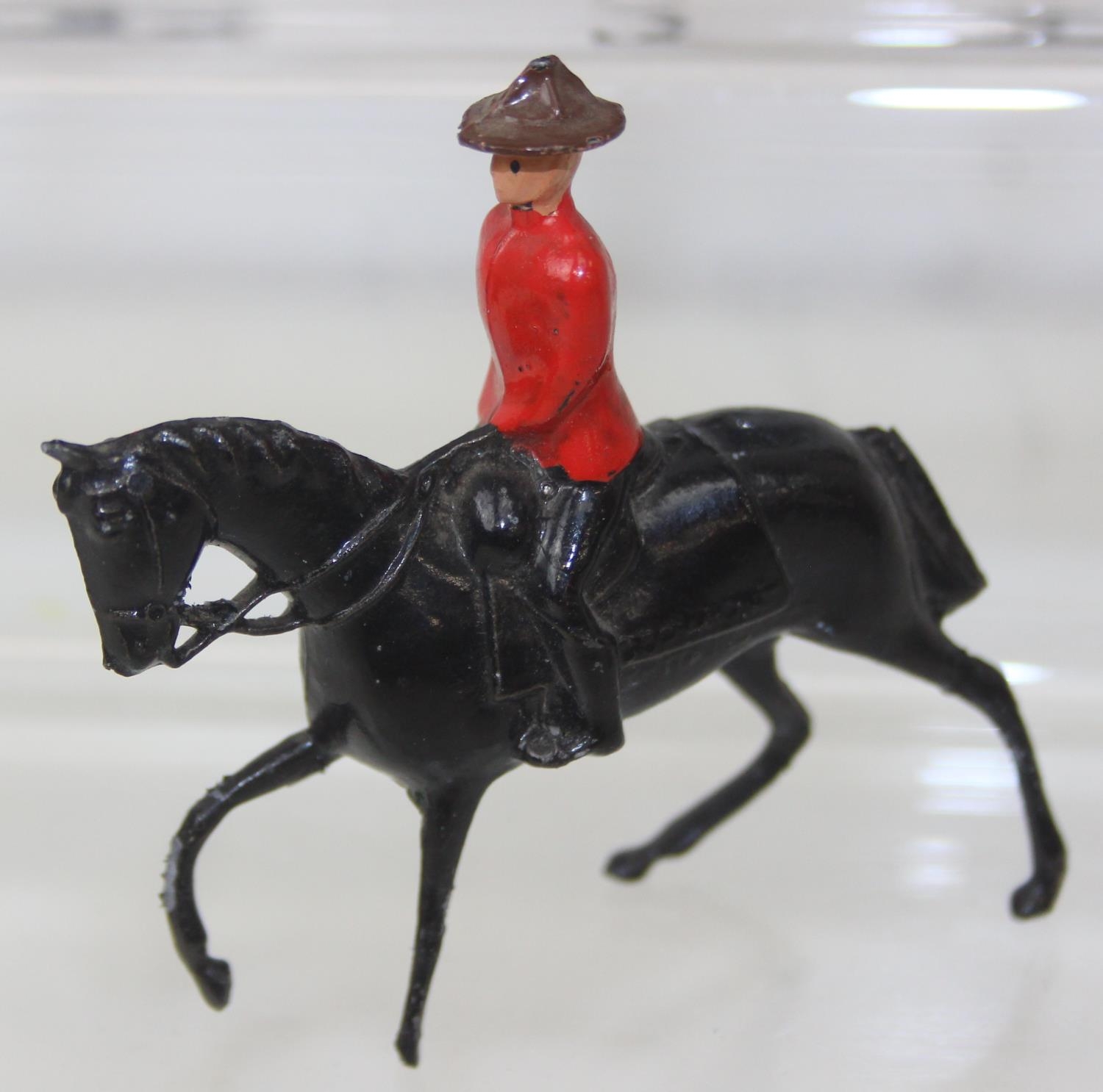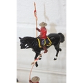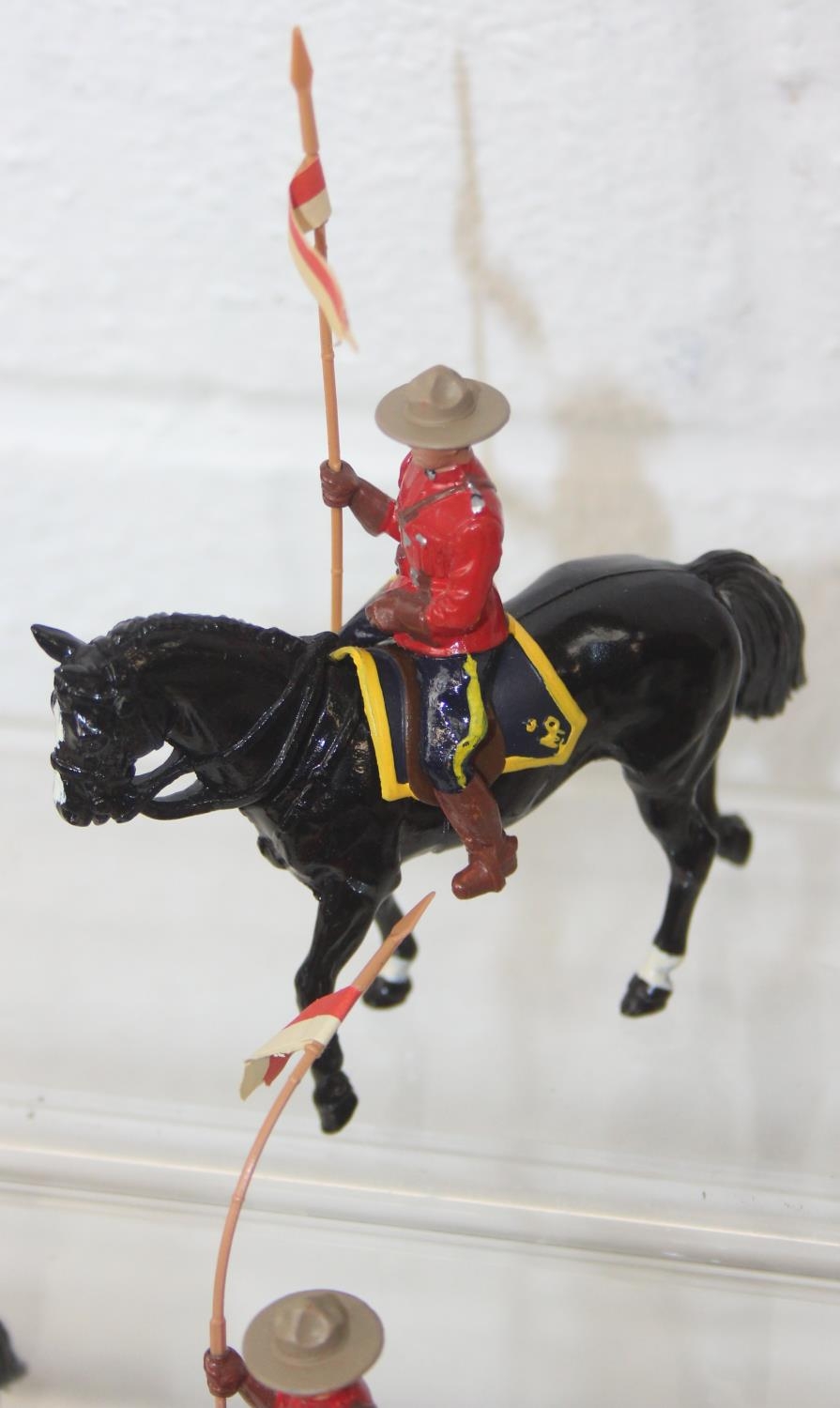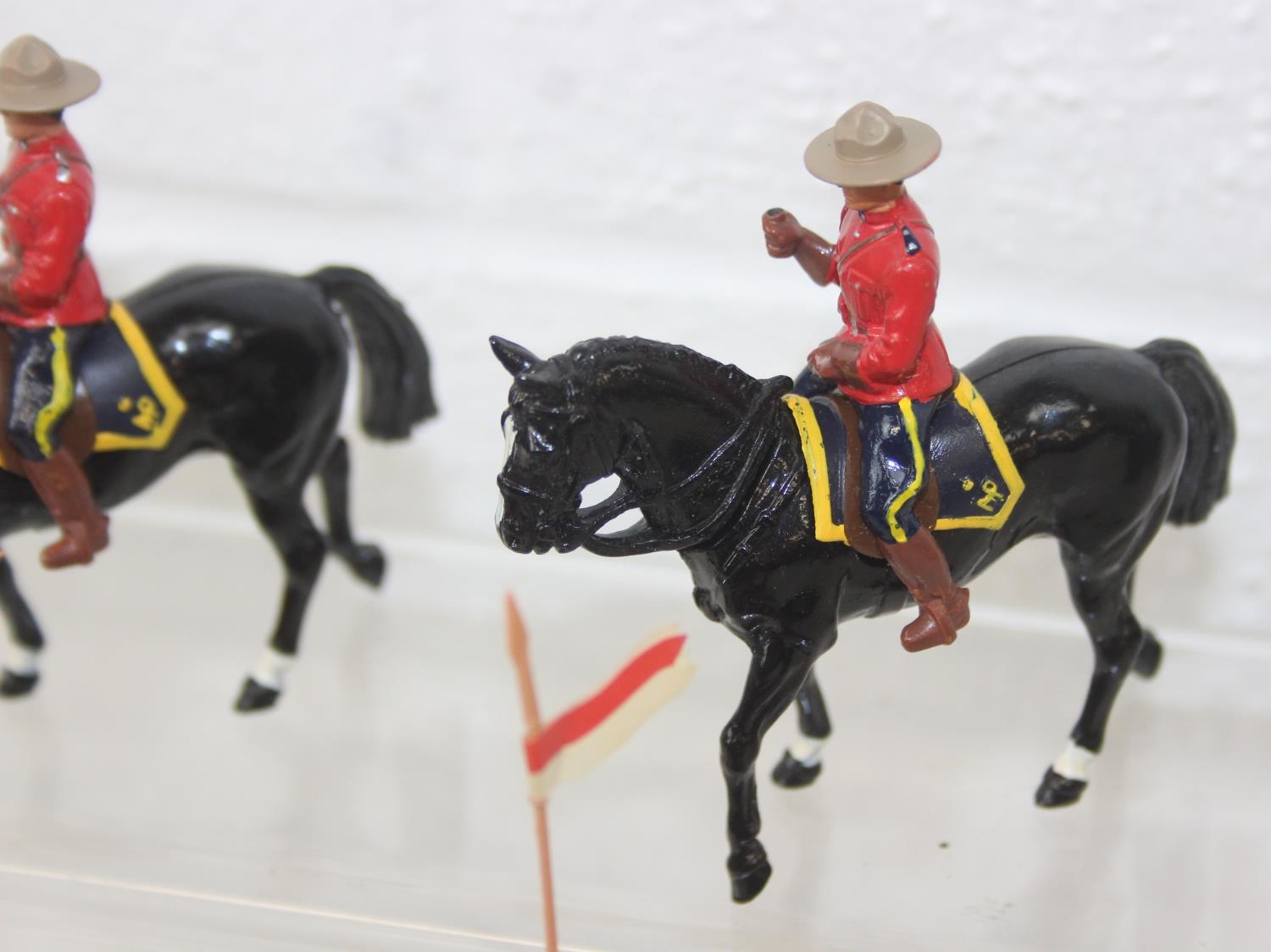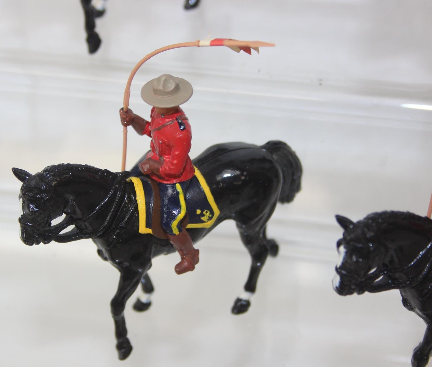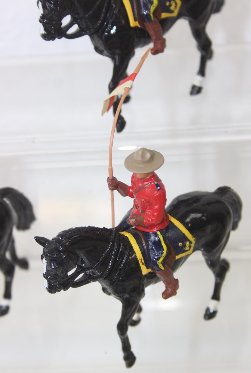 Nine assorted painted die-cast lead figures, all RCMP (Royal Canadian Mounted Police) or Mounties, on horseback, three marked Britains the other six believed to be Britains Swoppets [9]