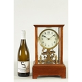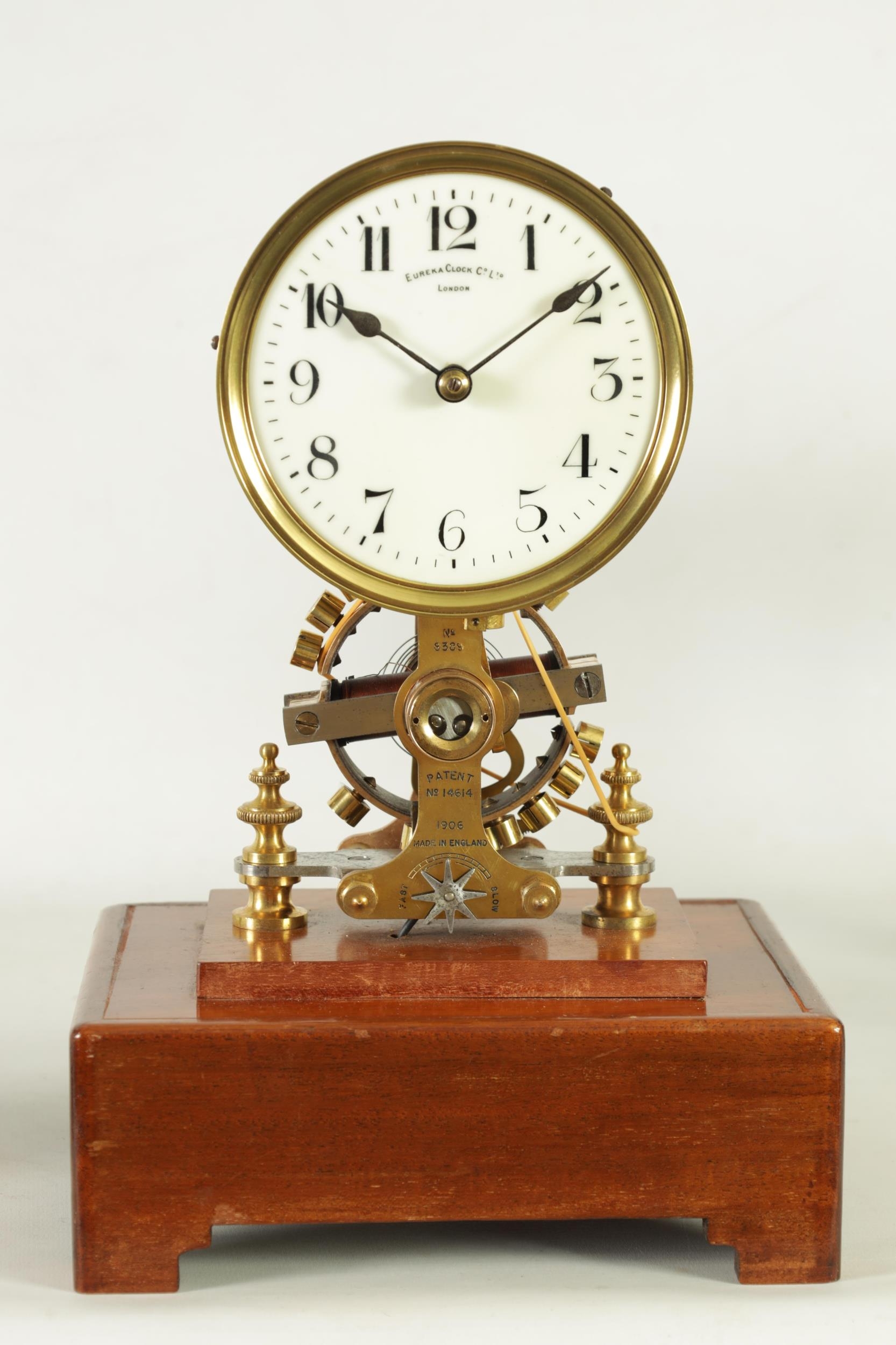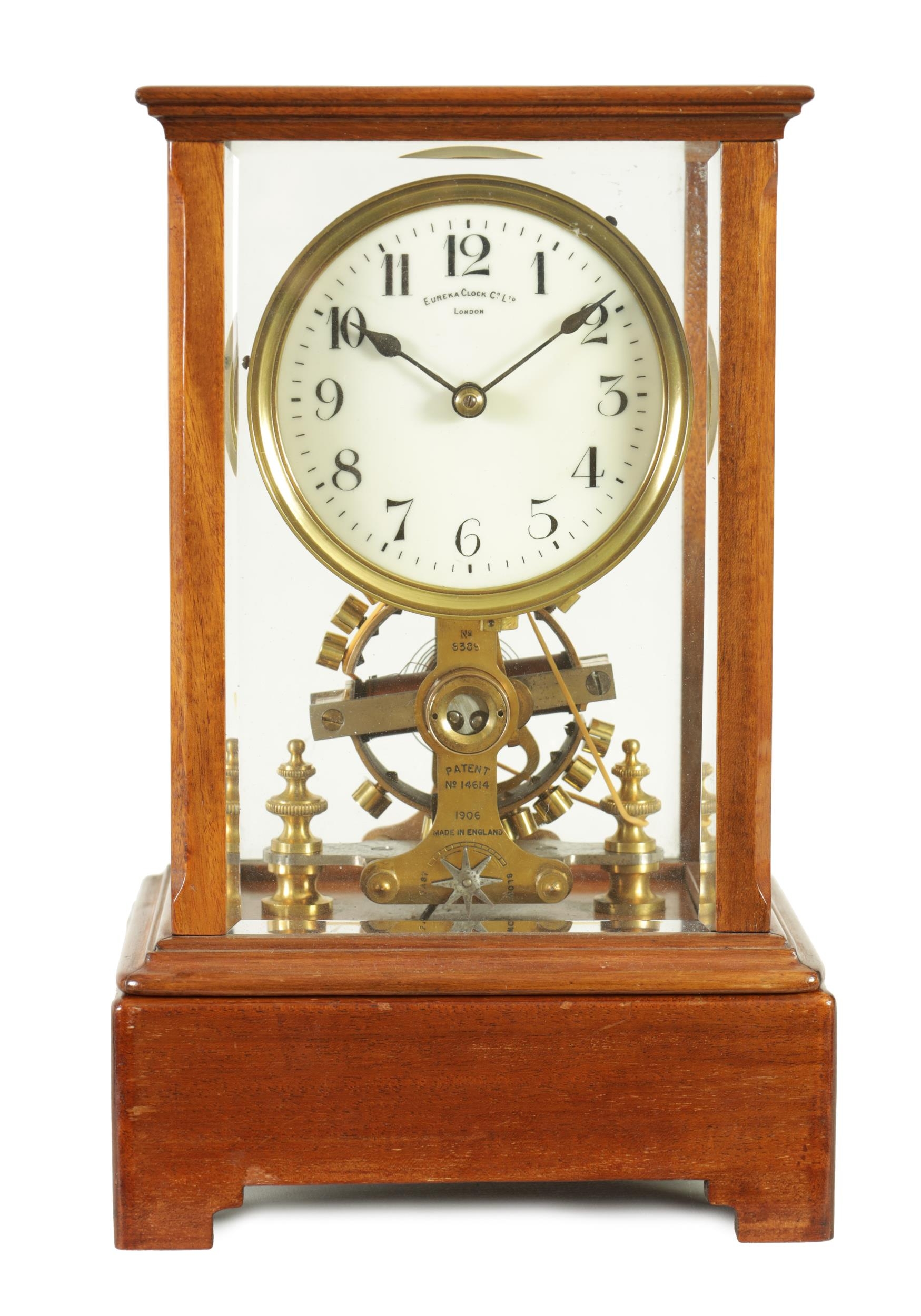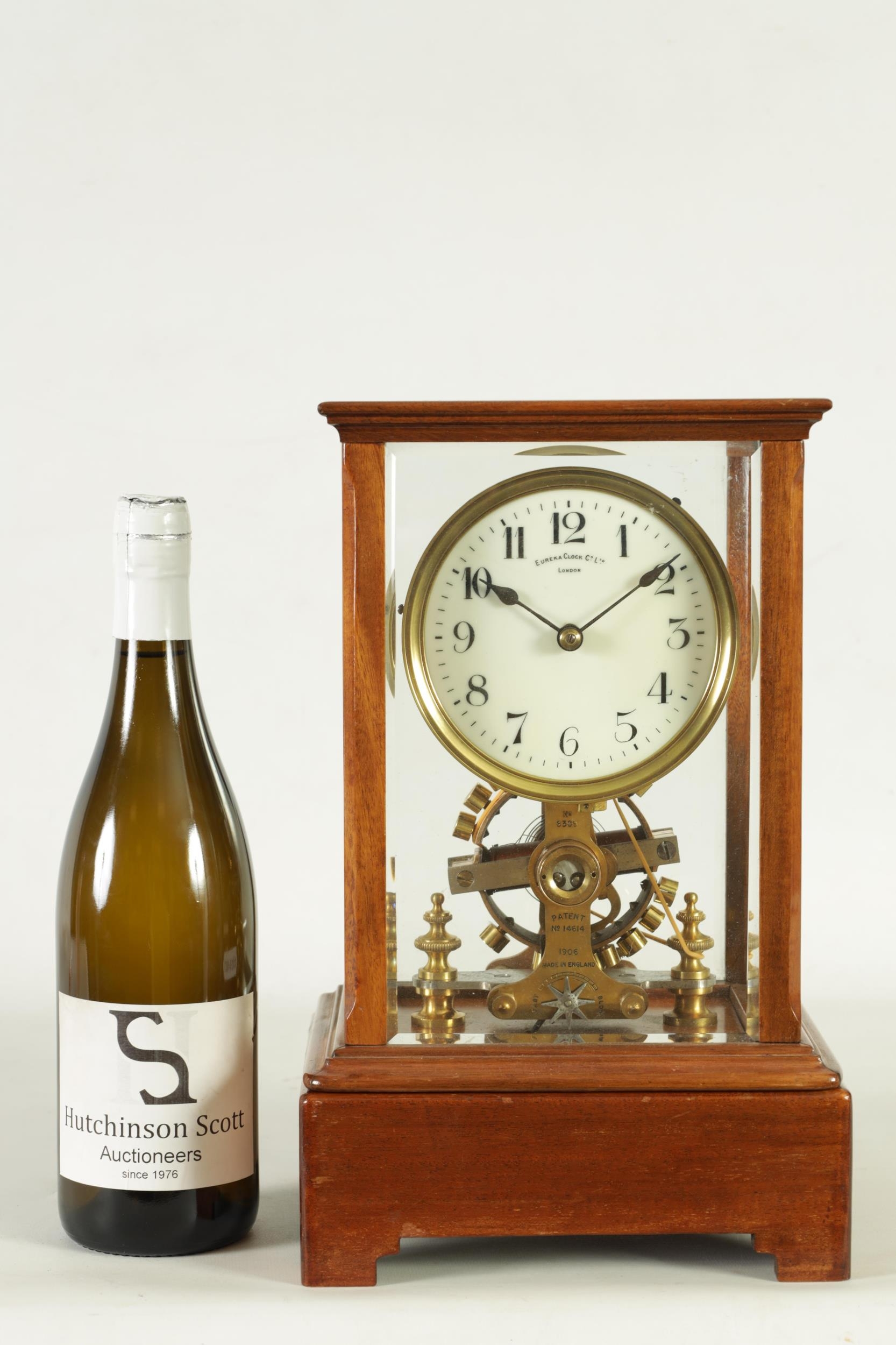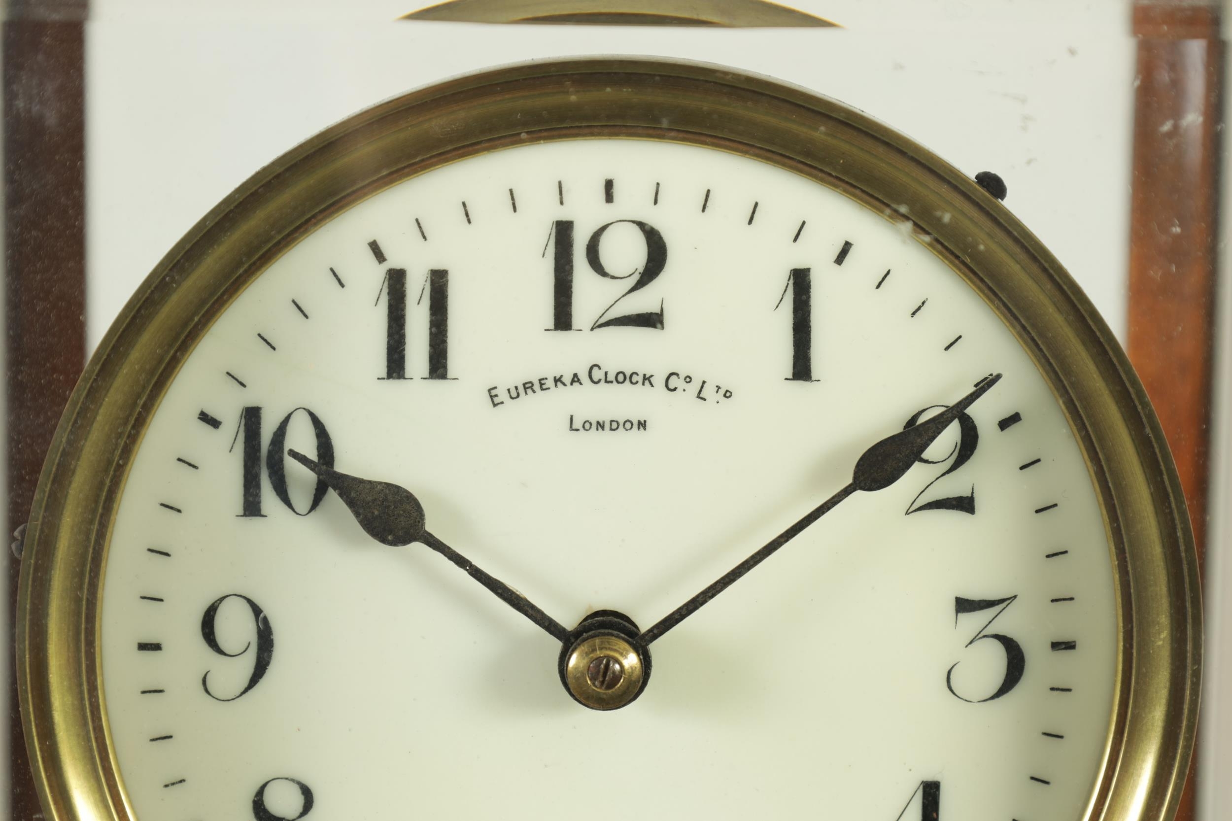 EUREKA CLOCK CO. LTD. LONDON AN EARLY 20TH CENTURY ENGLISH MAHOGANY FIVE GLASS ELECTRIC MANTEL CLOCK the moulded case inset with bevelled glass panels enclosing a 4.5" enamel dial with Arabic numerals fronting a battery-powered movement with weighted magnetic impulse wheel (33.5cm high)