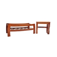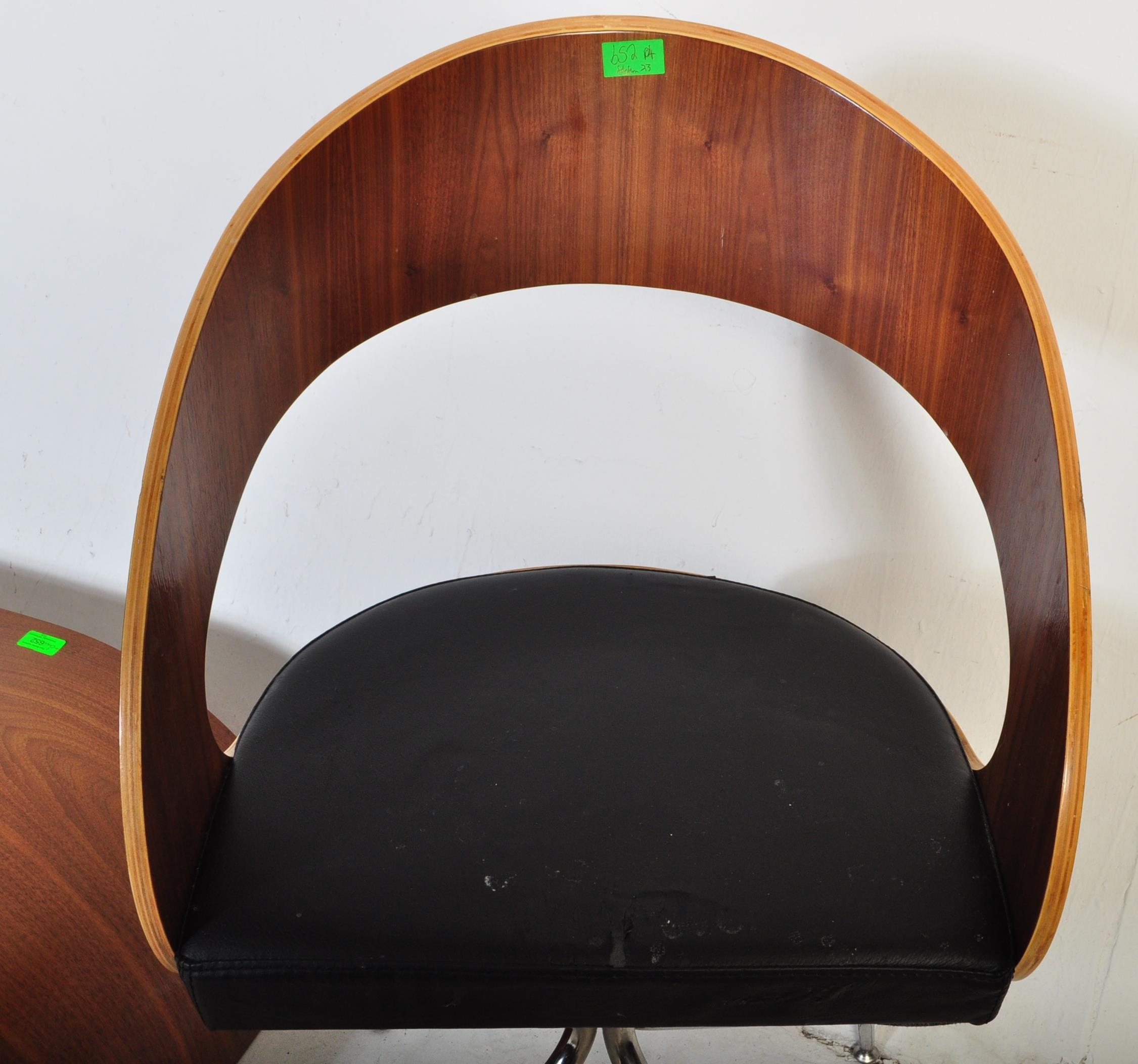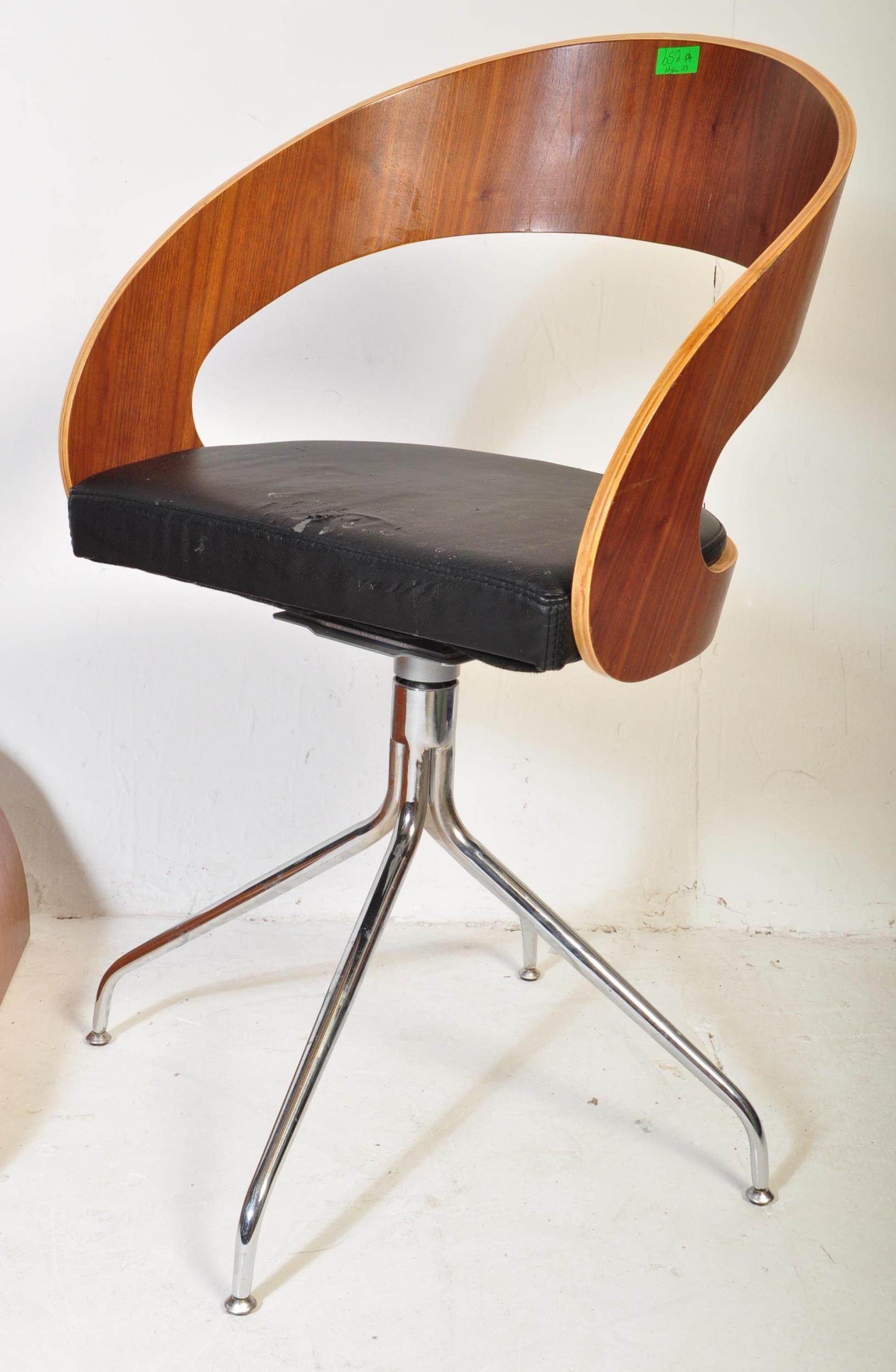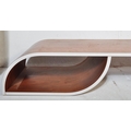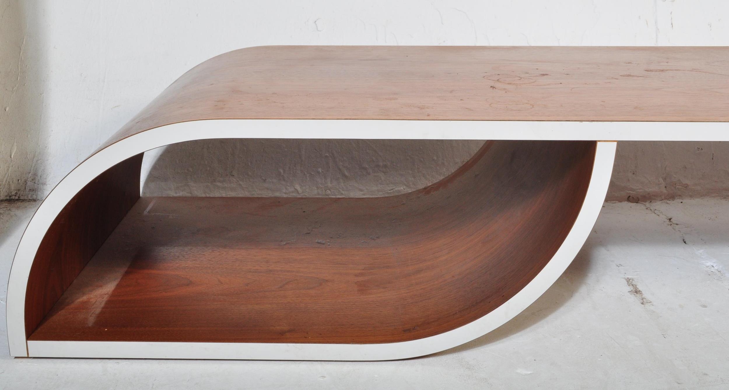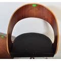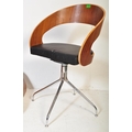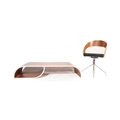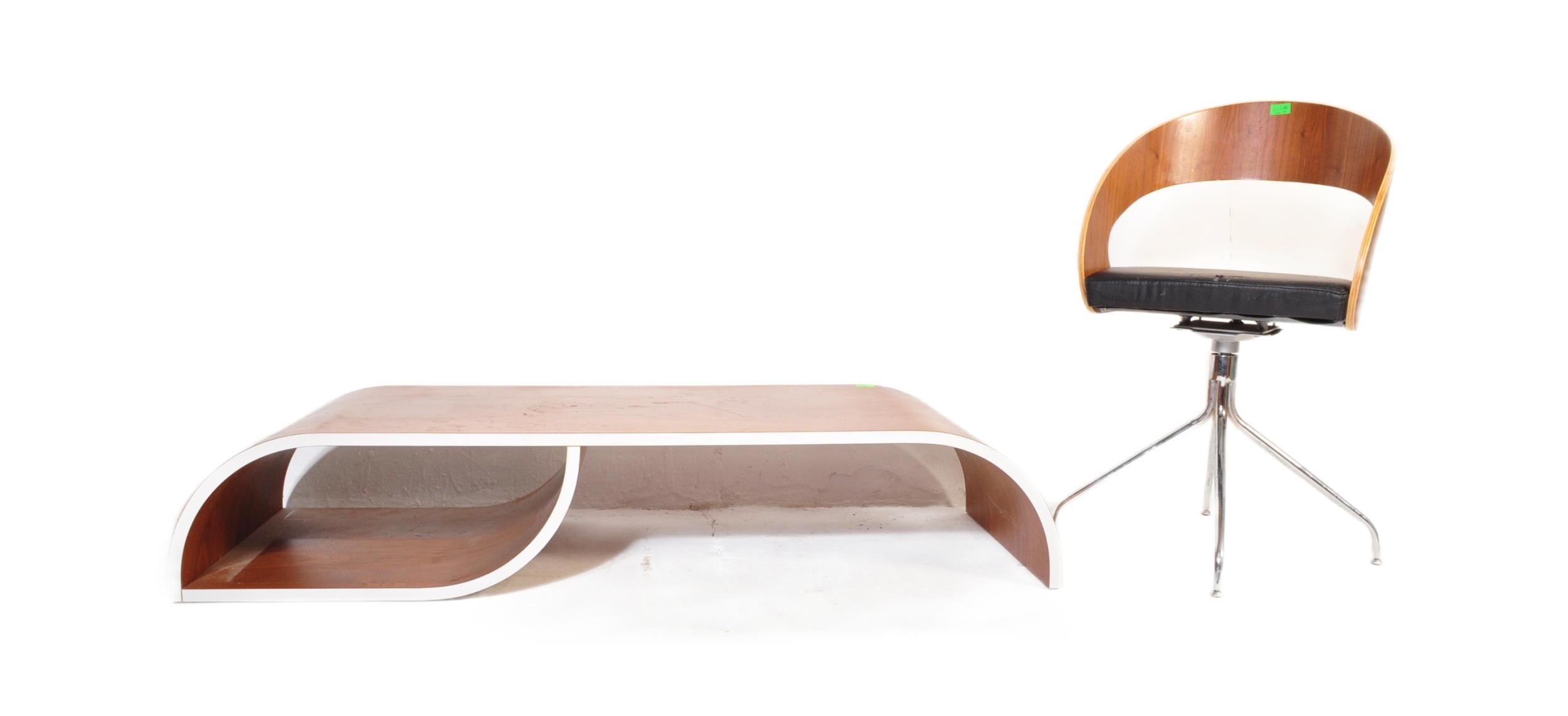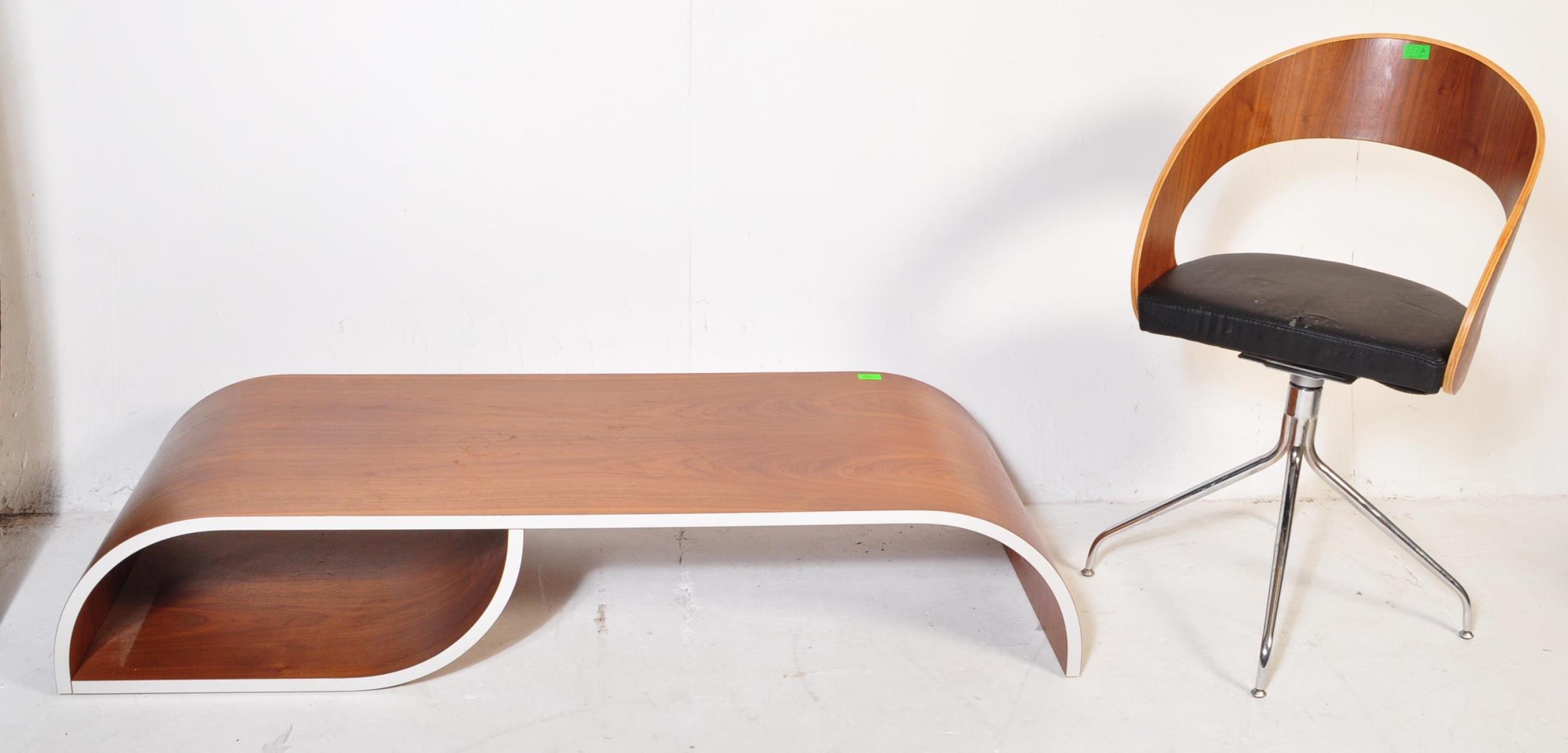 A contemporary low bentwood coffee table / console table along with a bentwood desk chair raised on chrome splayed leg supports. Measures approx; 28cm x 148cm x 55cm.