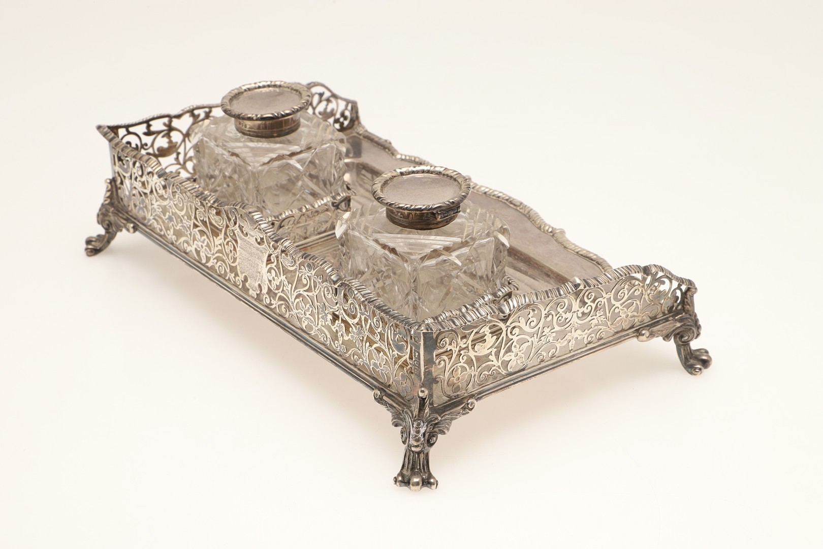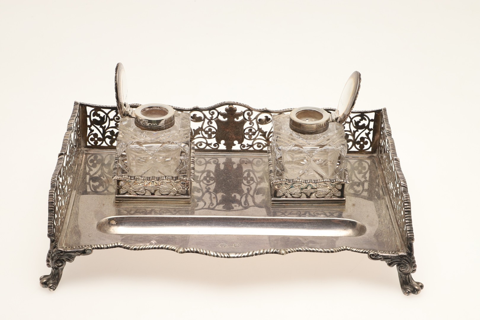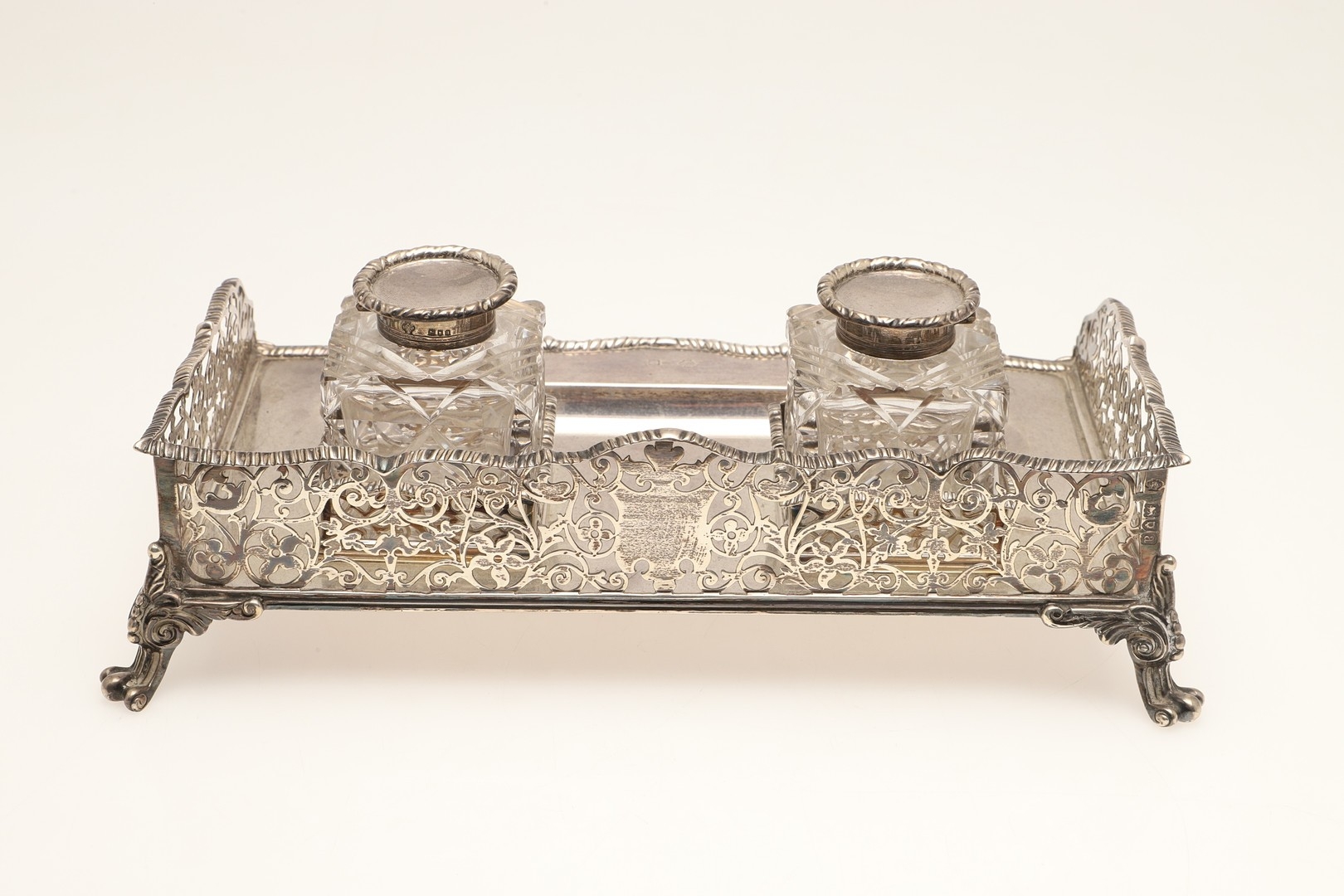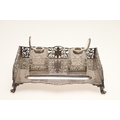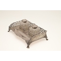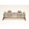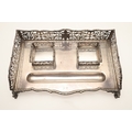 A LATE VICTORIAN SILVER INK STAND. Of rectangular form with shaped front, gadrooned edging and pierced foliate decorated ¾ gallery, twin cut glass silver hinge lid mounted ink bottles and raised on four out swept scroll cast feet. Hallmarked William Hutton & Sons Ltd, London 1896. Stand weight (excluding bottles) 24.8ozt. Height 7.5cm x Width 27cm x Depth 18cm.
