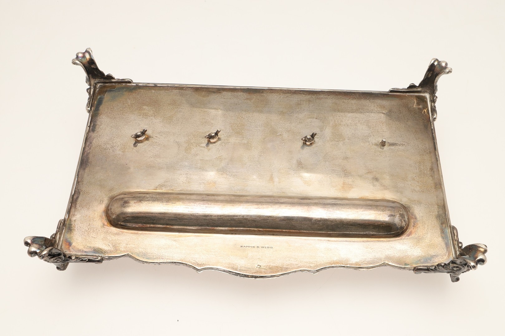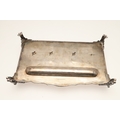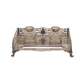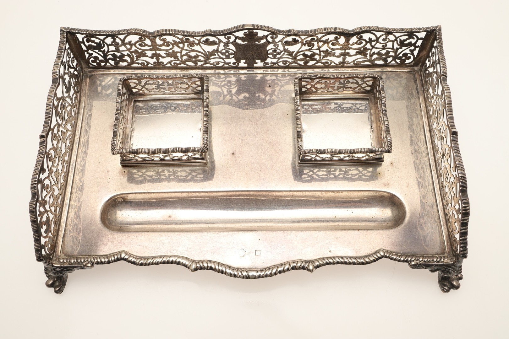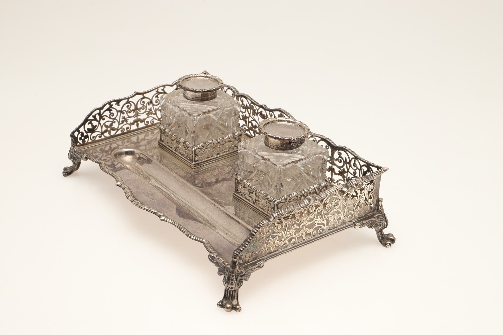 A LATE VICTORIAN SILVER INK STAND. Of rectangular form with shaped front, gadrooned edging and pierced foliate decorated ¾ gallery, twin cut glass silver hinge lid mounted ink bottles and raised on four out swept scroll cast feet. Hallmarked William Hutton & Sons Ltd, London 1896. Stand weight (excluding bottles) 24.8ozt. Height 7.5cm x Width 27cm x Depth 18cm.