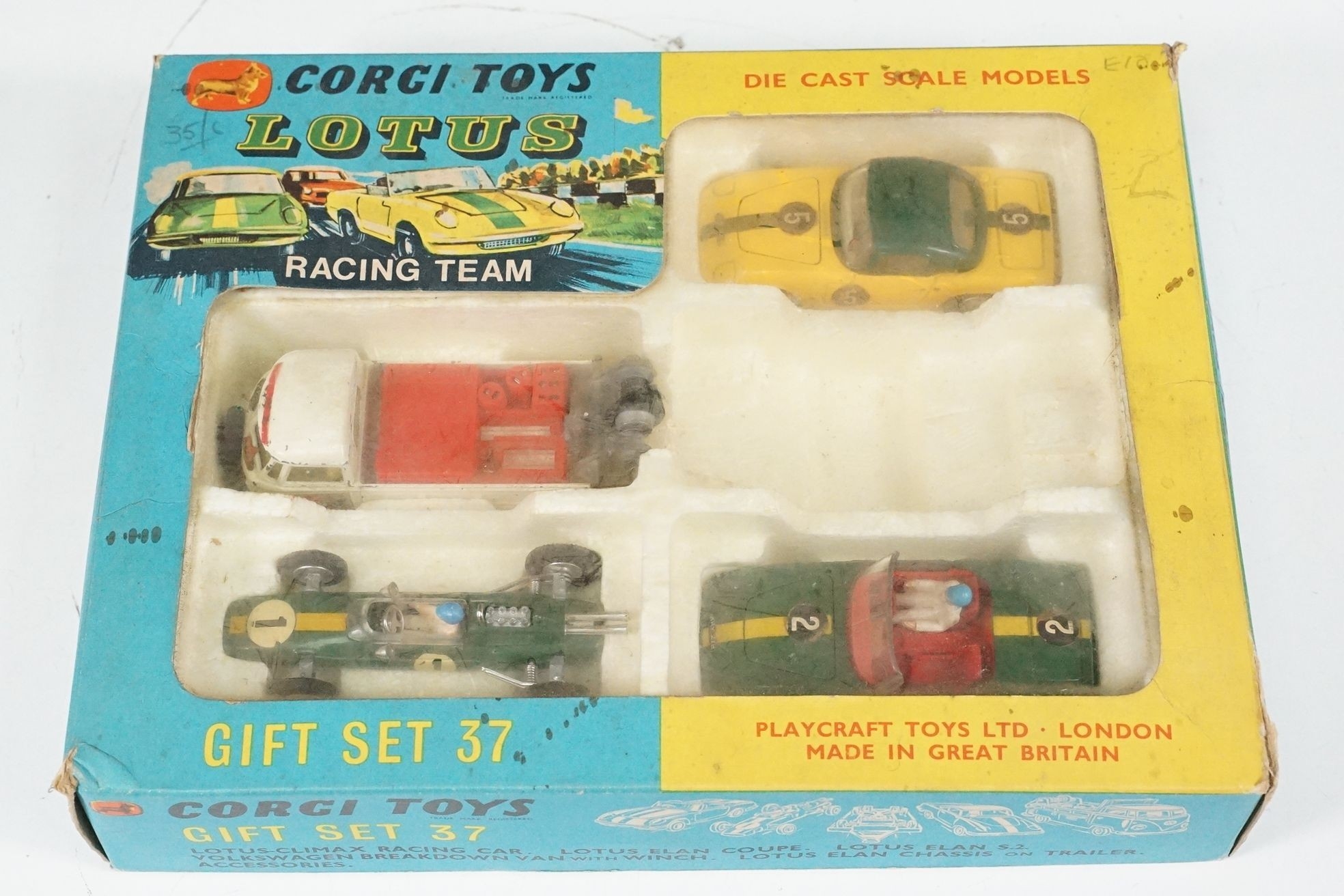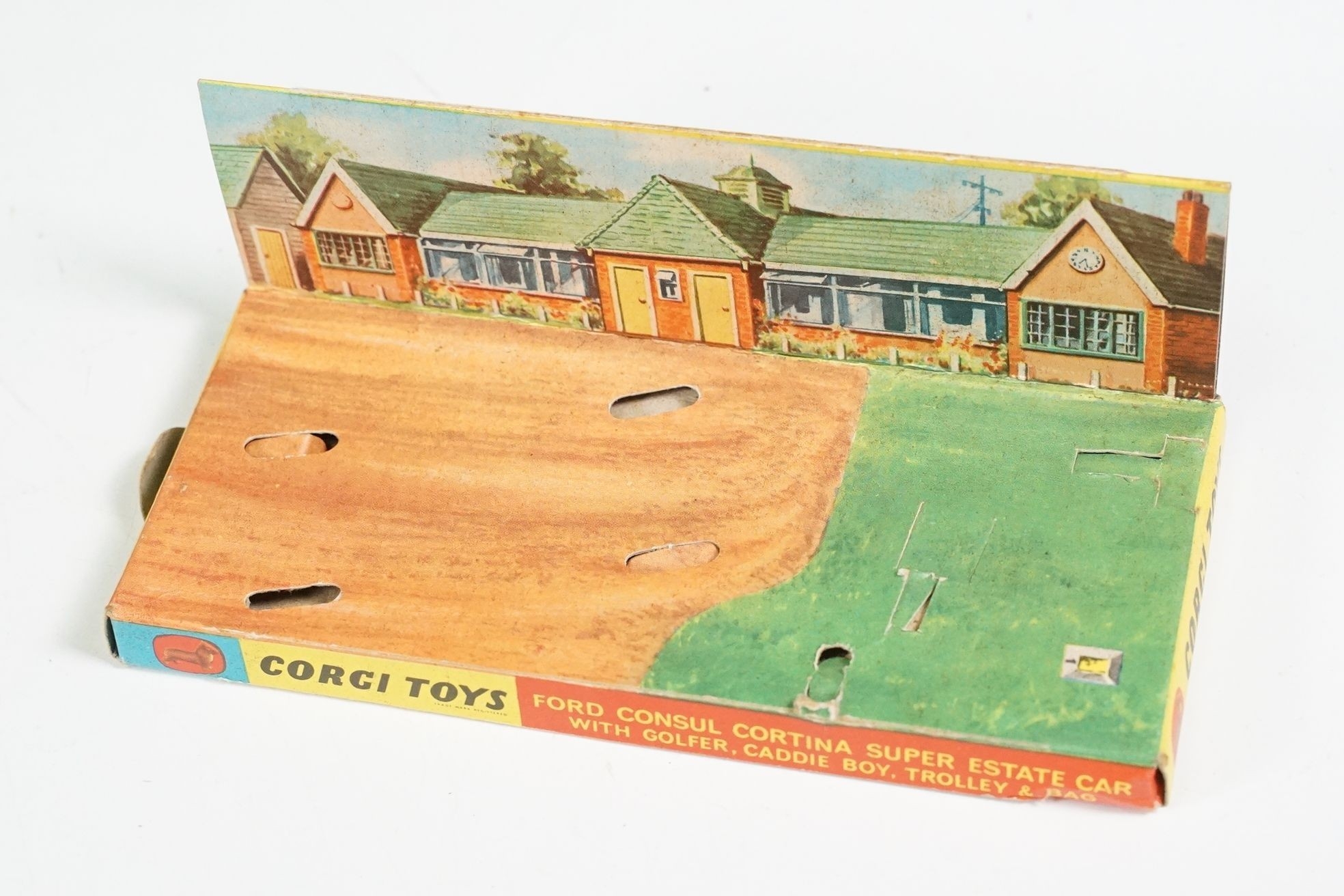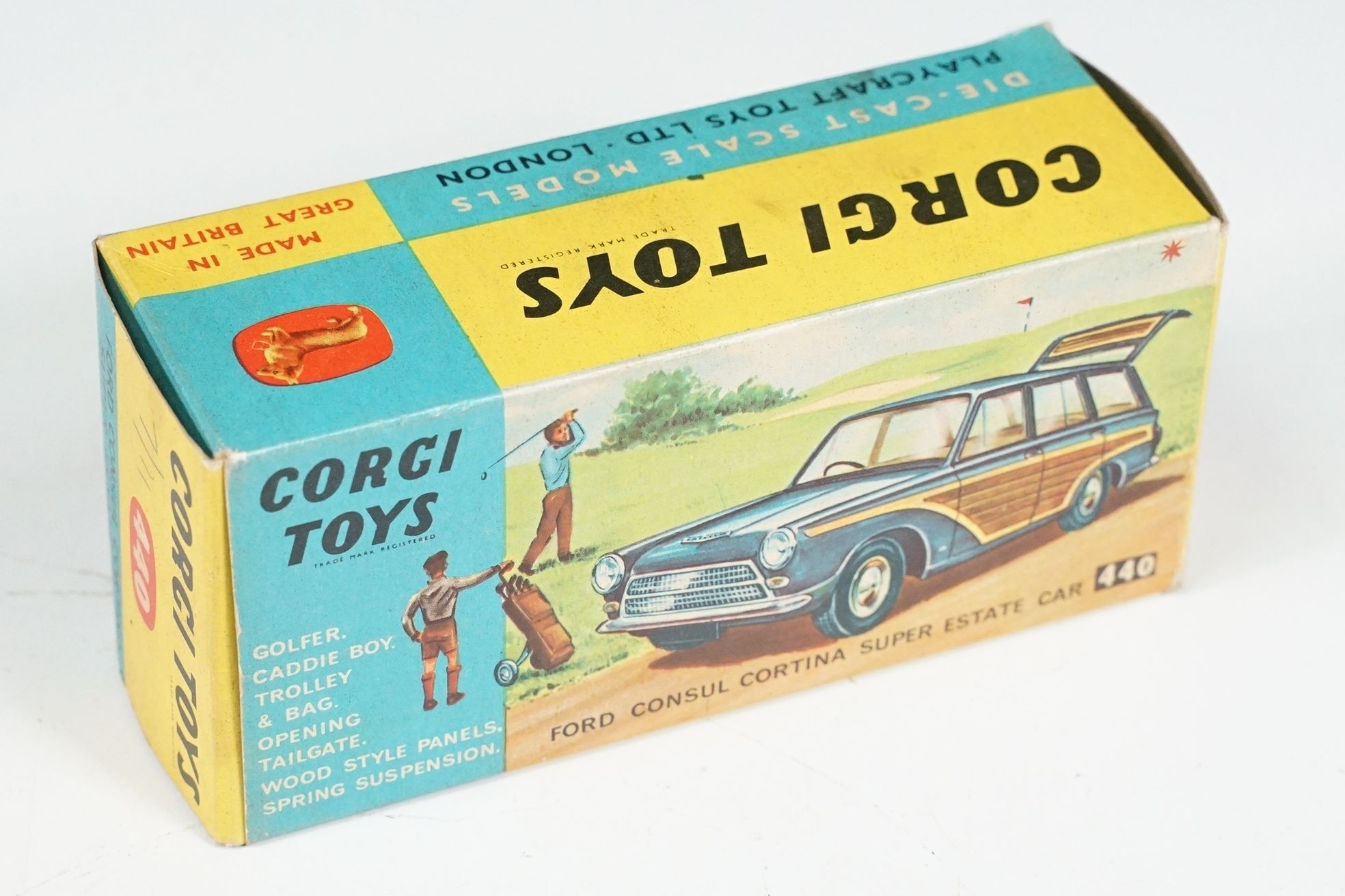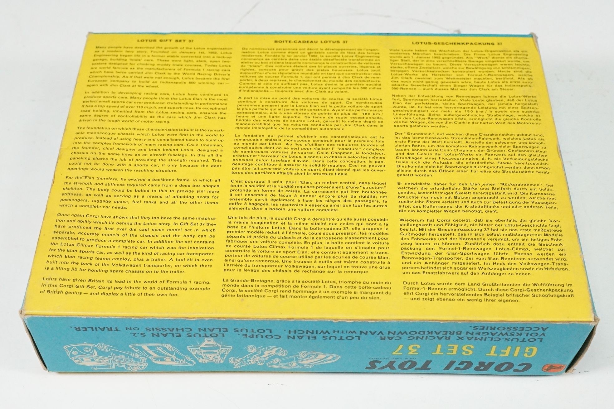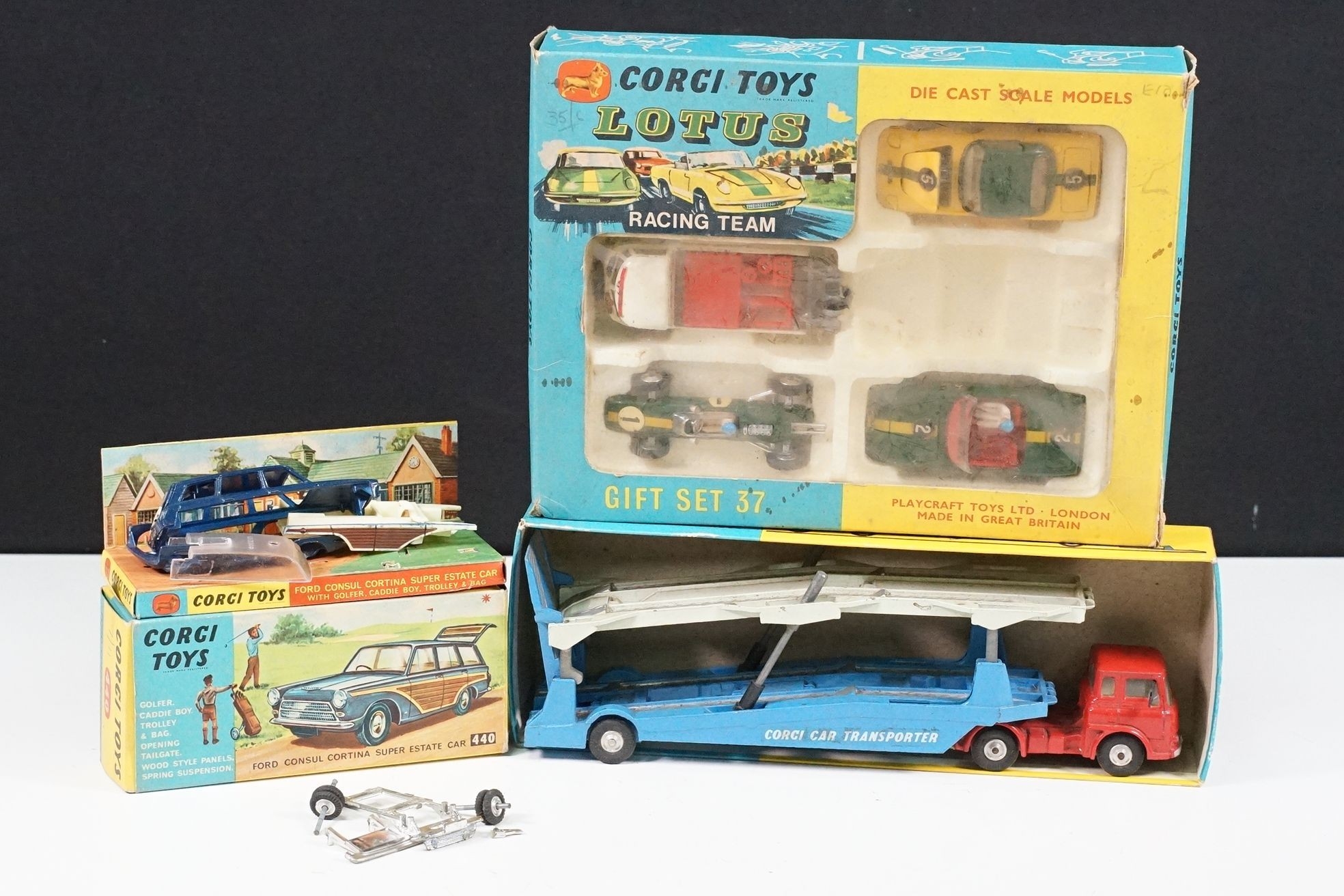 Boxed Corgi Gift Set No 37 diecast model set (missing trailer, diecast showing play worn but gd overall, fair-gd box) plus a Corgi 440 Ford Consul Cortina Super Estate Car box with model in parts (with inner display stand) and a Corgi 1105 Carrimore Car Transporter with box lid (grubby with paint chips) (3 items)