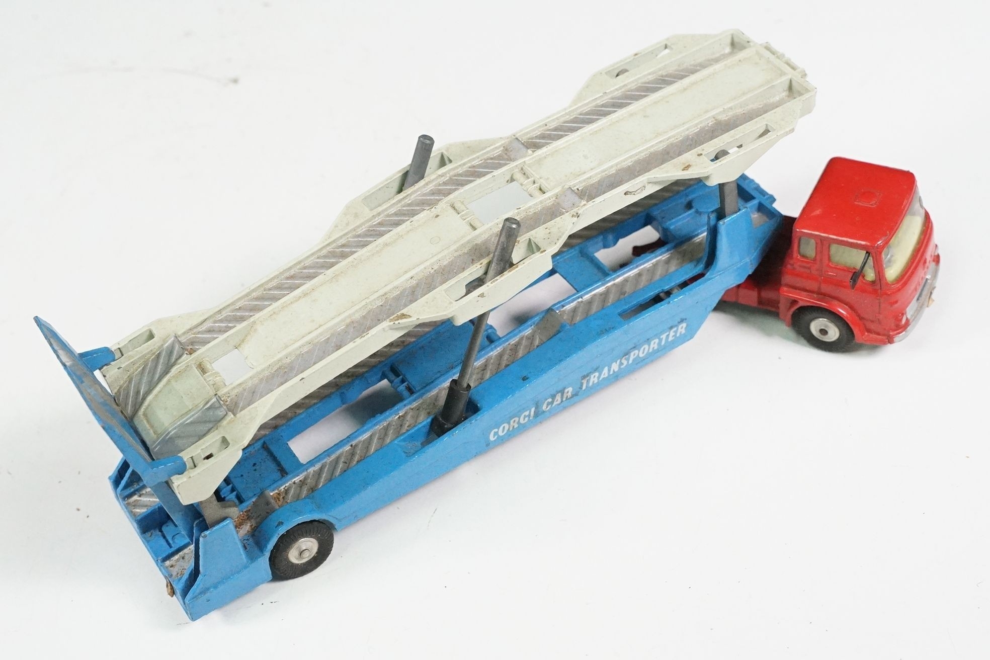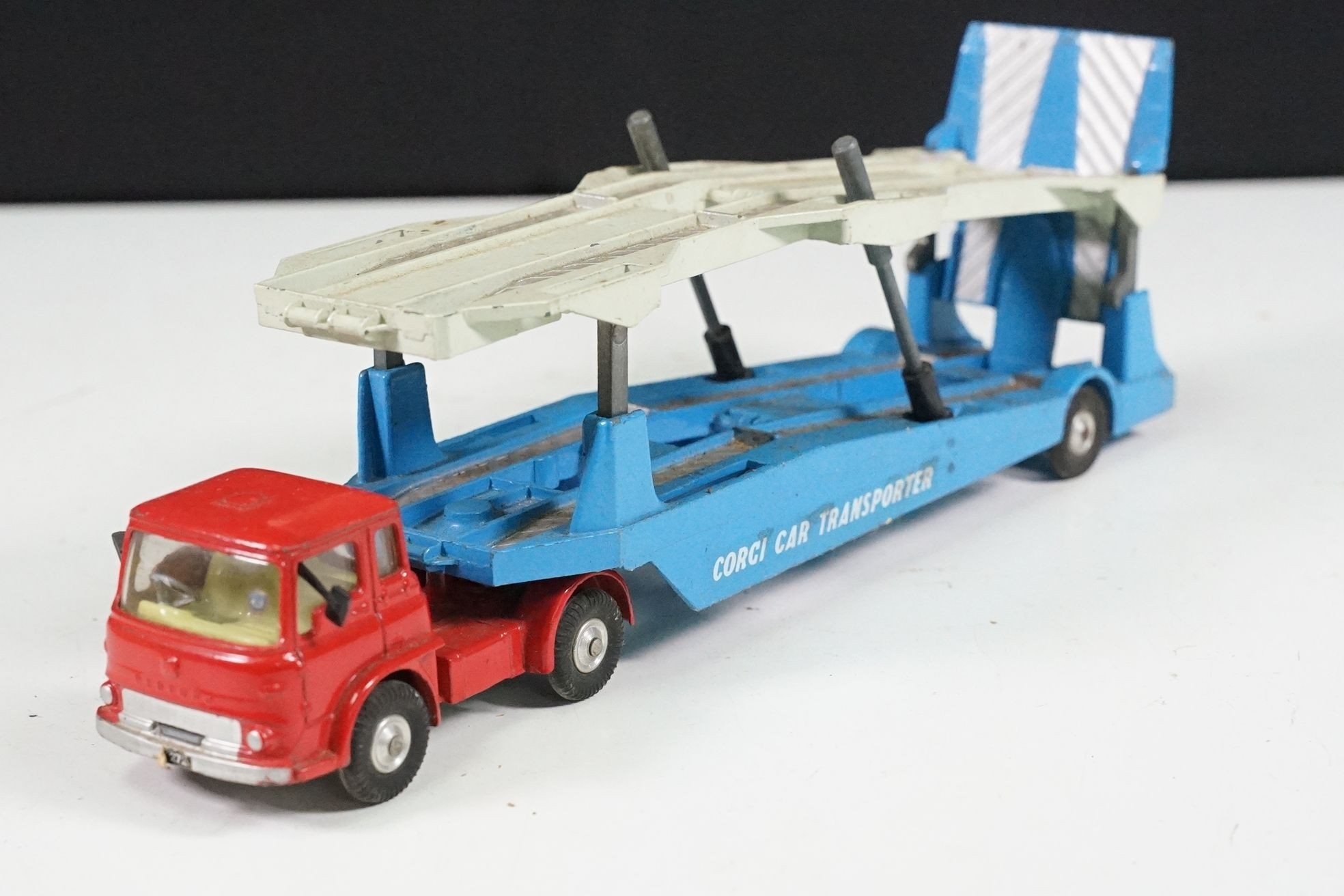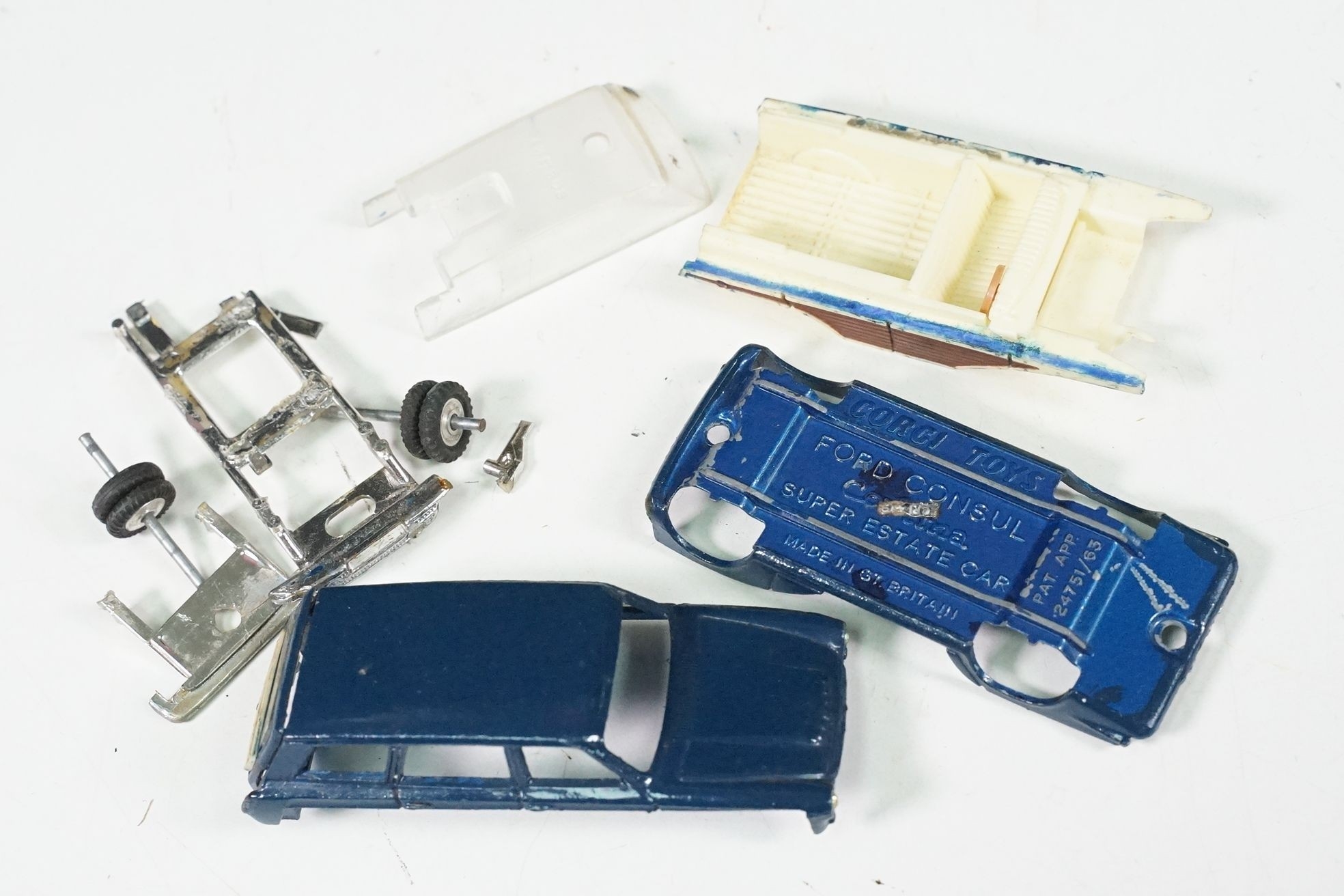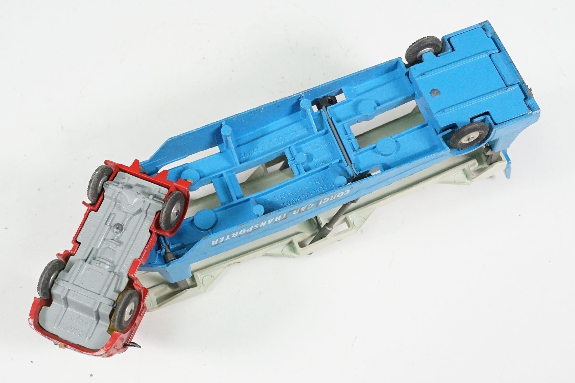 Boxed Corgi Gift Set No 37 diecast model set (missing trailer, diecast showing play worn but gd overall, fair-gd box) plus a Corgi 440 Ford Consul Cortina Super Estate Car box with model in parts (with inner display stand) and a Corgi 1105 Carrimore Car Transporter with box lid (grubby with paint chips) (3 items)