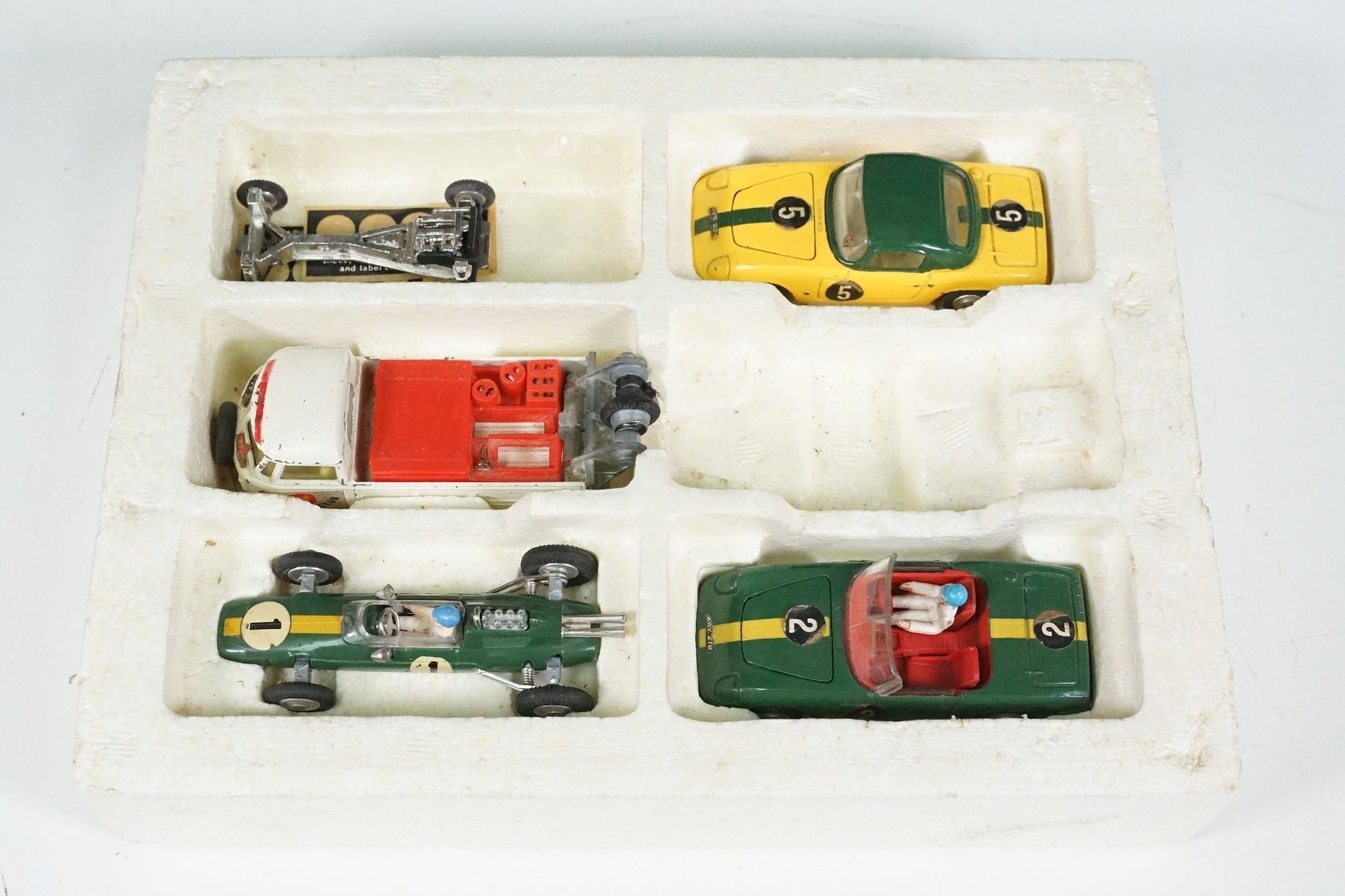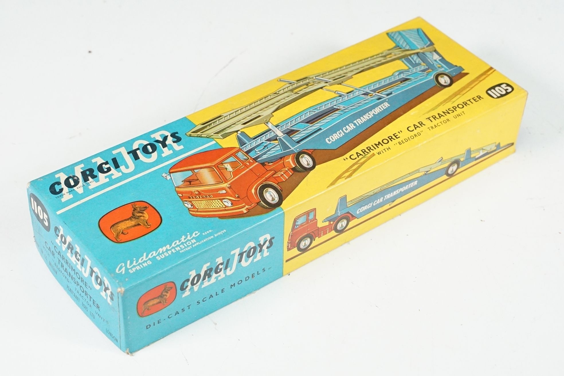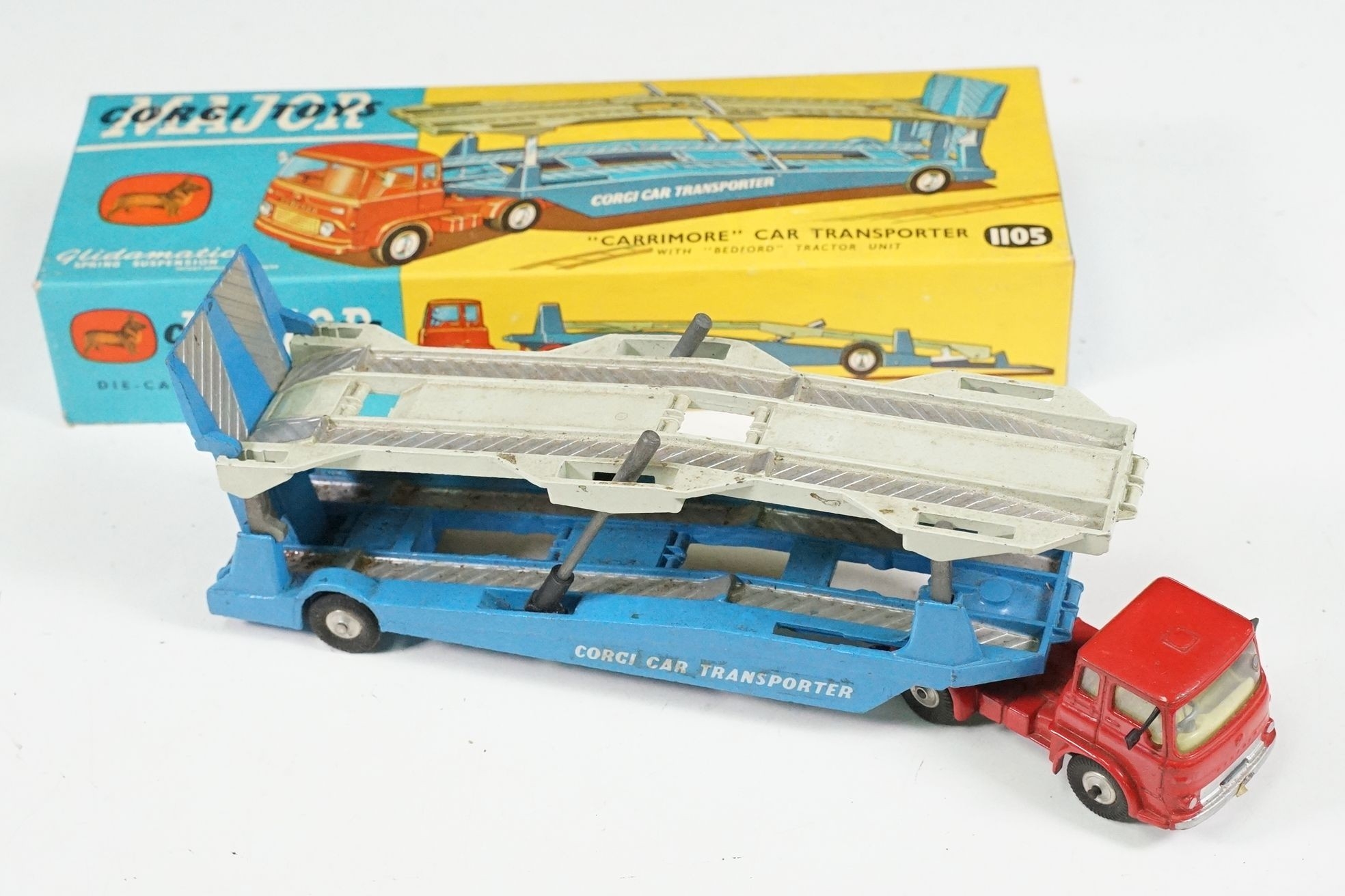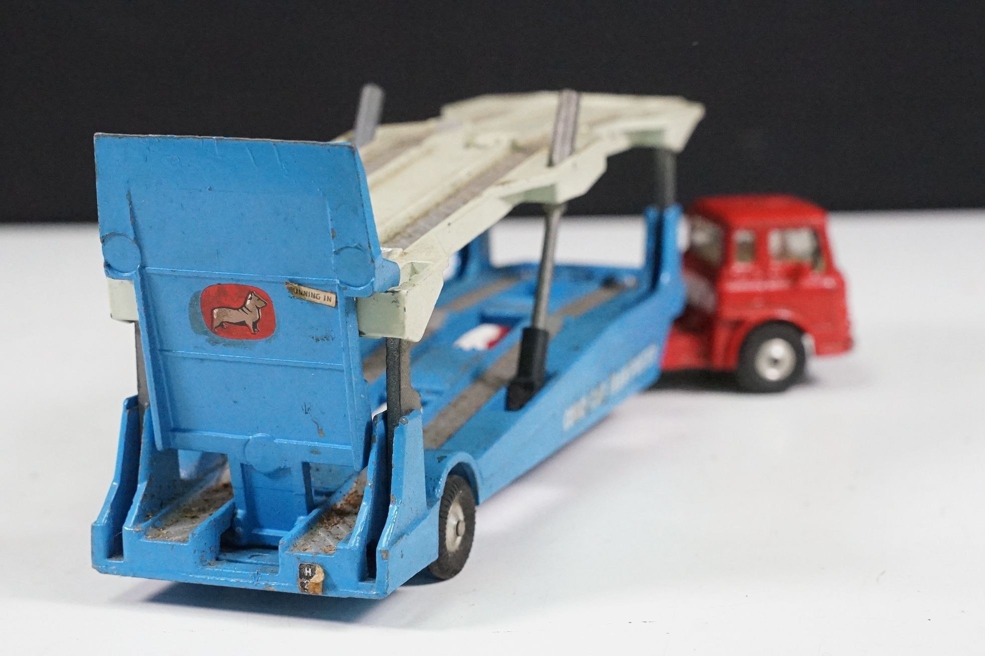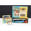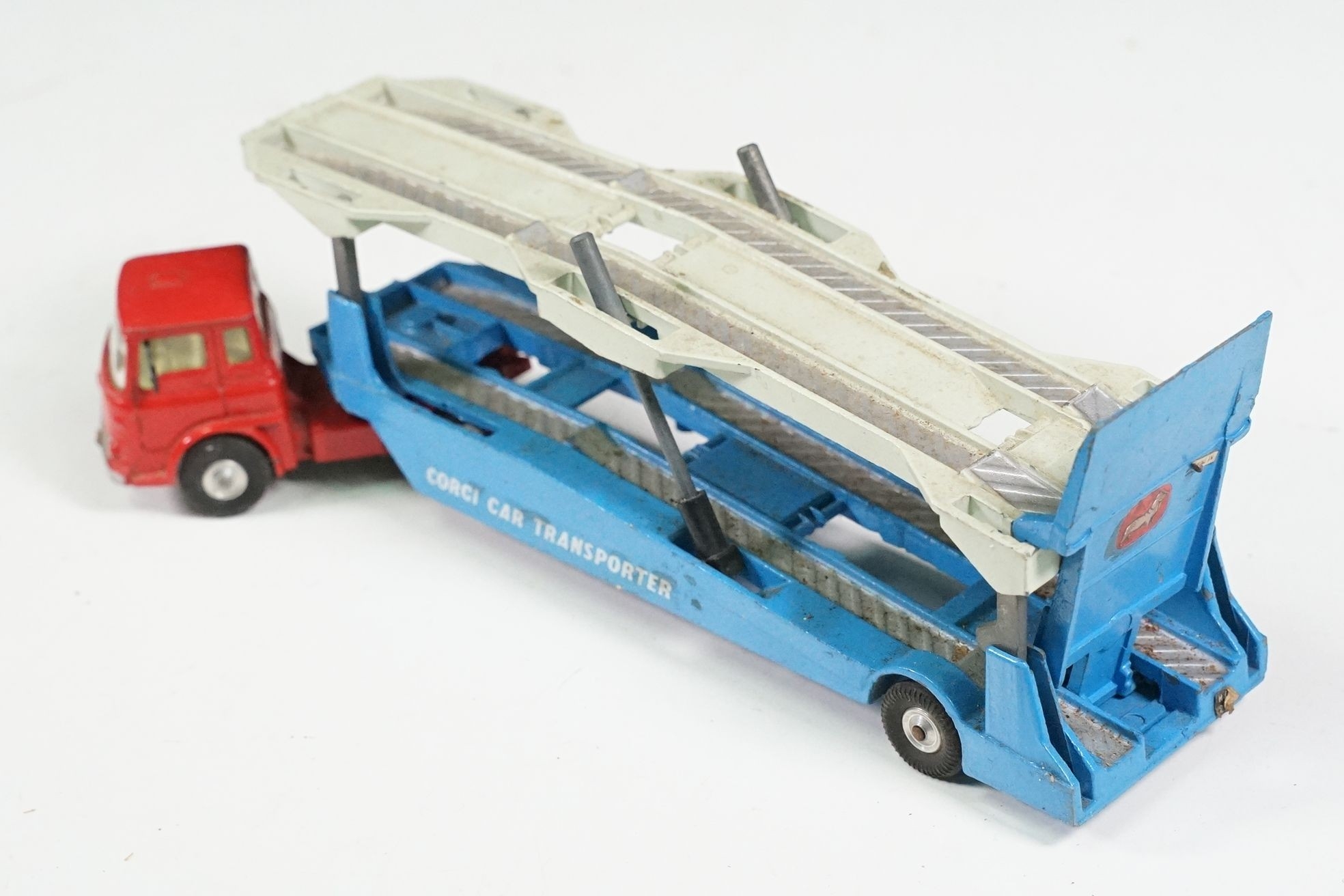 Boxed Corgi Gift Set No 37 diecast model set (missing trailer, diecast showing play worn but gd overall, fair-gd box) plus a Corgi 440 Ford Consul Cortina Super Estate Car box with model in parts (with inner display stand) and a Corgi 1105 Carrimore Car Transporter with box lid (grubby with paint chips) (3 items)