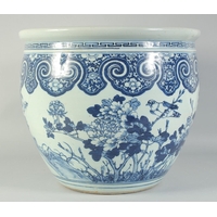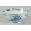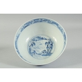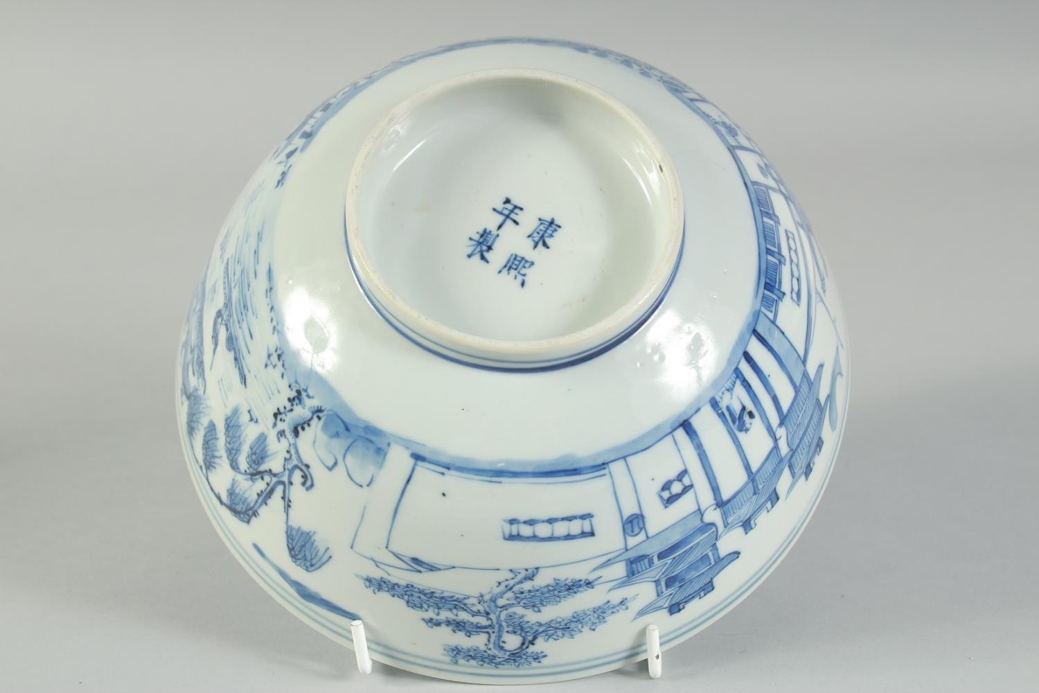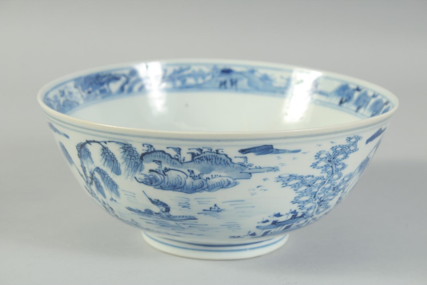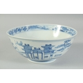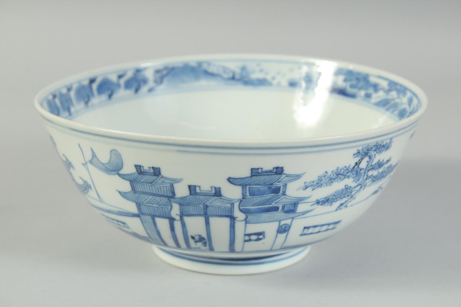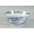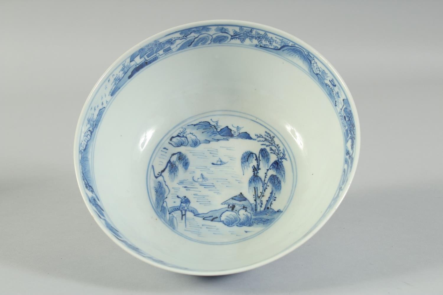AN EARLY 20TH CENTURY CHINESE BLUE AND WHITE PORCELAIN BOWL, painted with landscape scenes, with four-character mark to base, 20cm diameter.