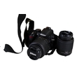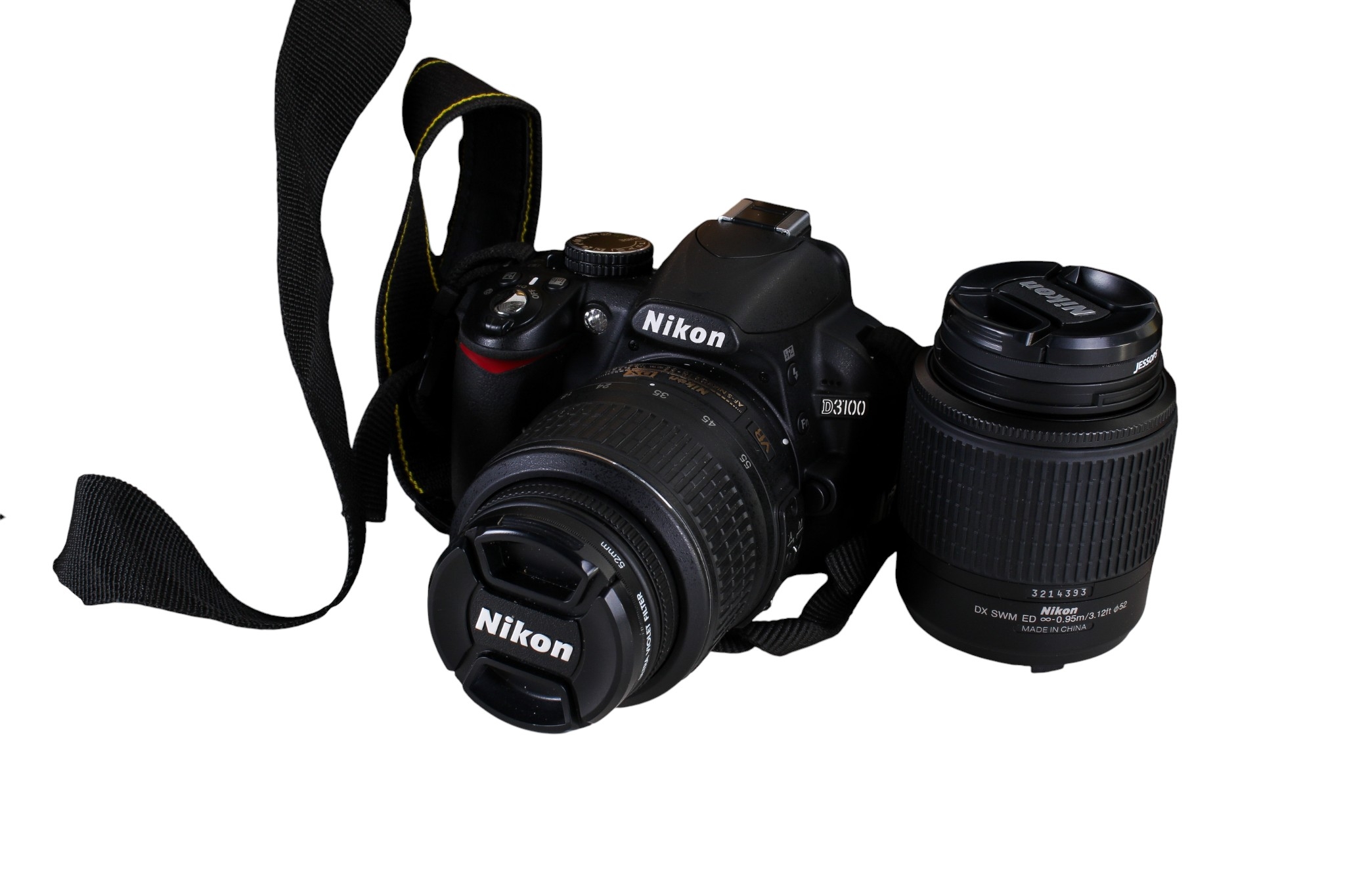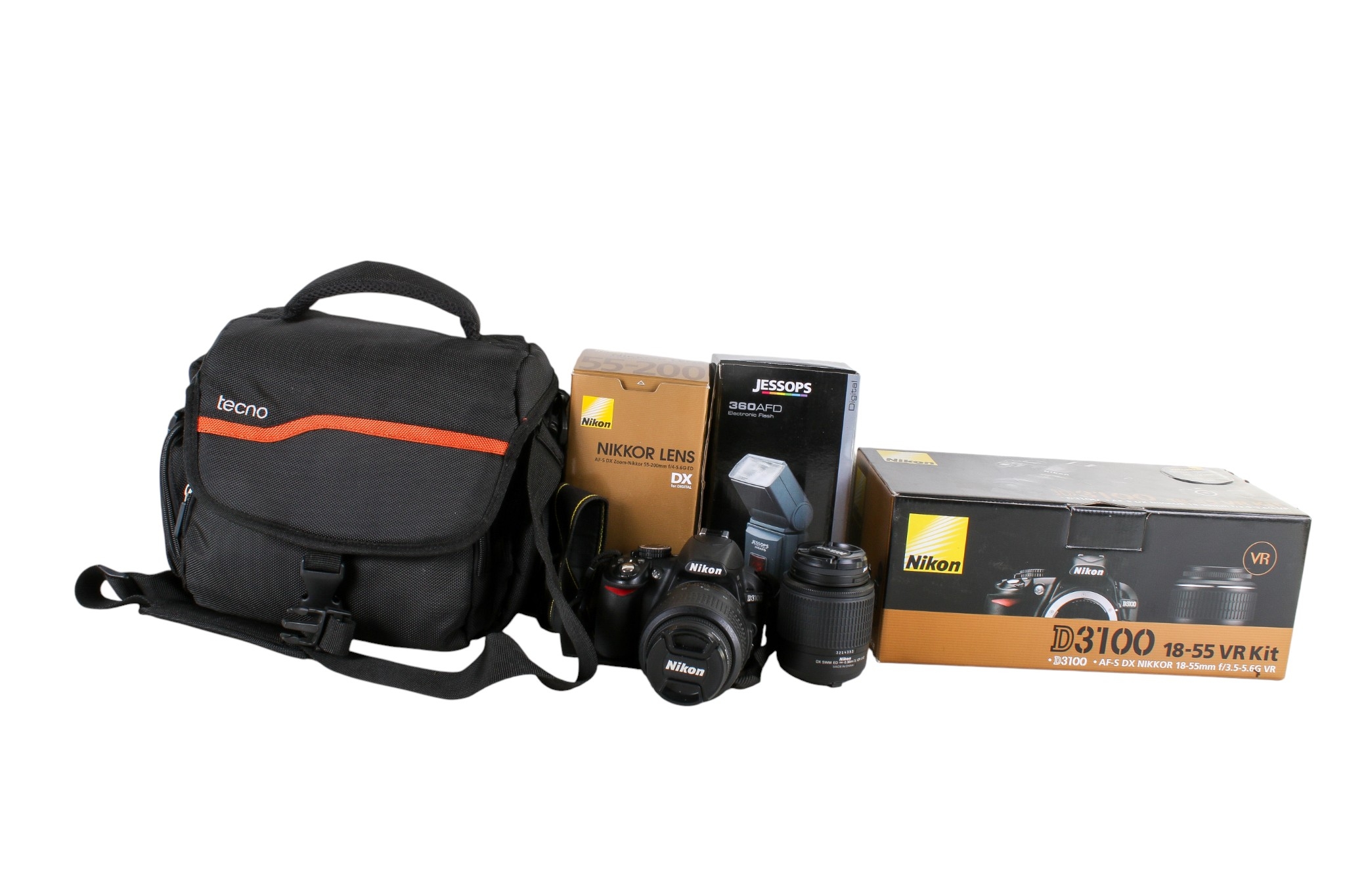 A Nikon D3100 digital camera outfit. S/n 7235290, with Nikon DX AF-S Nikkor 18-55mm 1:3.5-5.6G lens; Nikkor 55-200mm 1.4-5.6G ED lens with caps and lens hood, Tecno bag, etc.