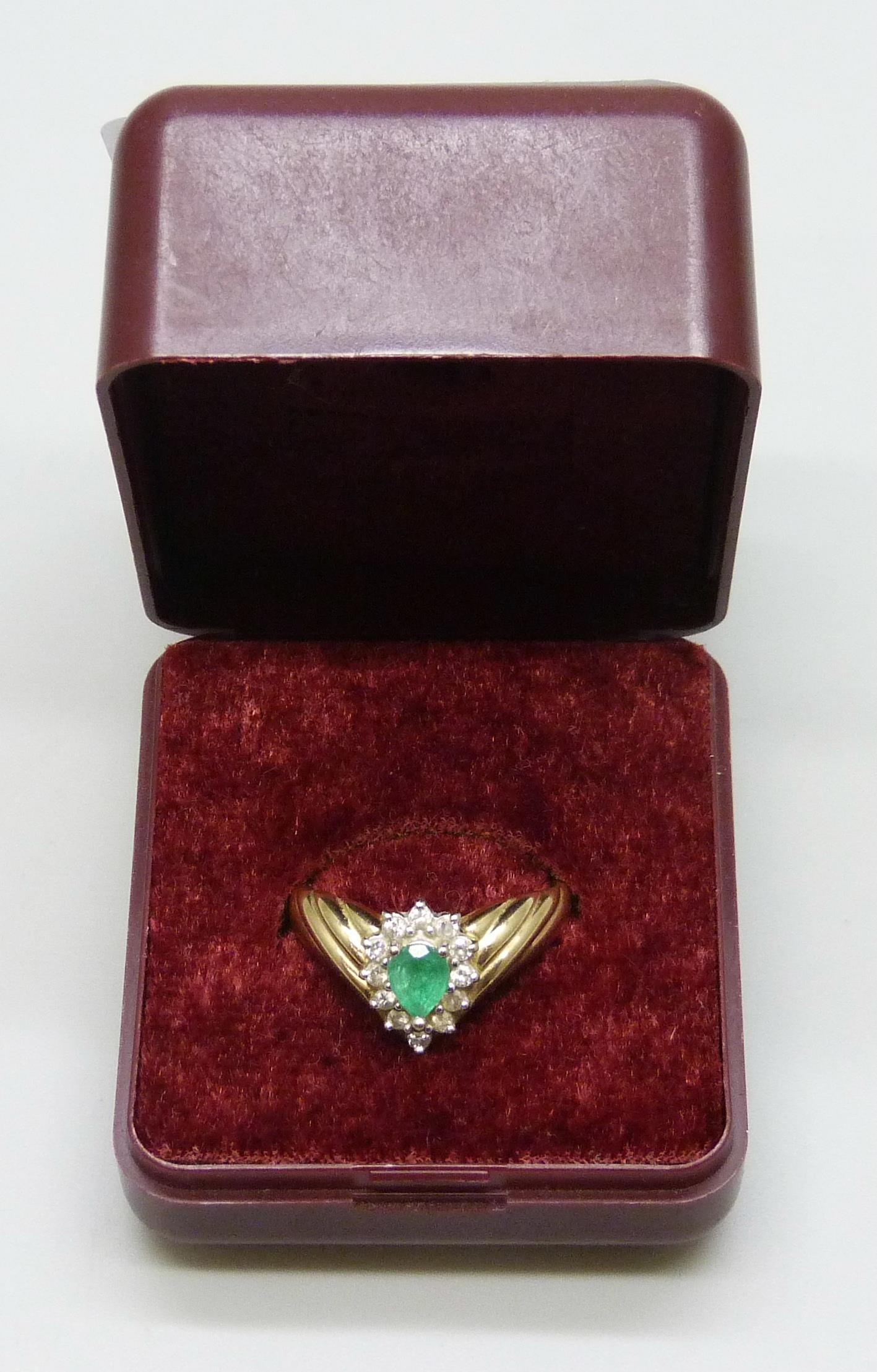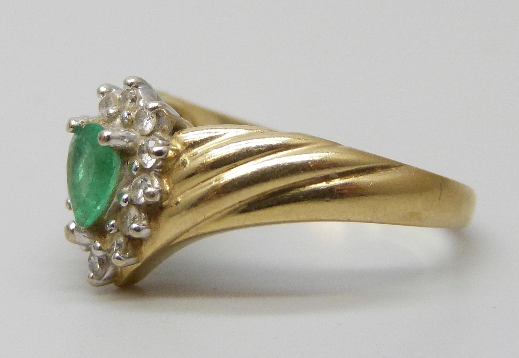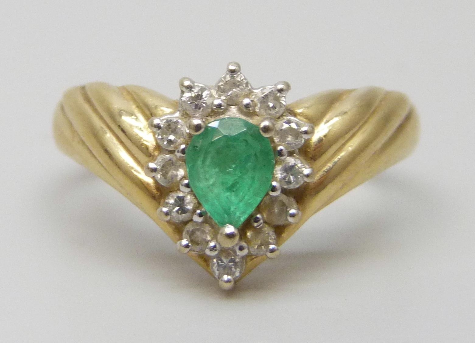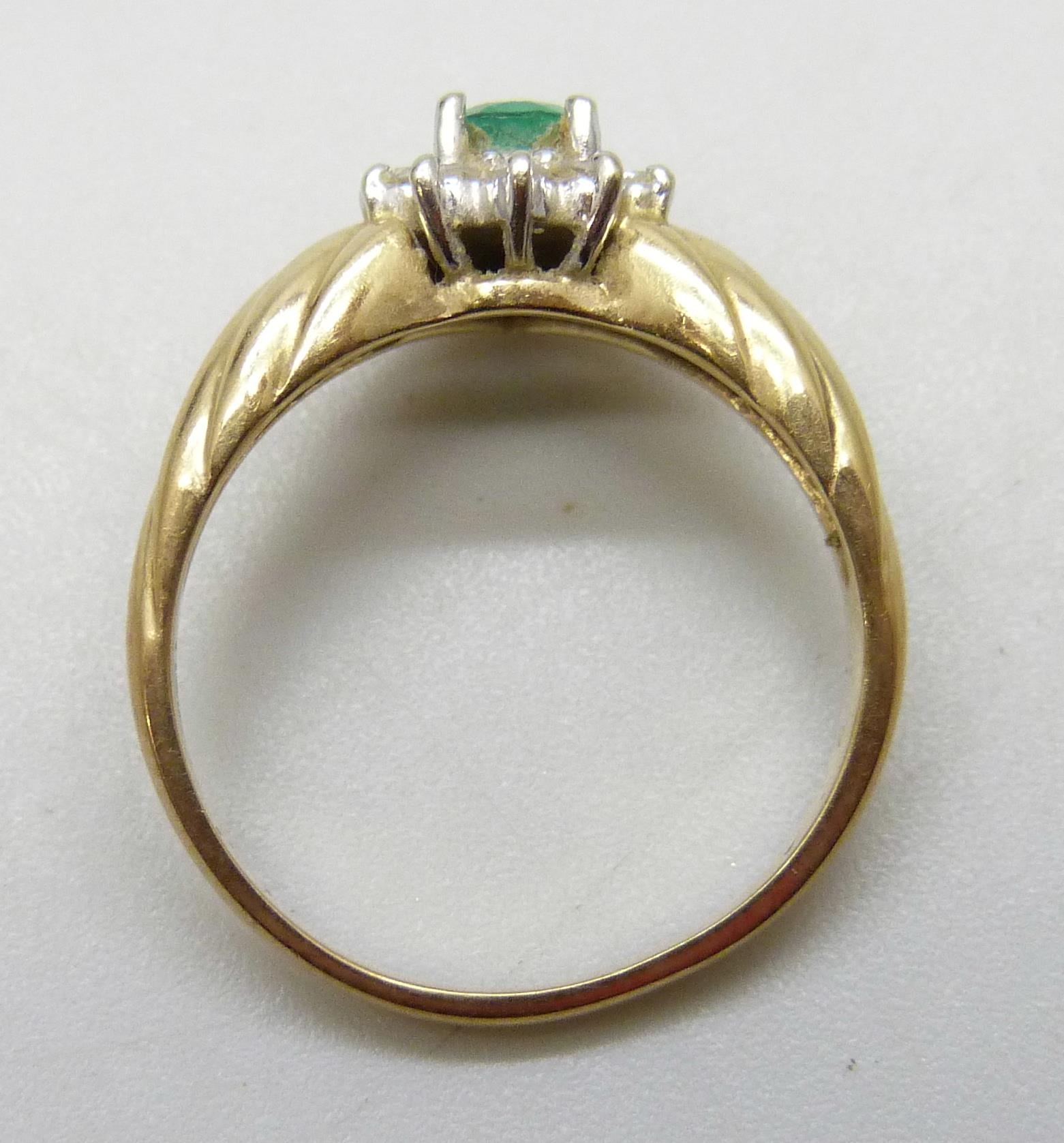 A 14k gold, emerald and diamond cluster ring, 3.4g, M
