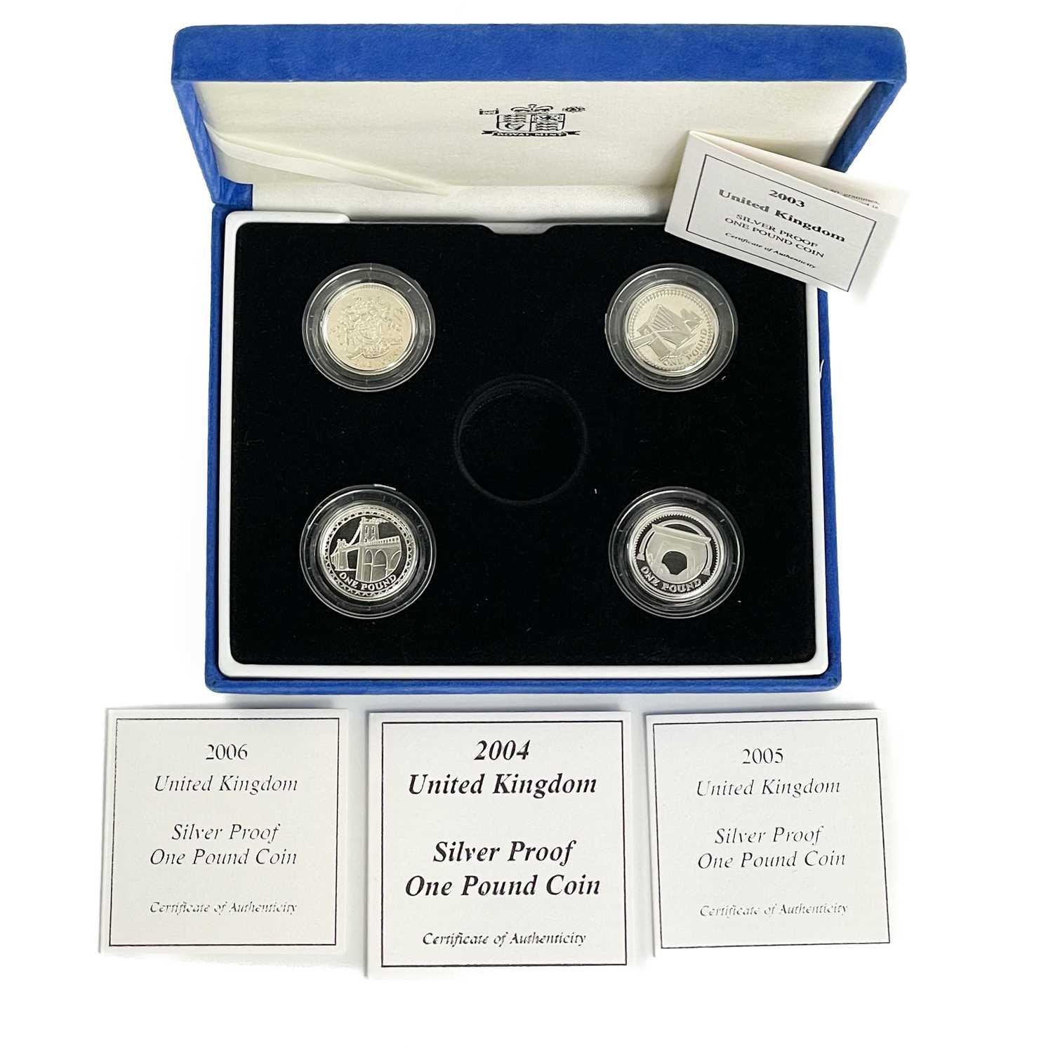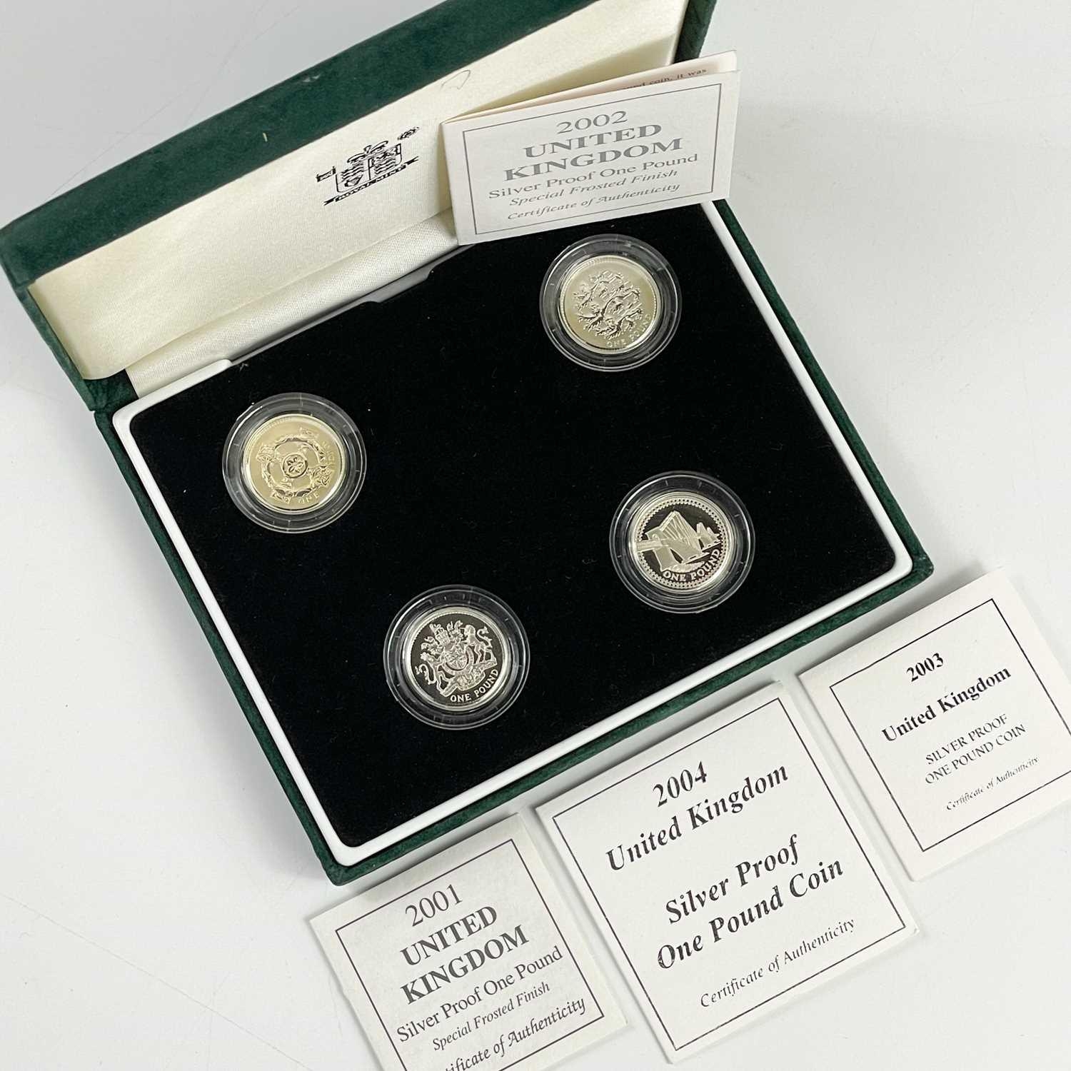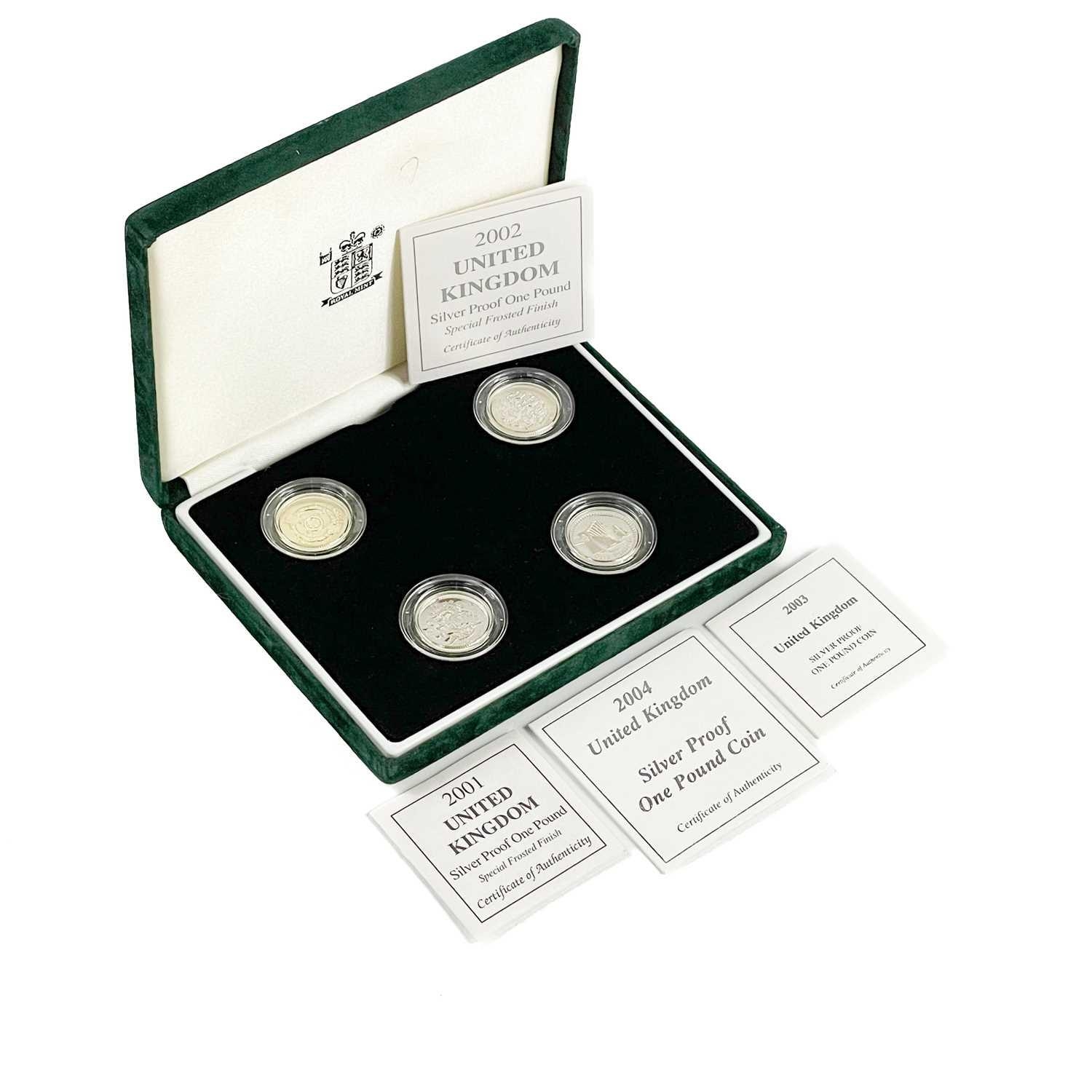 UK Silver Proof 2001 to 2004 and 2003 to 2006 £1 coins in Royal Mint Boxes. Comprising: 2001 to 2006 proof £1 coins, together with additional 2003 and 2004 examples all contained in 2x4 coin Royal Mint boxes. All have Certificates of Authenticity. Total of 8 coins.