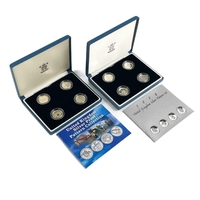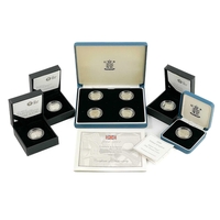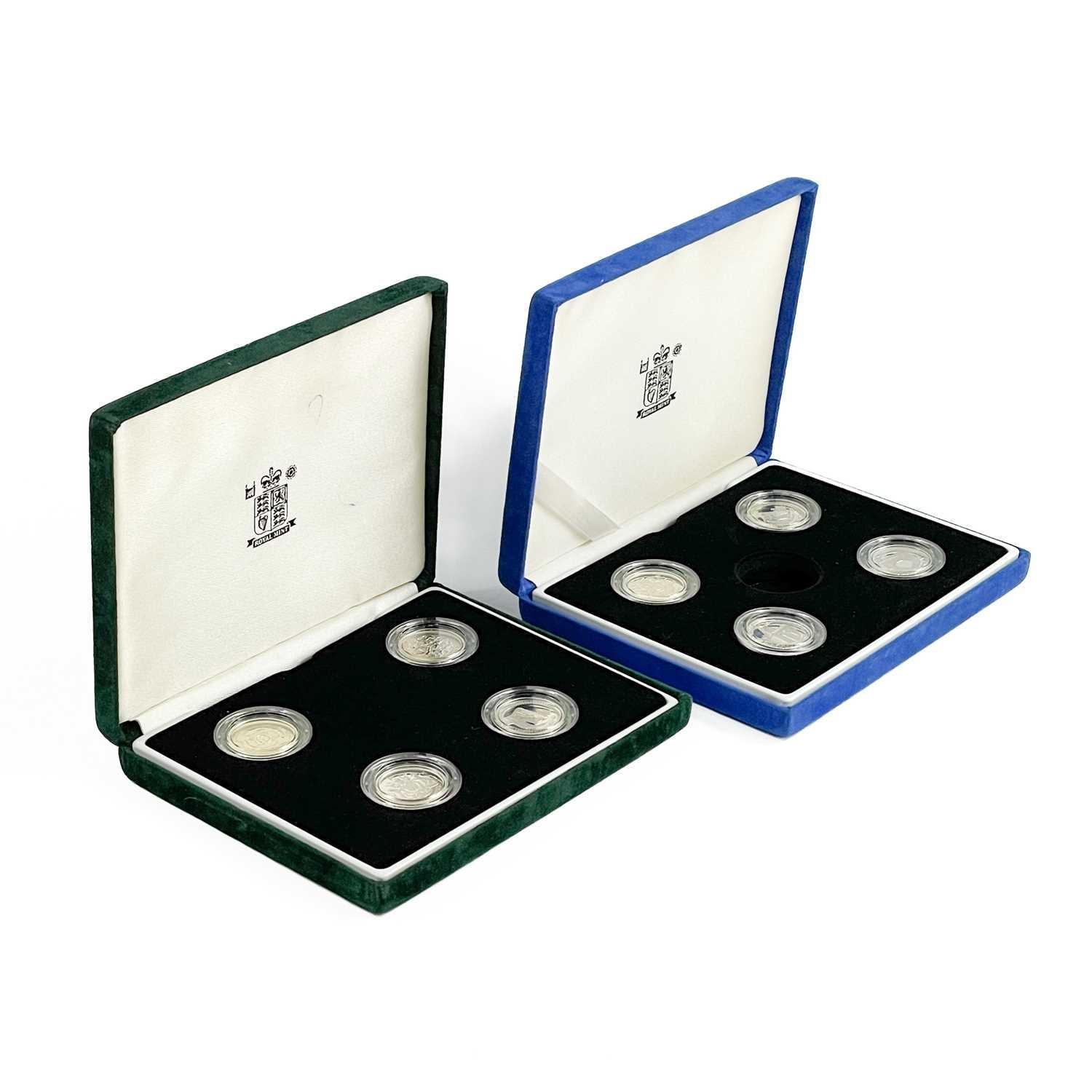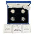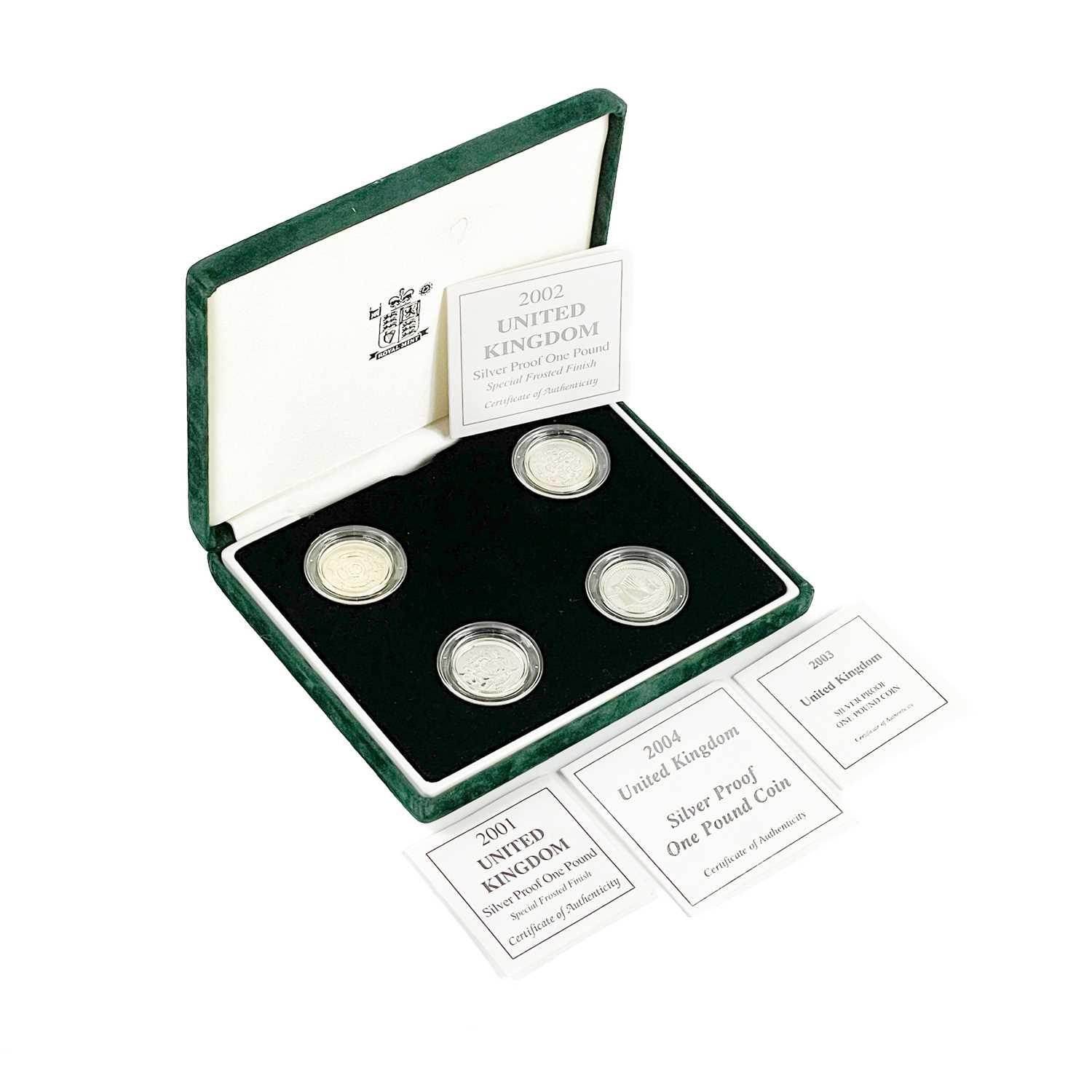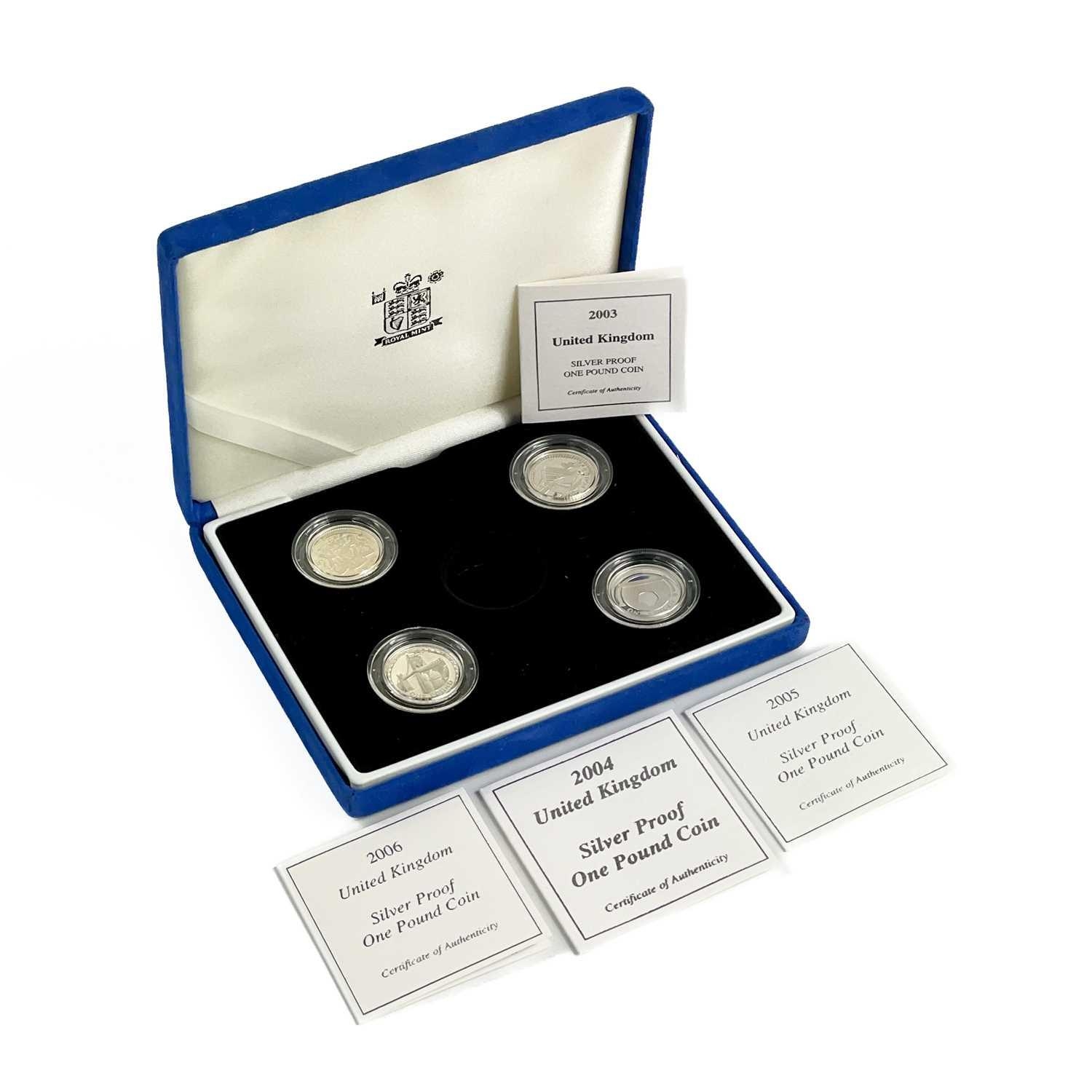 UK Silver Proof 2001 to 2004 and 2003 to 2006 £1 coins in Royal Mint Boxes. Comprising: 2001 to 2006 proof £1 coins, together with additional 2003 and 2004 examples all contained in 2x4 coin Royal Mint boxes. All have Certificates of Authenticity. Total of 8 coins.