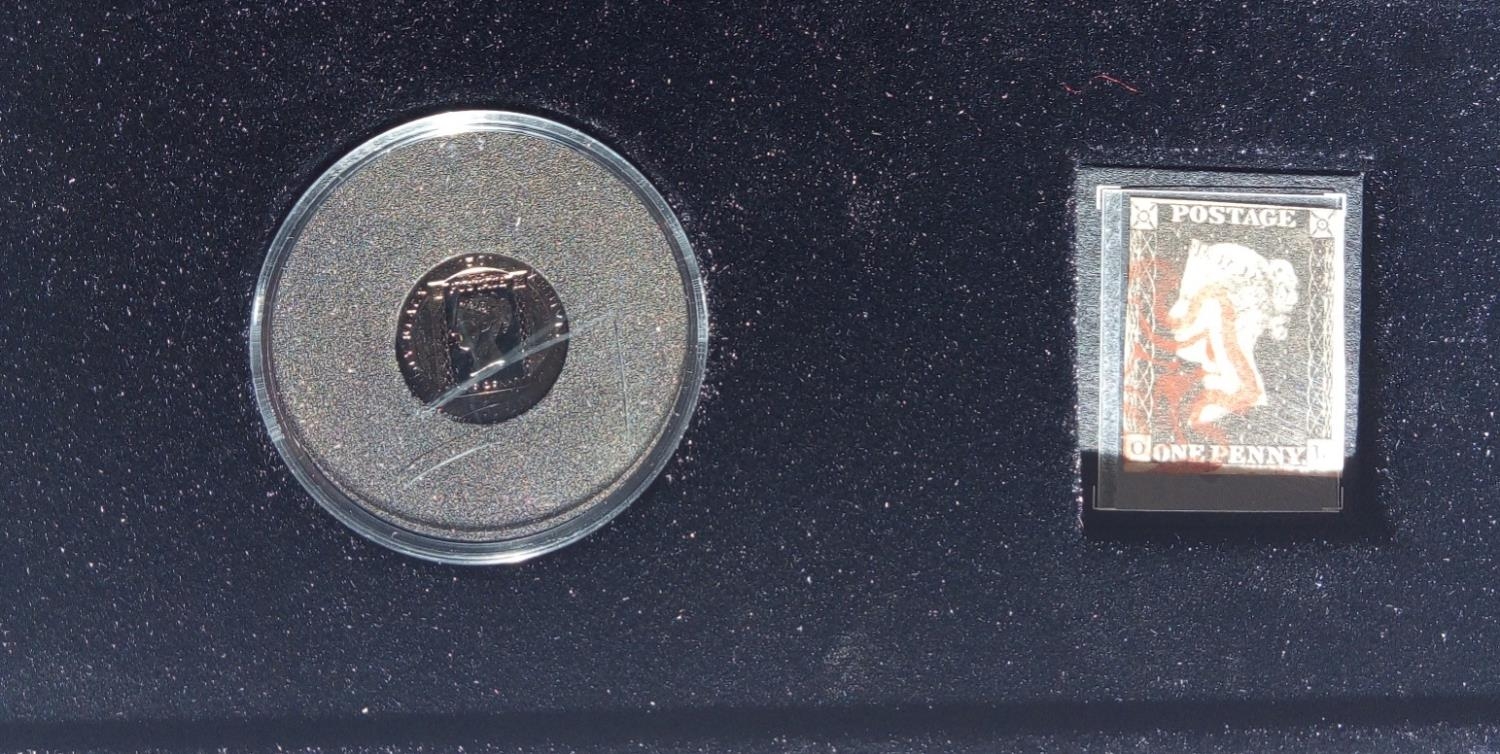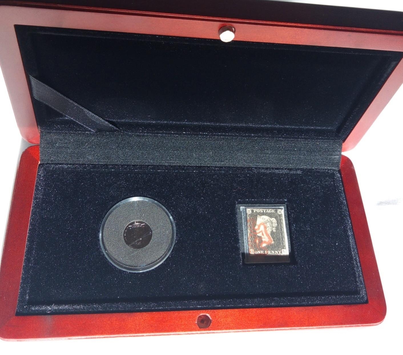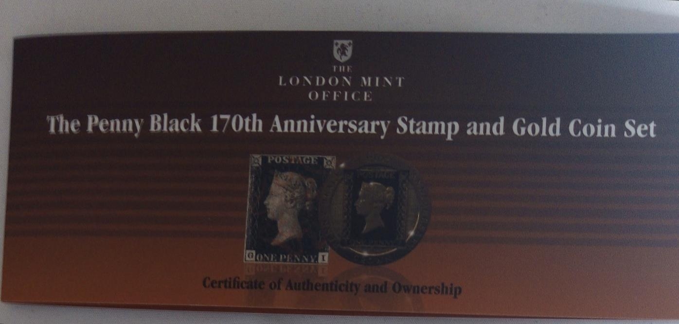 AN UNUSUAL 24CT PENNY BLACK GOLD COIN AND STAMP PROOF SET, THE PENNY BLACK 170TH ANNIVERSARY STAMP AND GOLD COIN SET