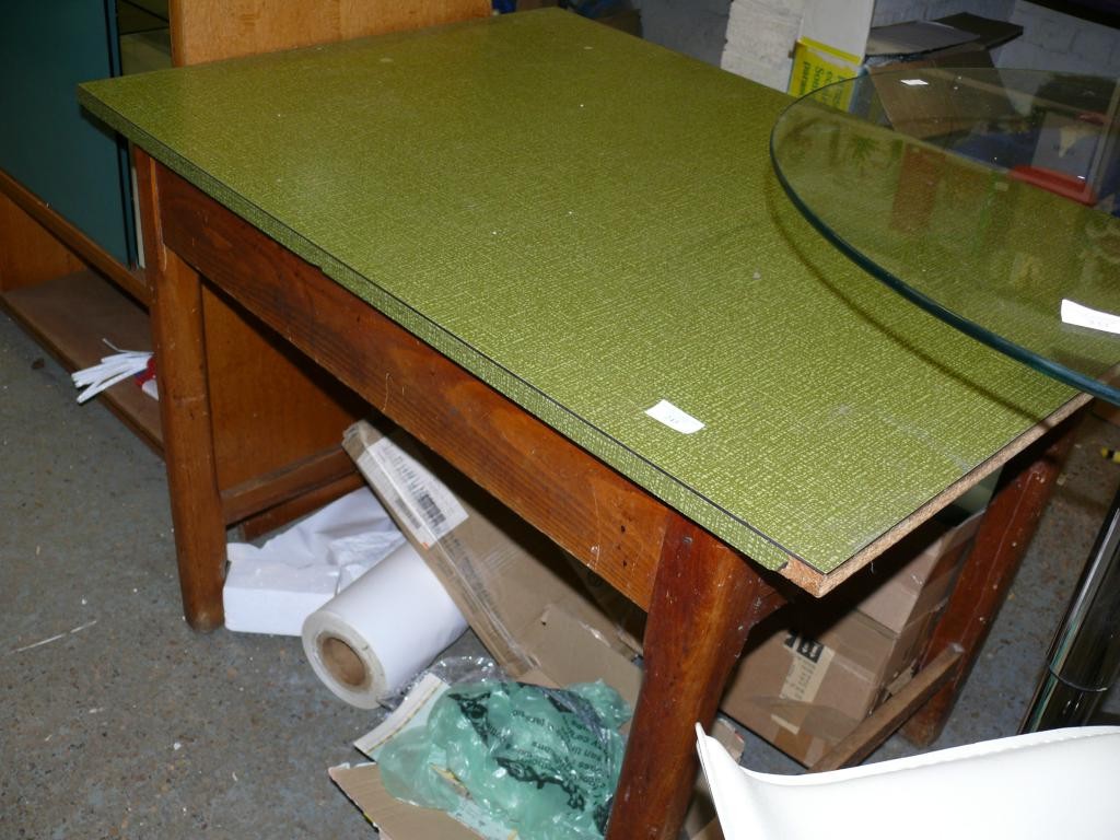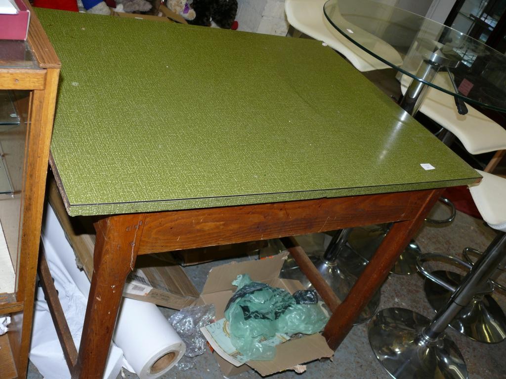 VINTAGE KITCHEN TABLE - NICELY MADE WITH CHAMFERED LEGS AND A DRAWER - GREEN RETRO FORMICA TOP