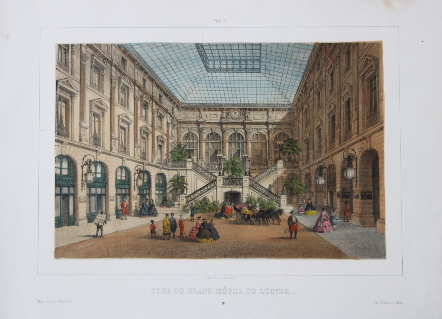 Charles Riviere - Cour du Grand Hotel du Louvre 1855. This rare coloured lithograph is from Paris Moderne, Grand Album. Representant les Vues et les Monuments les plus curieux de Paris et les Sites les plus remarquables des Environs. Published by Maison Martinet, Paris and printed by Godard, Paris 1855.