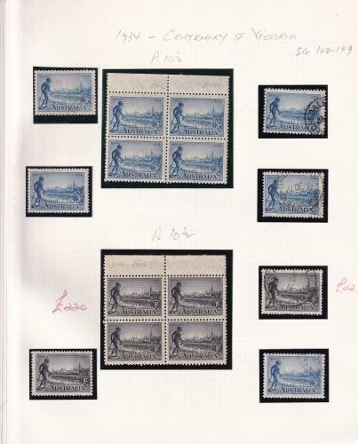 1934 CENTENARY OF VICTORIA. 2d John ash imprint block of 4. p.11½, block of 4 p11½, 3d, 1/- block of 4 p10½, 2d single (4) 3d singles (5) 1/- singles (2) mainly mint.