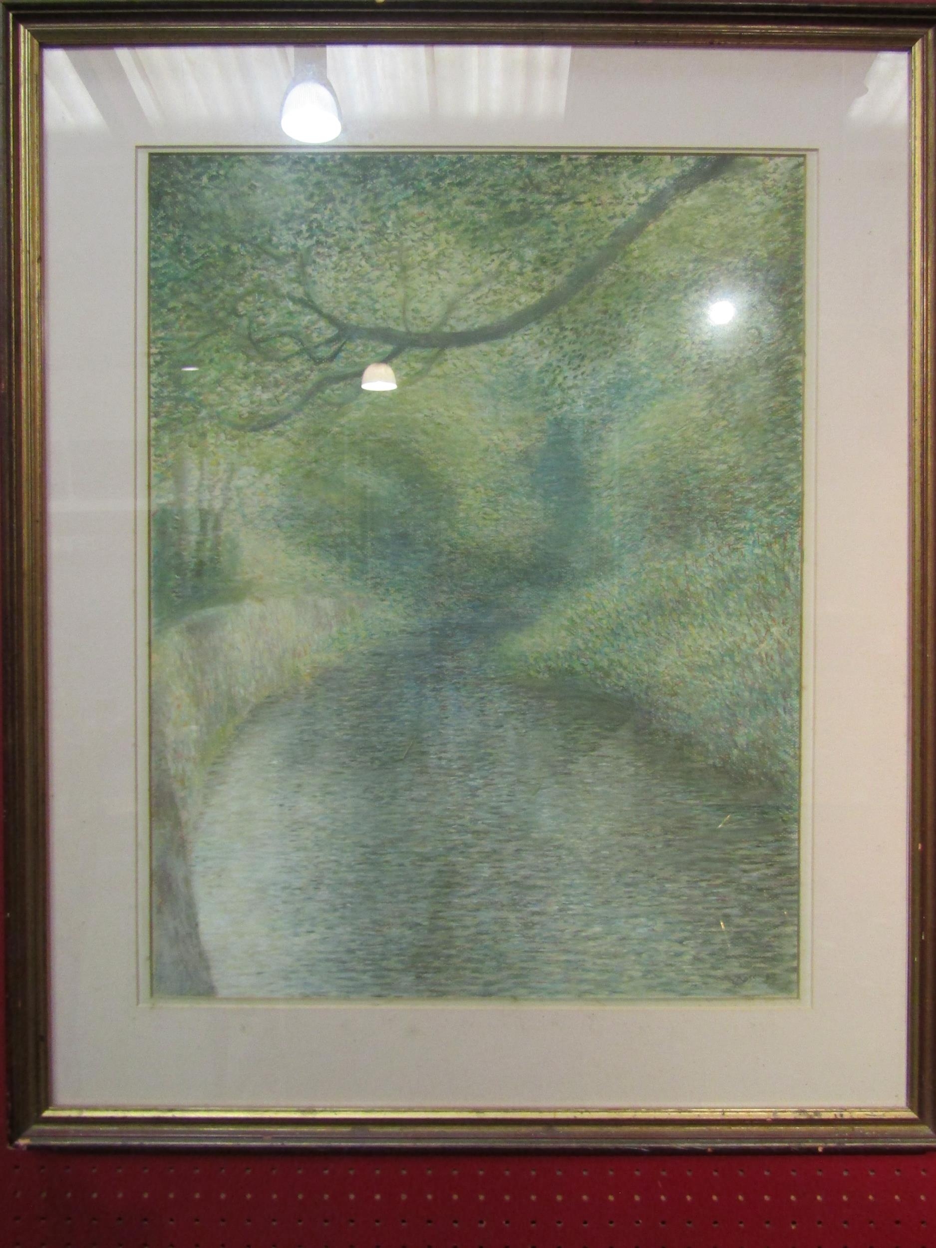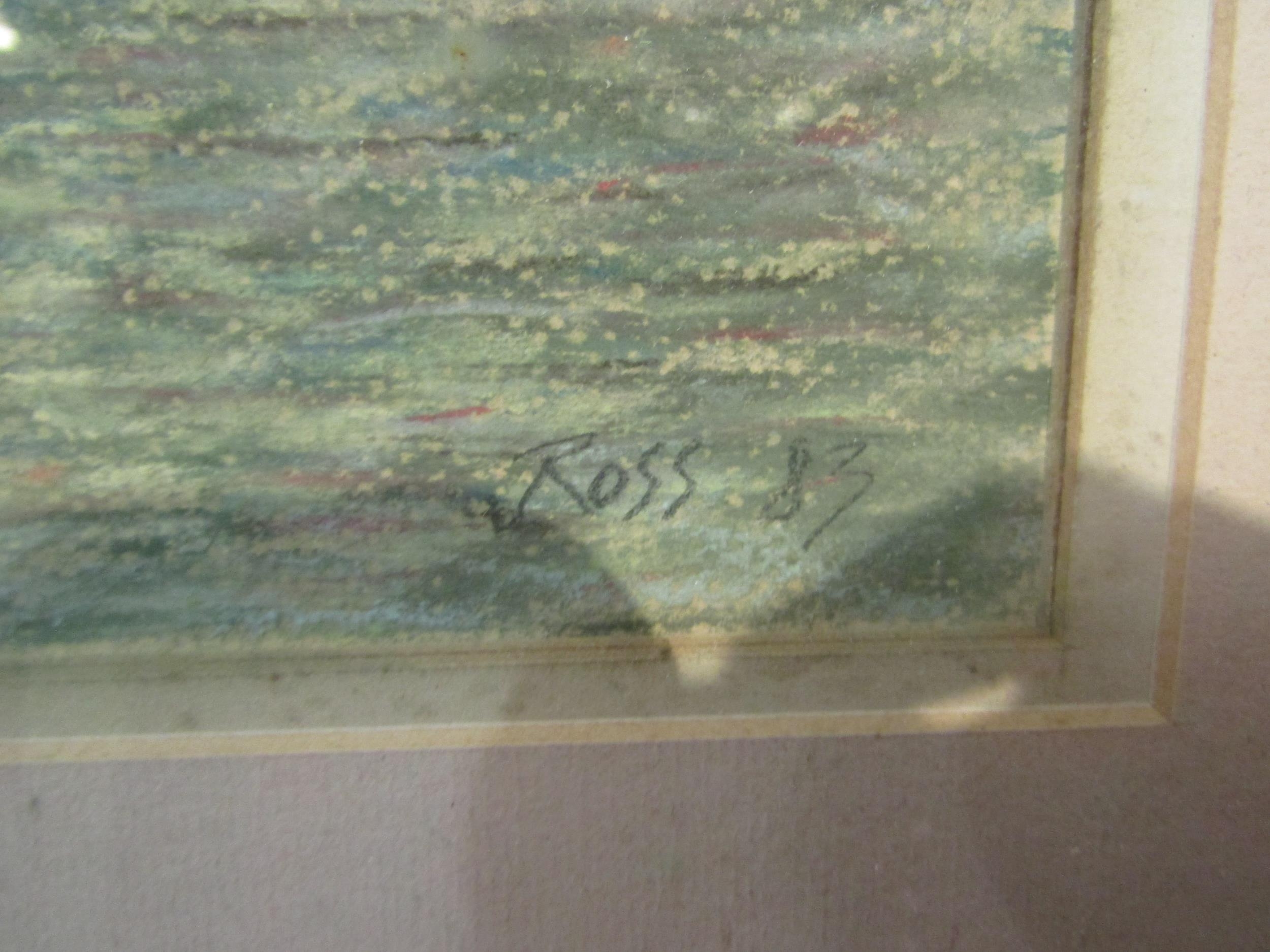 ROSS: A pastel depicting impressionist image of a stream flanked by trees, signed lower right and dated '83, framed and glazed, 59cm x 45cm image size (R) £20