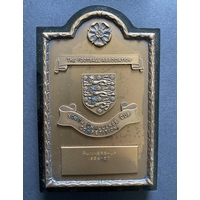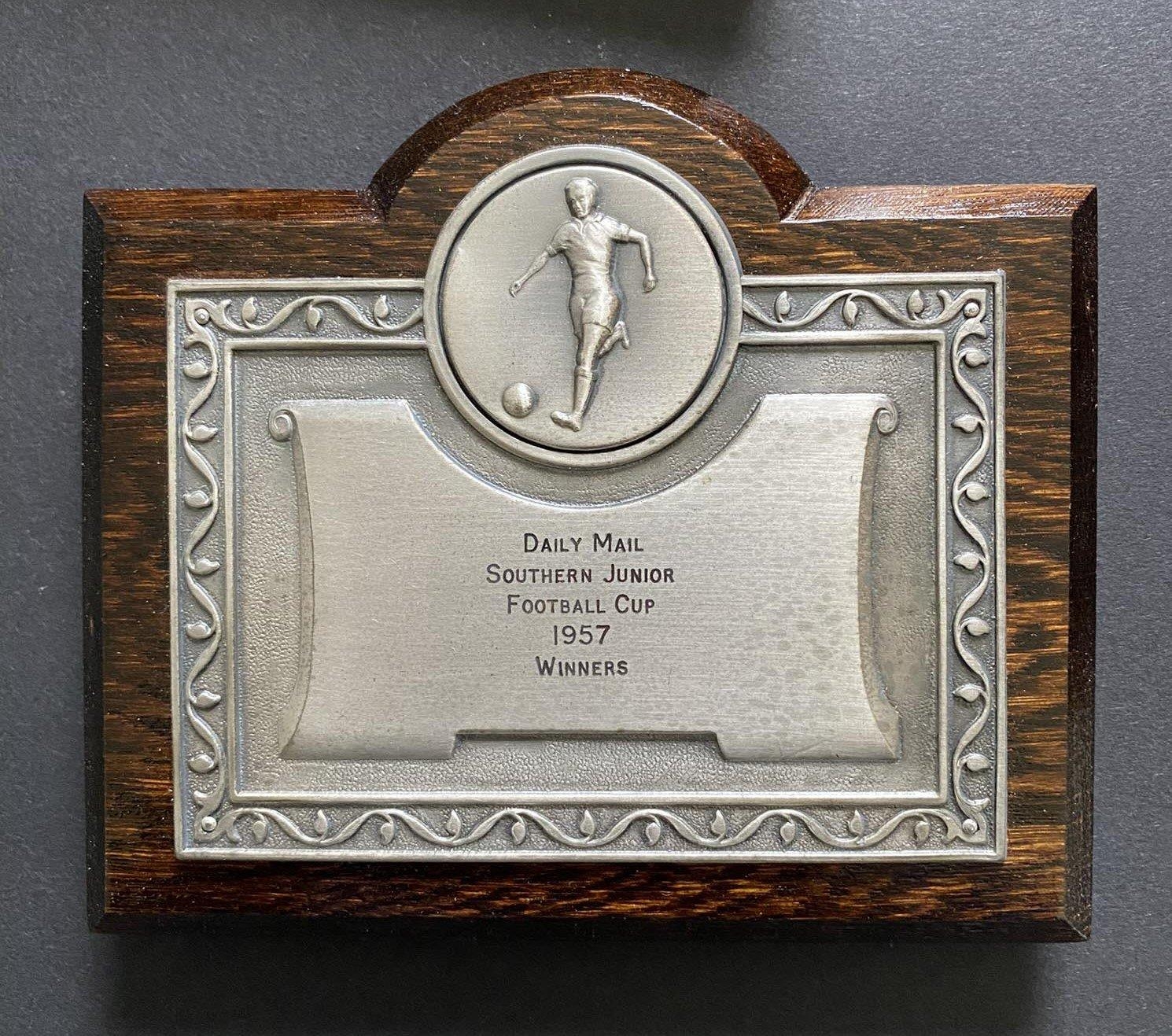 1957 John Lyalls West Ham Southern Junior Cup Final Plaque: In original box with wooden plaque engraved J Lyall. West Ham won the cup after defeating Chelsea at Stamford Bridge on 10 4 1957. John had played in earlier rounds and although he did not play in the final he was awarded the plaque.