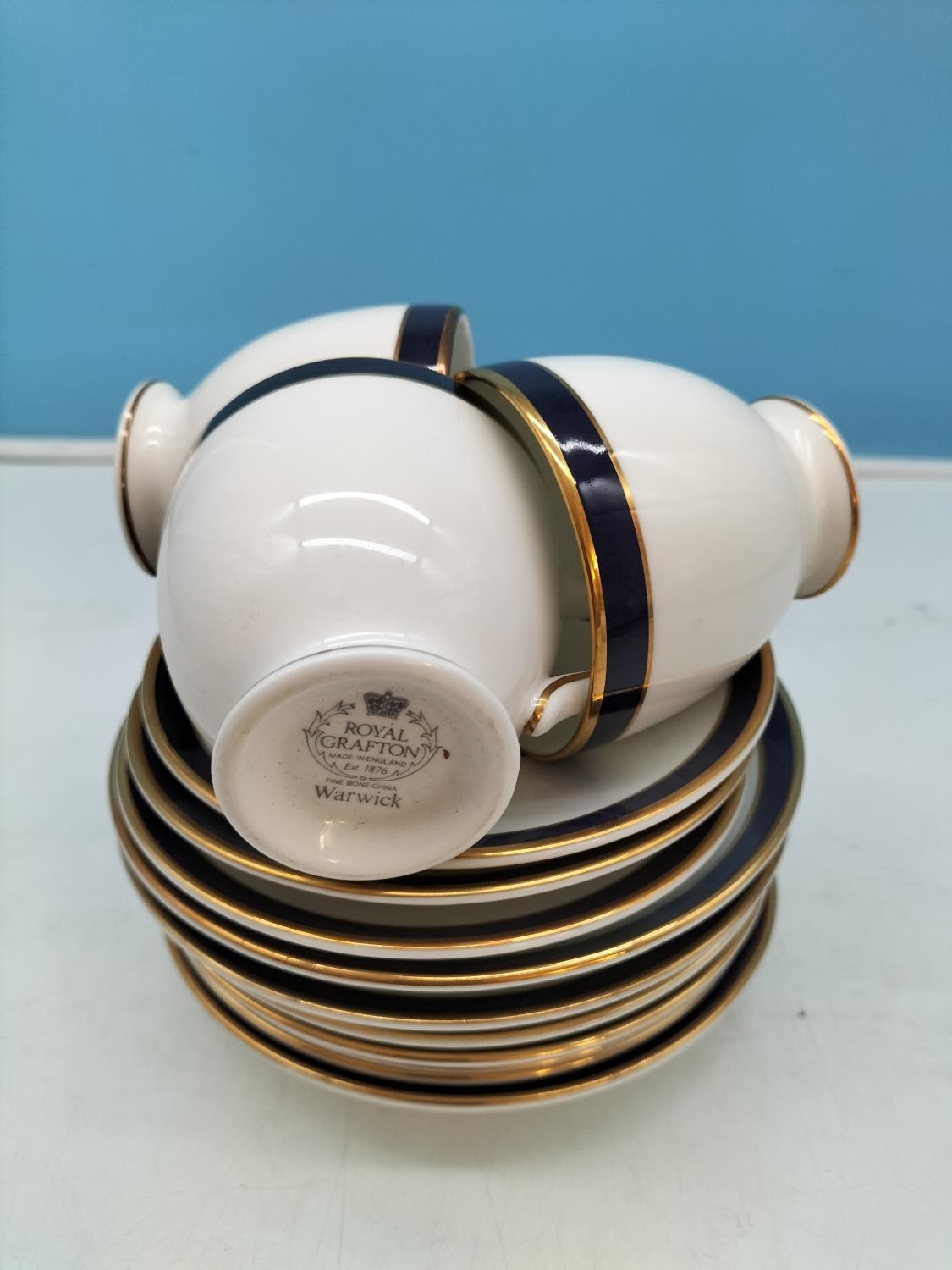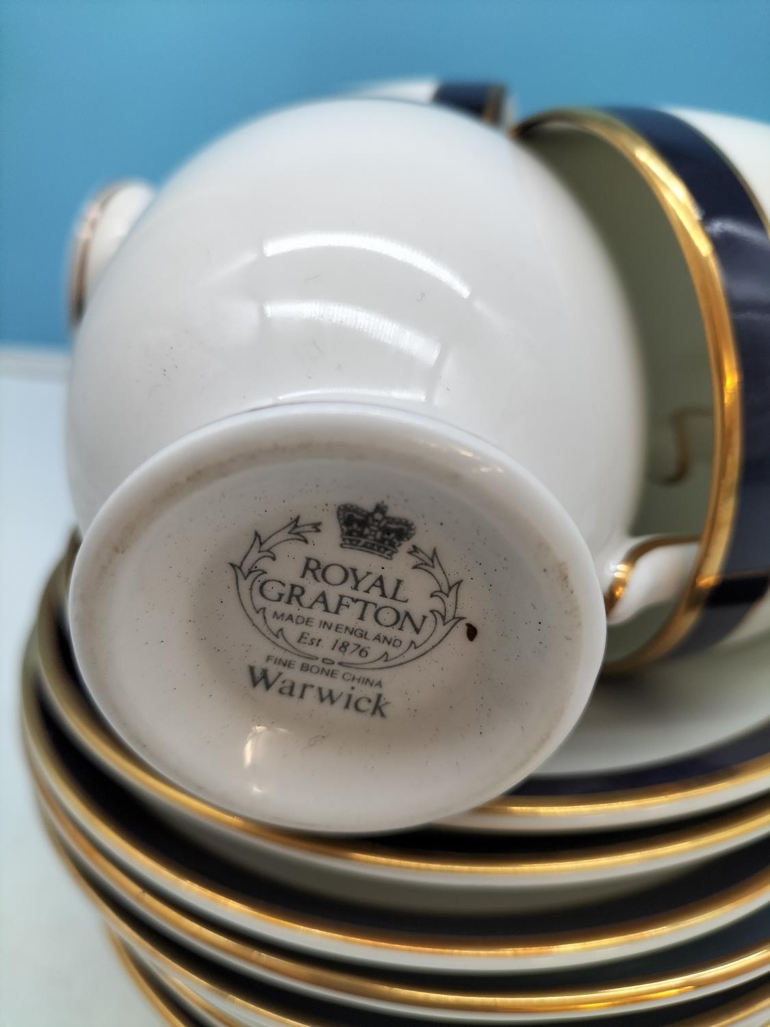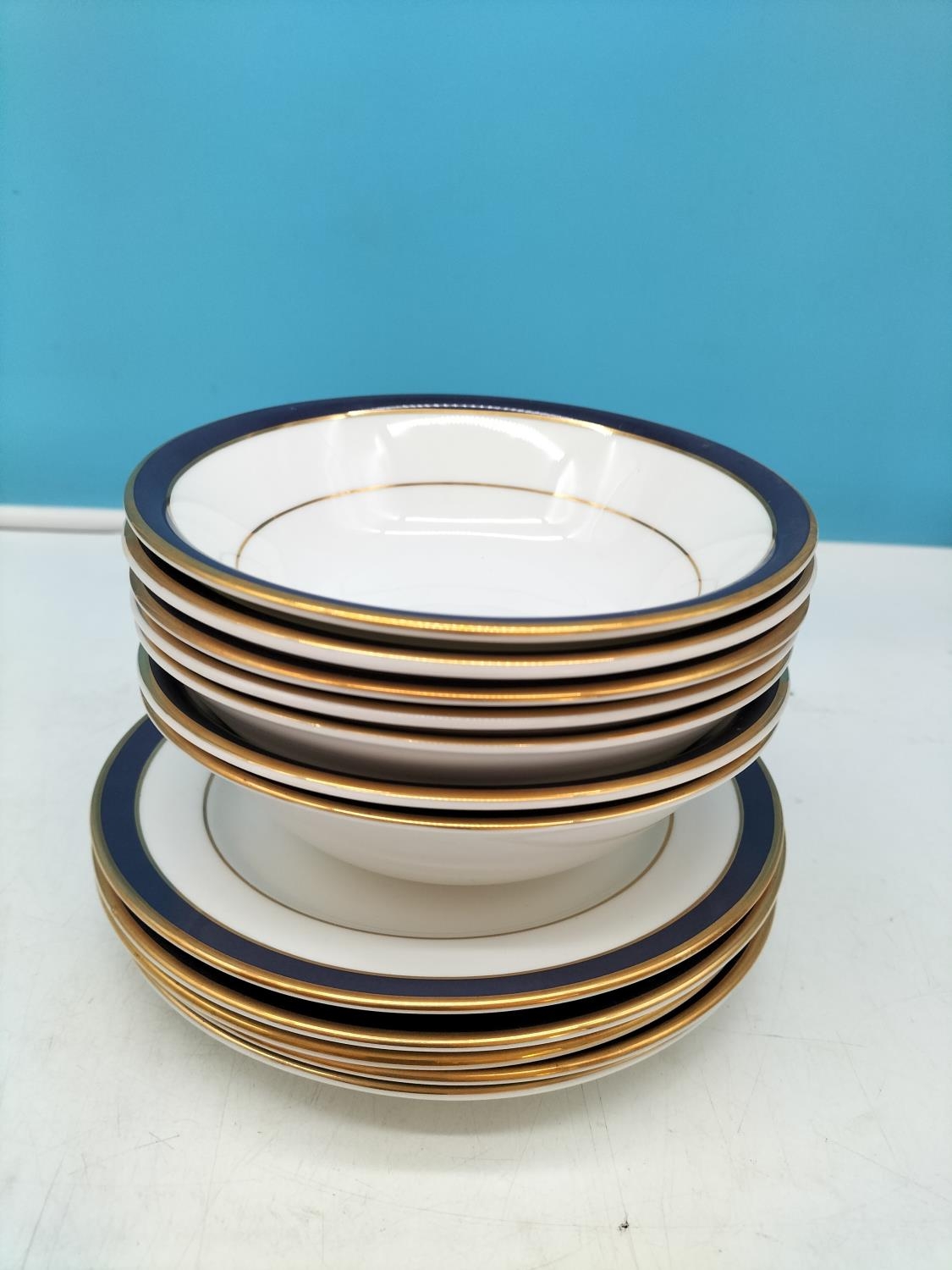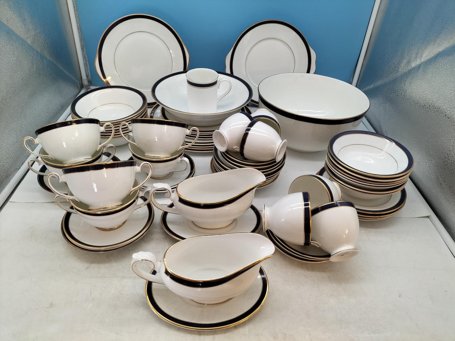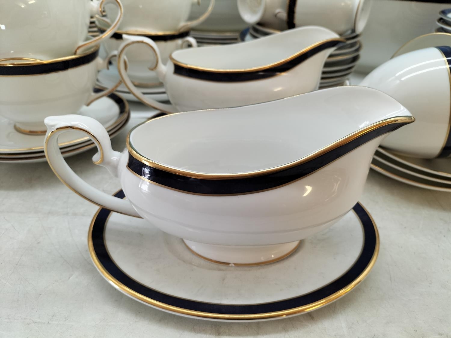 Large Collection of Royal Grafton 'Warwick Blue' Pattern Dinnerware Pieces to include 26cm Dinner Plates, Bread and Butter Plate, Soup Coupes and Saucers, Plates, Cups, Saucers, Gravy/Sauce Boats (2), Large Dessert Bowl plus Smaller Fruit Bowls, etc.