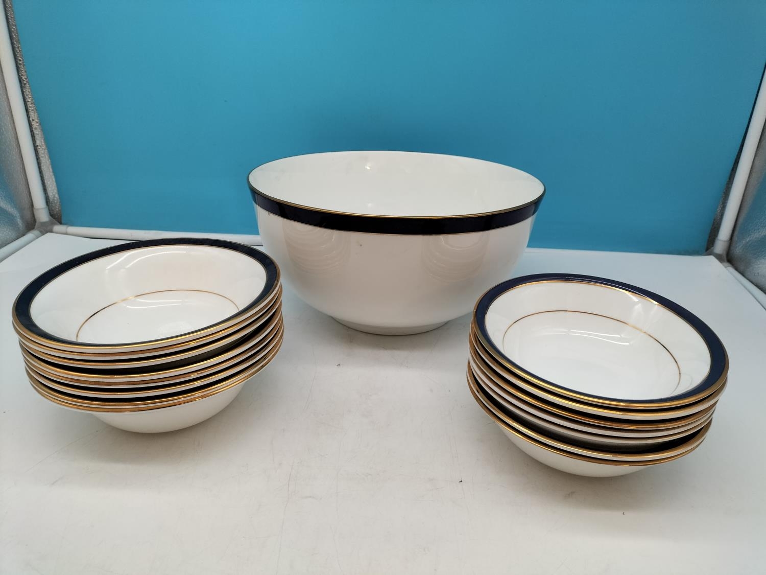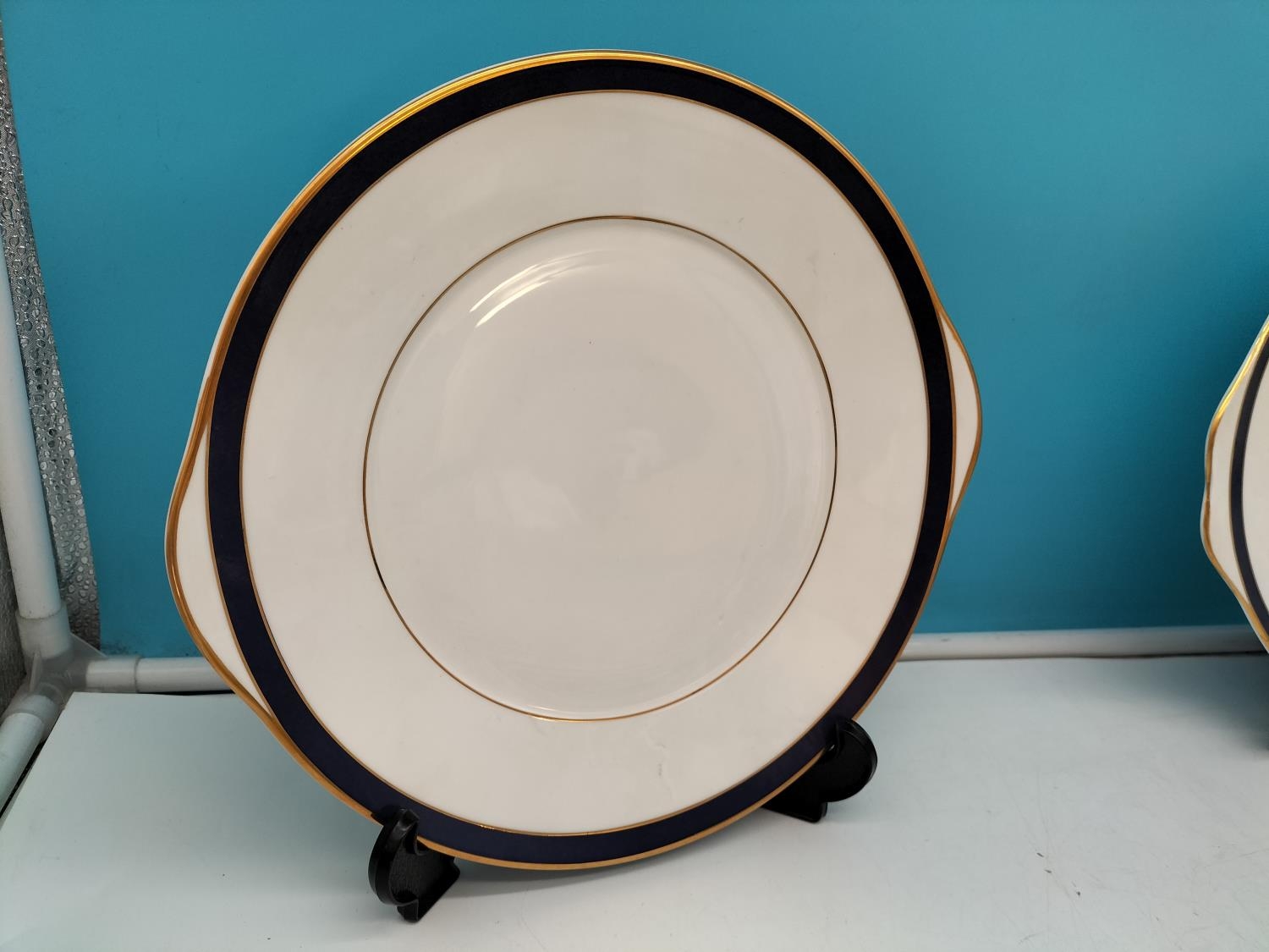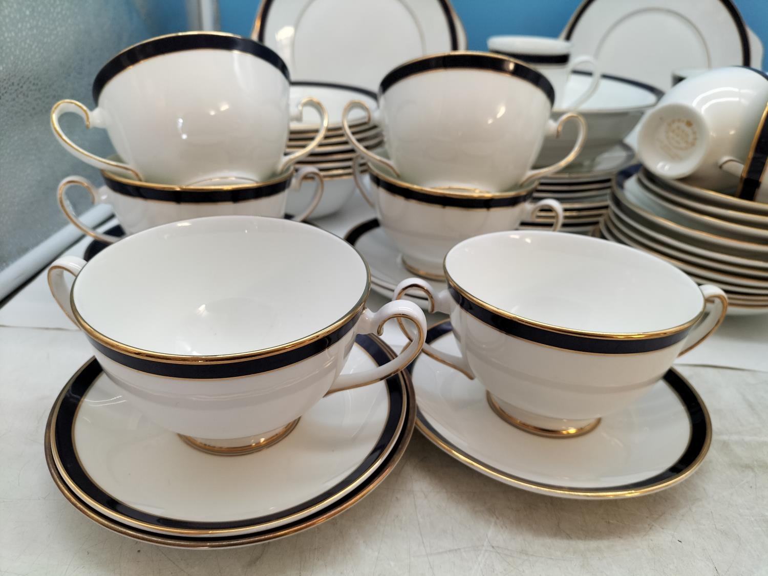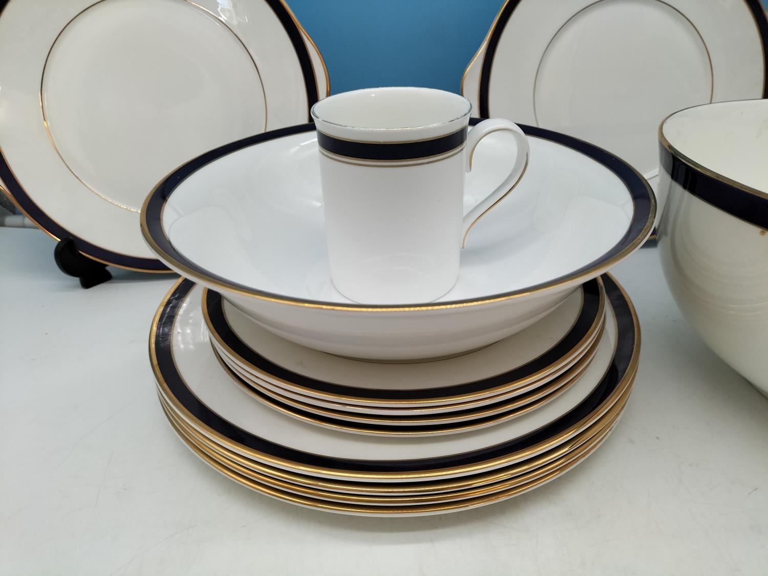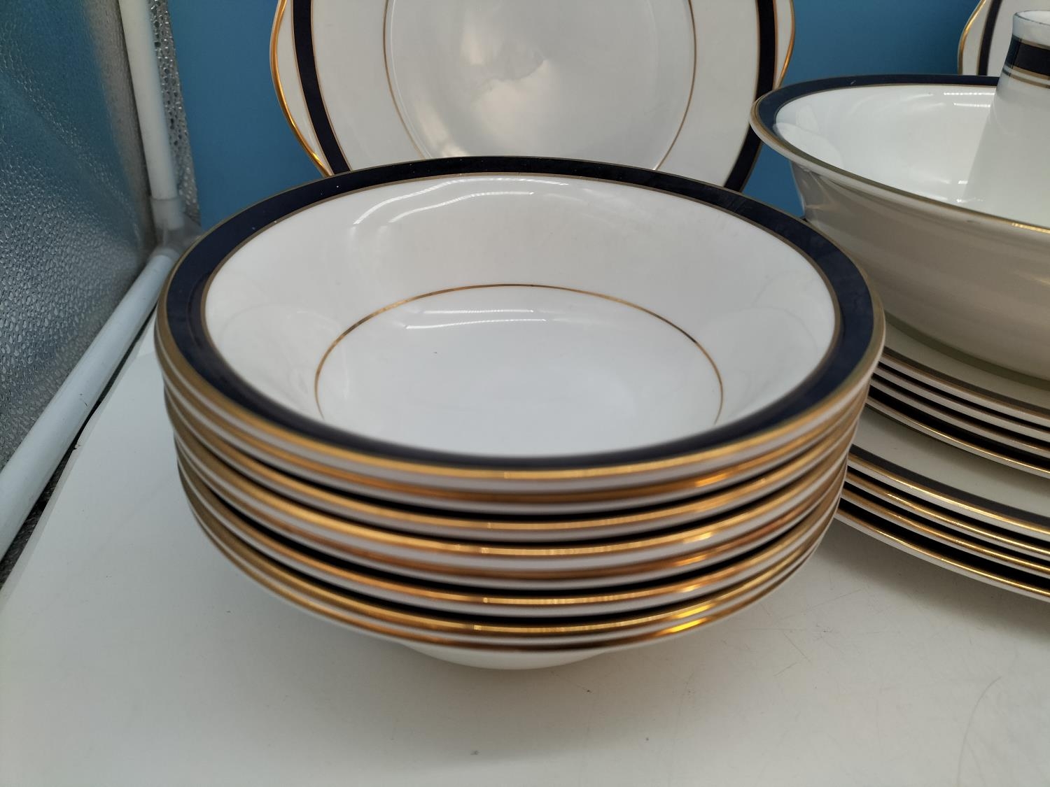 Large Collection of Royal Grafton 'Warwick Blue' Pattern Dinnerware Pieces to include 26cm Dinner Plates, Bread and Butter Plate, Soup Coupes and Saucers, Plates, Cups, Saucers, Gravy/Sauce Boats (2), Large Dessert Bowl plus Smaller Fruit Bowls, etc.