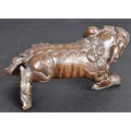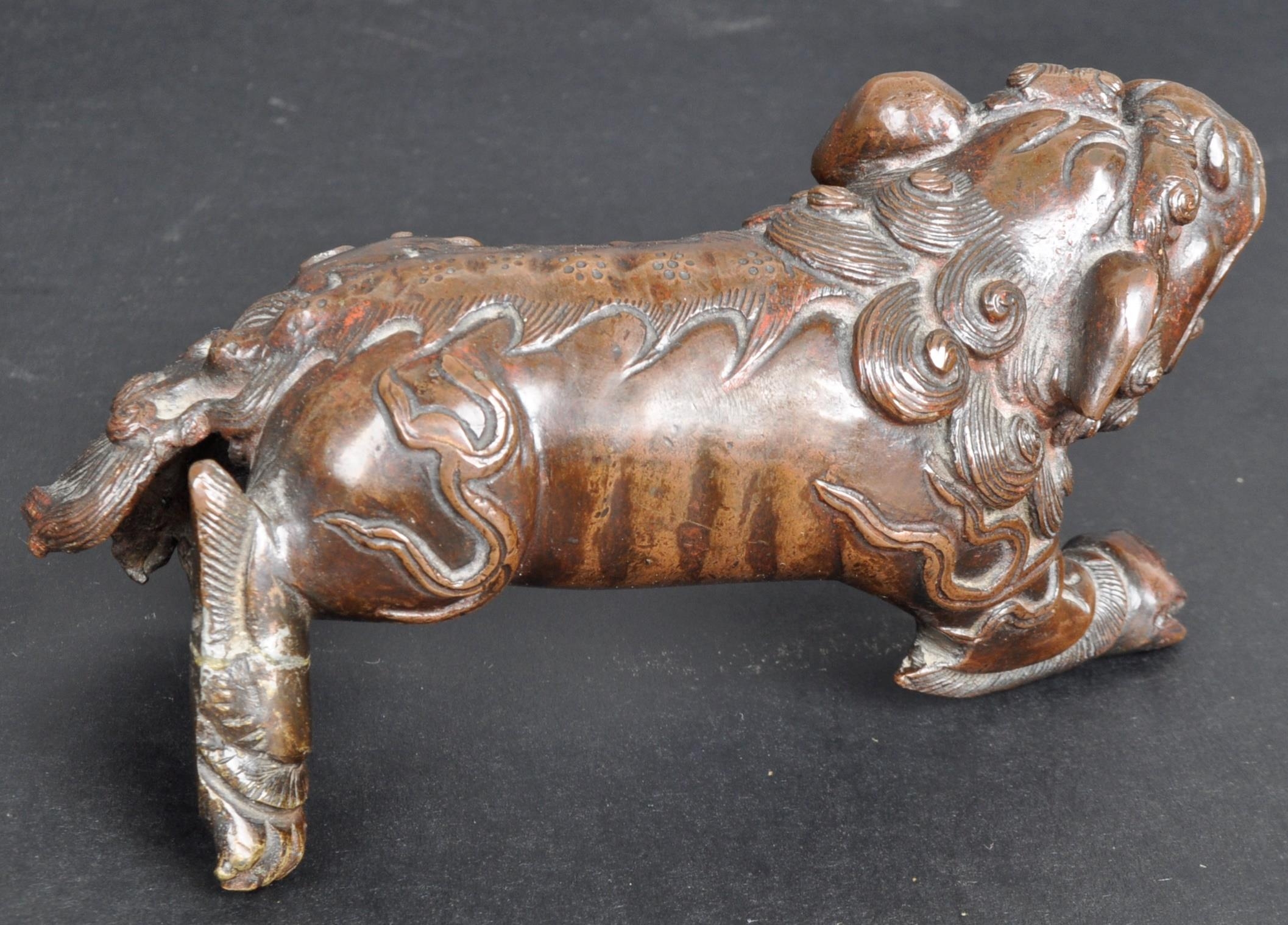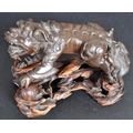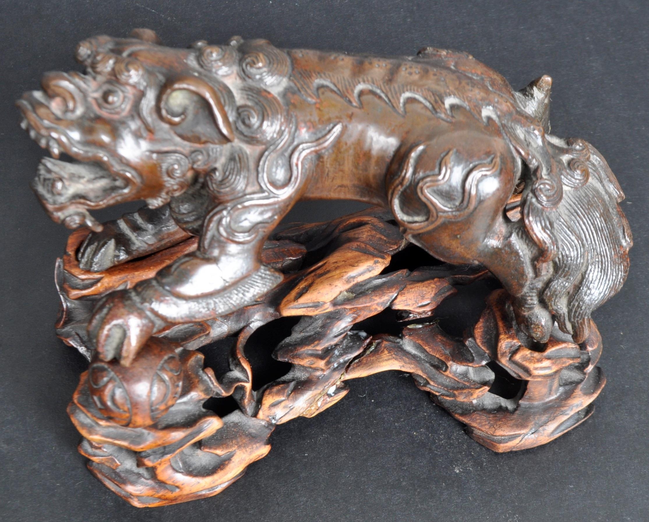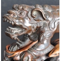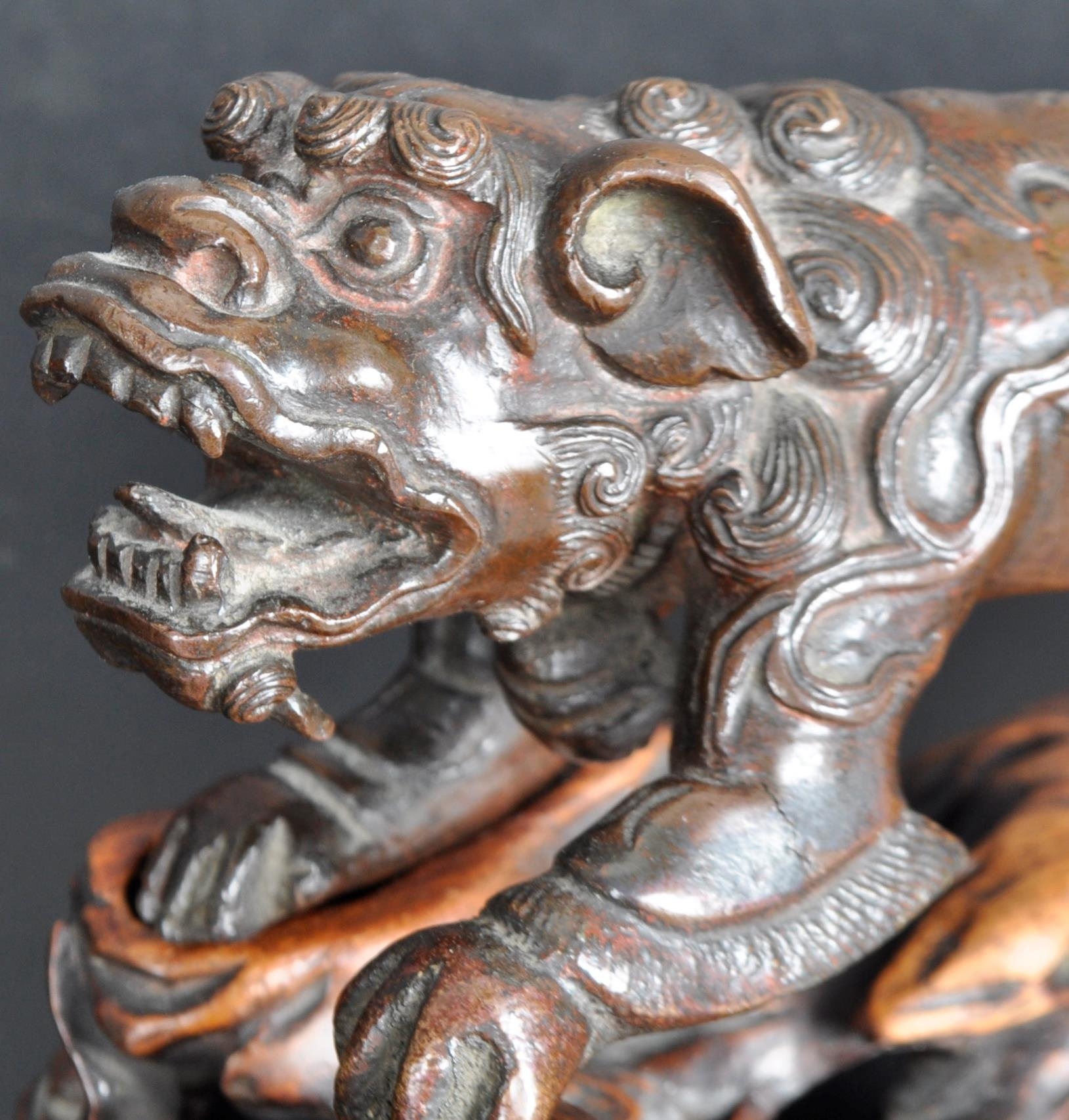 An 18th Century Chinese bronze Foo Dog. The figure modelled standing with detailed features, open jaw and engraved details. Raised on a carved pierced wooden socle base. Measures approx; 11cm x 15cm x 8cm.
