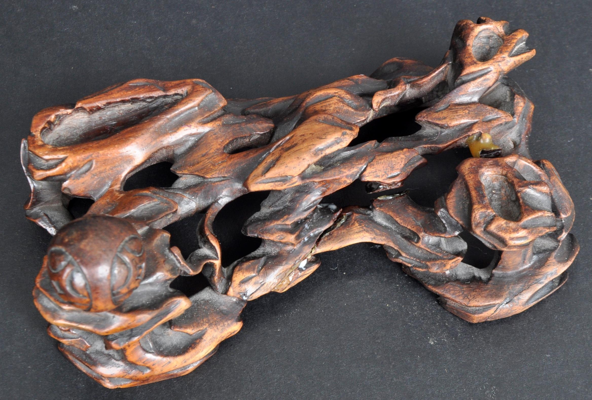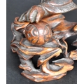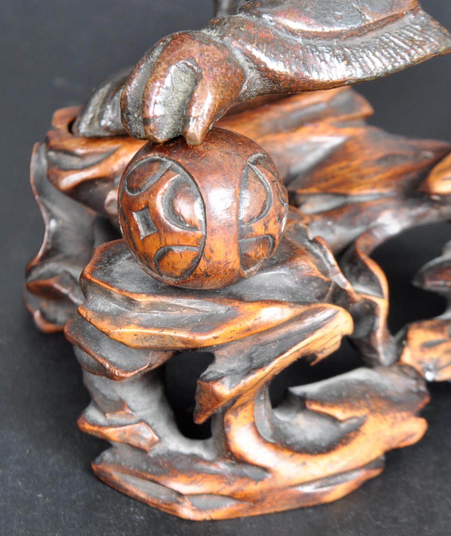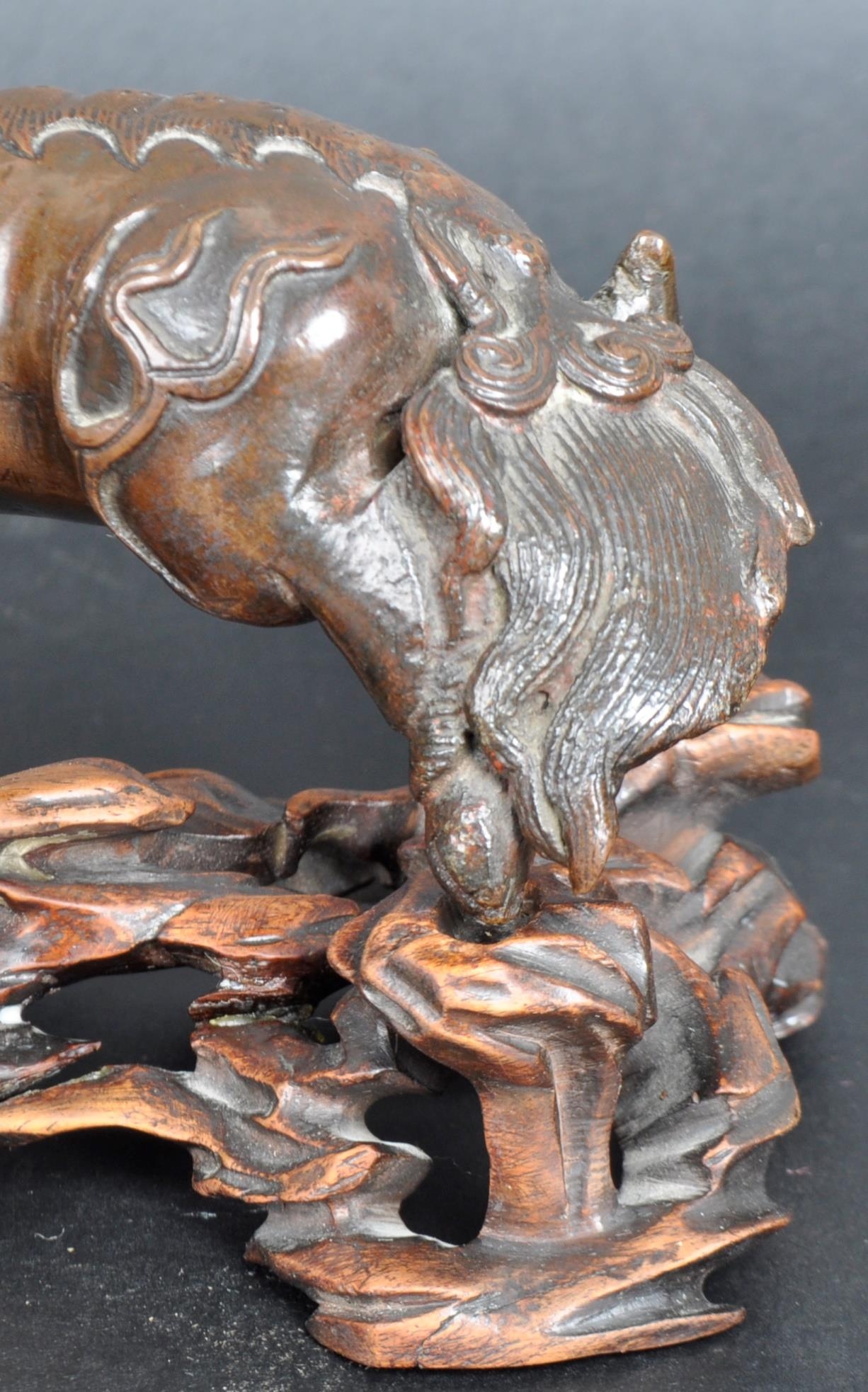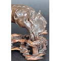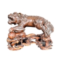 An 18th Century Chinese bronze Foo Dog. The figure modelled standing with detailed features, open jaw and engraved details. Raised on a carved pierced wooden socle base. Measures approx; 11cm x 15cm x 8cm.