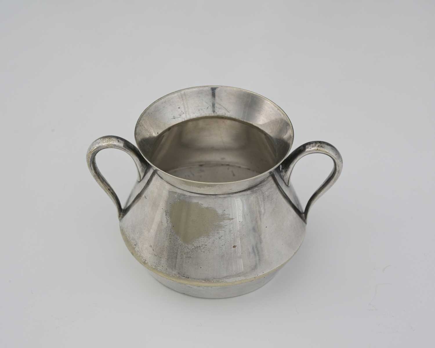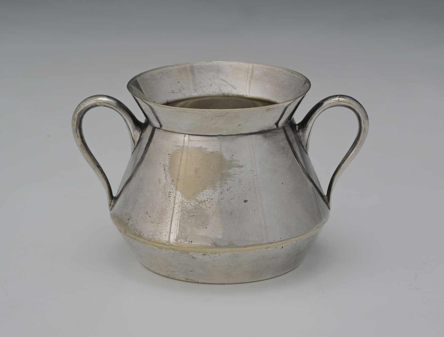 Christopher Dresser for Richard Hodd and Sons, an Aesthetic Movement silver plated sugar bowl, 1878, twin handled angled baluster form, stamped marks and design registration diamond, 6.5cm high, 11cm wide Note: some of Dresser's earliest designs were produced by the Hatton Garden firm of Richard Hodd and Sons, prior to the Hukin and Heath showcase of designs in 1879. This bowl is part of a well known Dresser designed tea set; a service of this design including the bowl was exhibited at Hereford Museum & Art Gallery The Art & Craft of Design: An Exhibition of Work by Christopher Dresser 20th January-3rd March 2007; See Bonhams, New York, 19th December 2007 for an example of a three piece tea set of this design; also Christie's Harry Lyons Collection, 19th October 2004, lot 315 for an example of the kettle from this service.