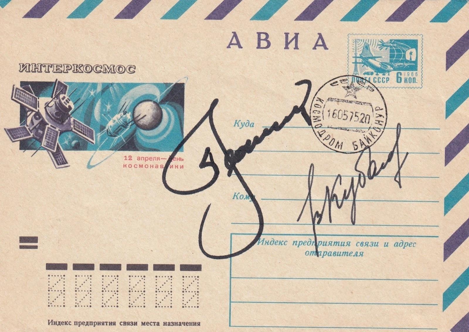Russian space Cover Signed by A A Leonov, Russian pilot. V N Kubasov, cosmonauts. 15 V11 1975 Sojus 19 Space Cover Personally Signed by, Aleksei Arkhipovich Leonov, Russian pilot cosmonaut. Flew on Voskhod 2, Soyuz 19 (ASTP). First person to walk in space Duration in Space 7. 02 days. and Valeri Nikolayevich Kubasov, (1935-) Russian engineer cosmonaut. Flew on Soyuz 6, Soyuz 19 (ASTP), Salyut 6 EP-5. Total Duration in Space 18. 75 days. Good condition. All autographs come with a Certificate of Authenticity. We combine postage on multiple winning lots and can ship worldwide. UK postage from £5.99, EU from £7.99, Rest of World from £9.99