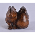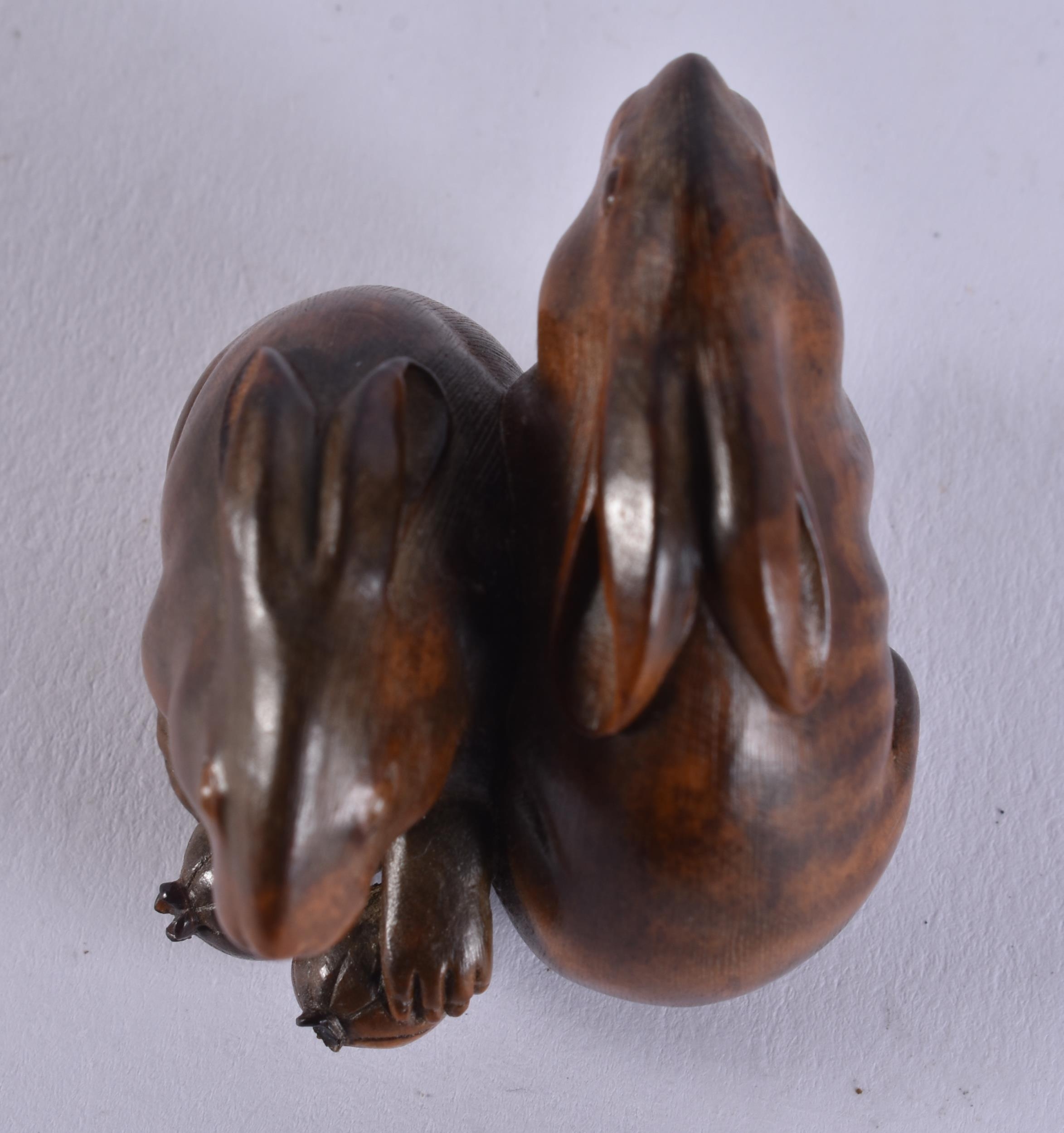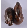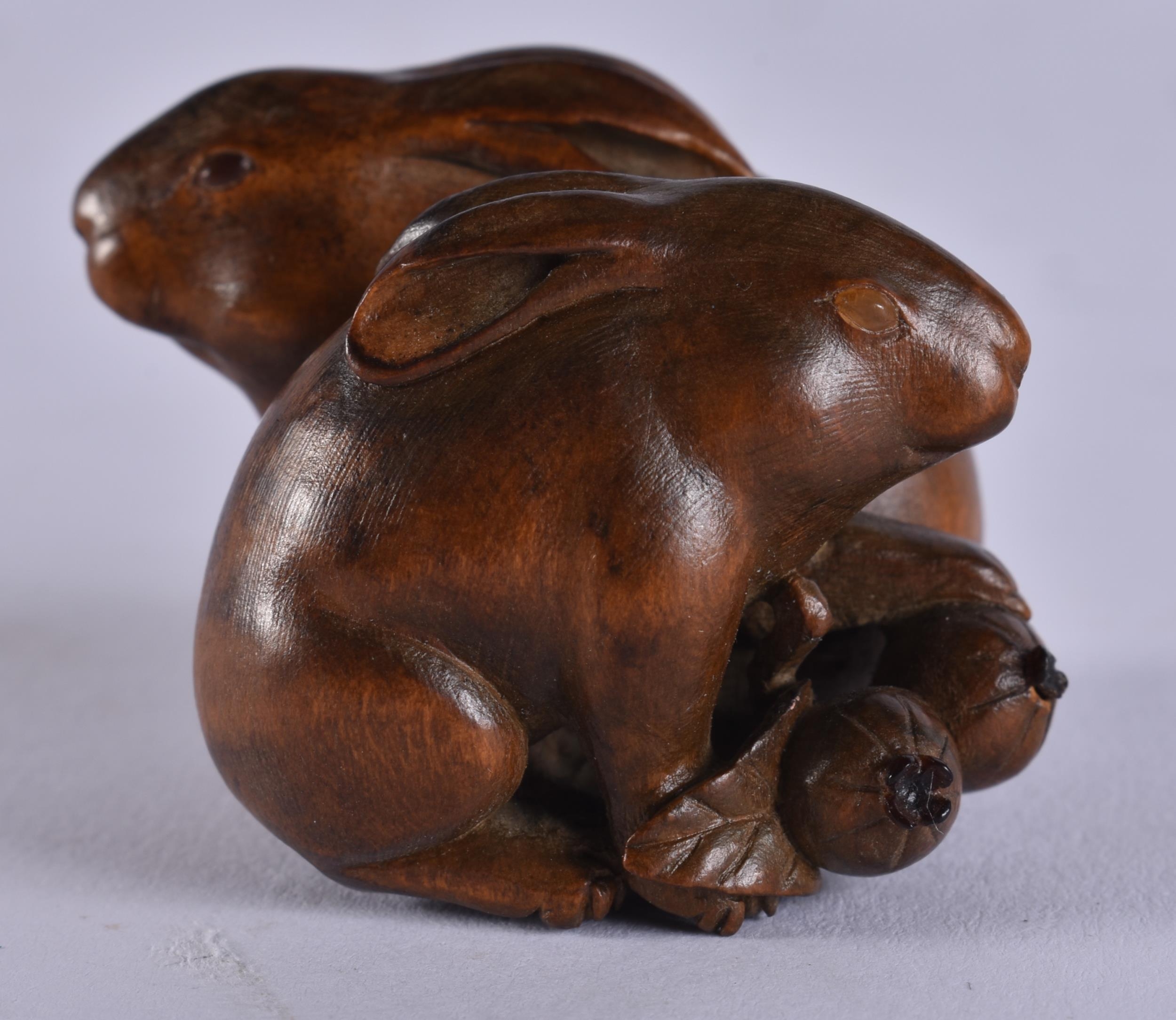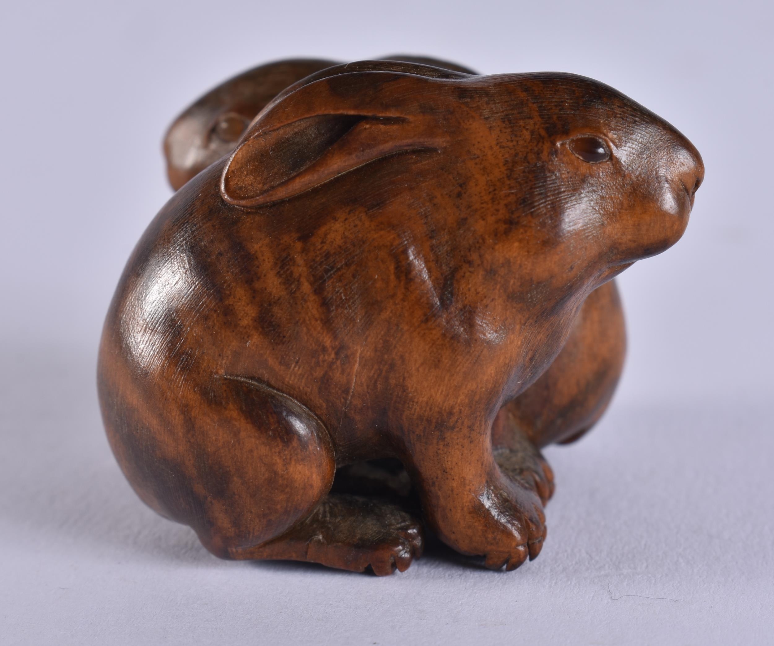A FINE 19TH CENTURY JAPANESE MEIJI PERIOD CARVED WOOD HARE NETSUKE with amber eyes. 4 cm x 3.5 cm.