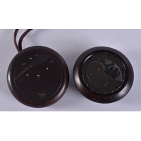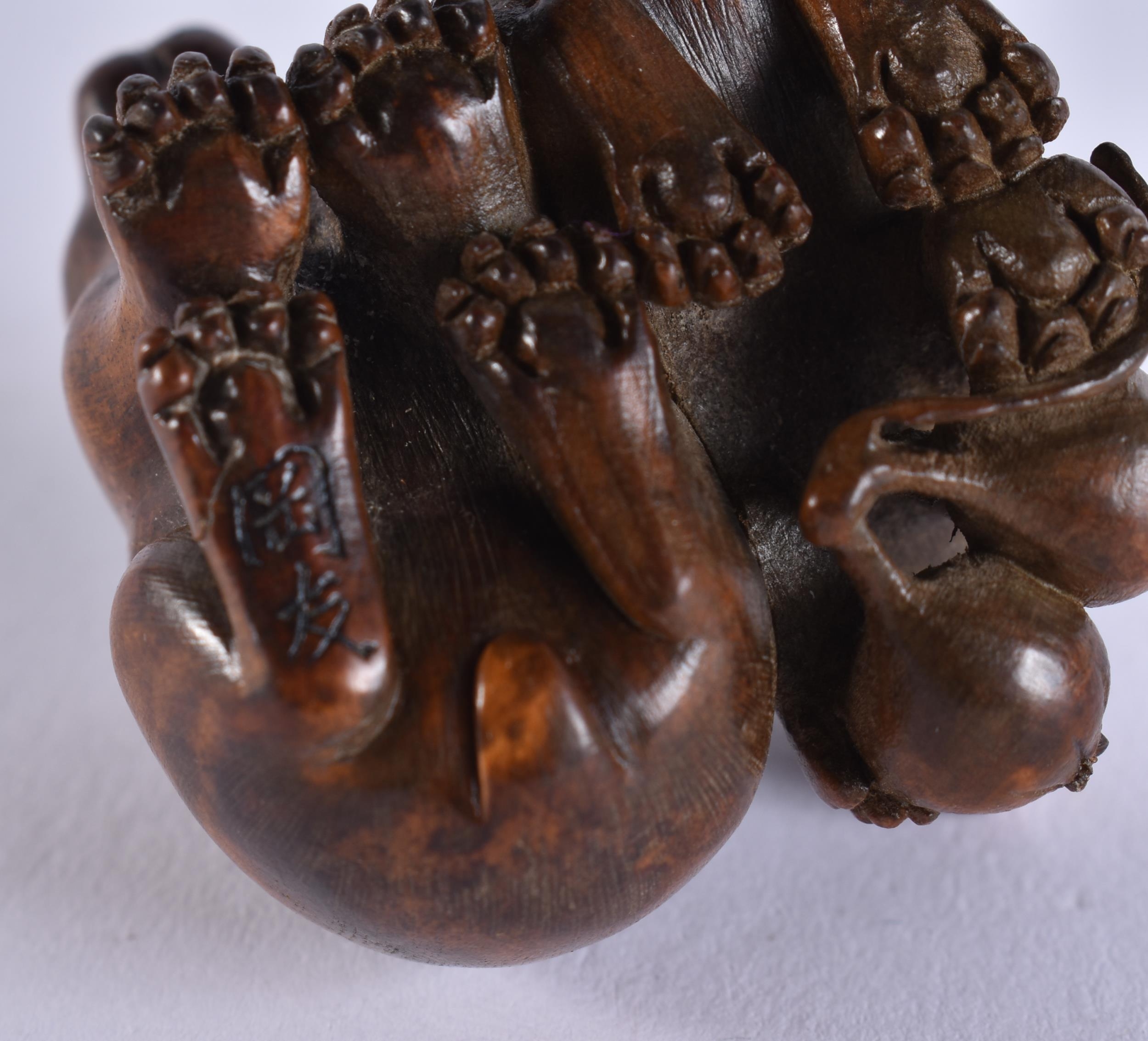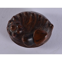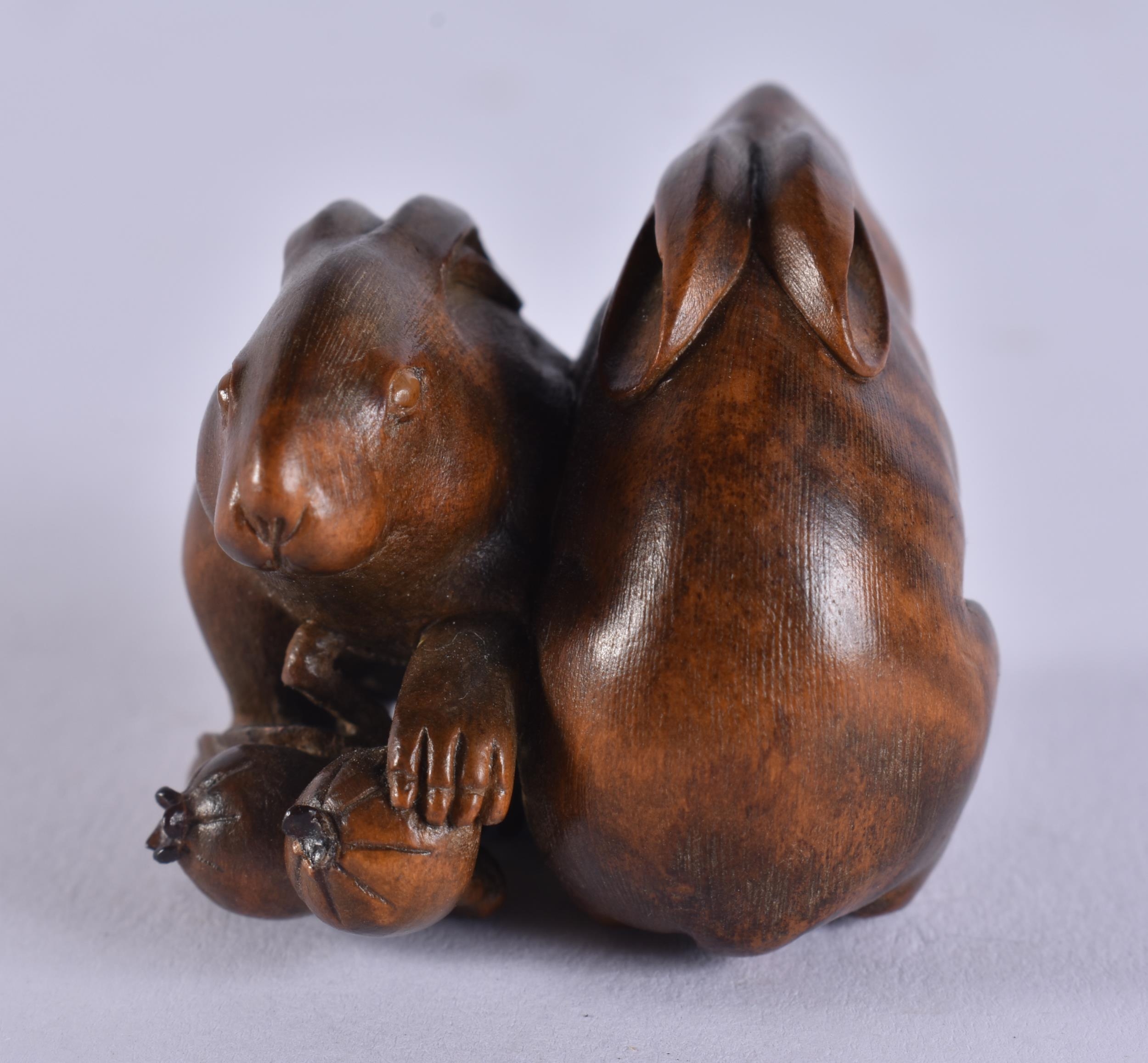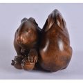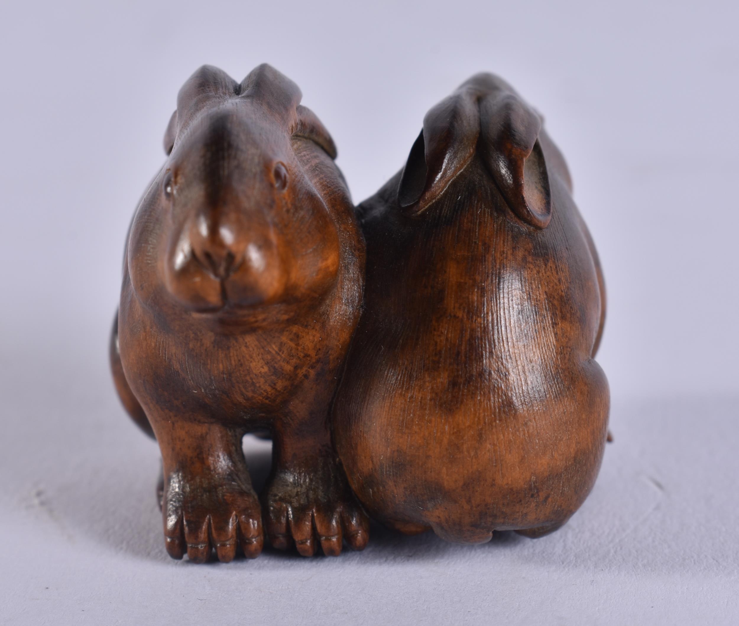 A FINE 19TH CENTURY JAPANESE MEIJI PERIOD CARVED WOOD HARE NETSUKE with amber eyes. 4 cm x 3.5 cm.