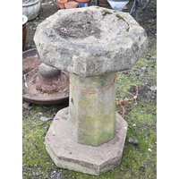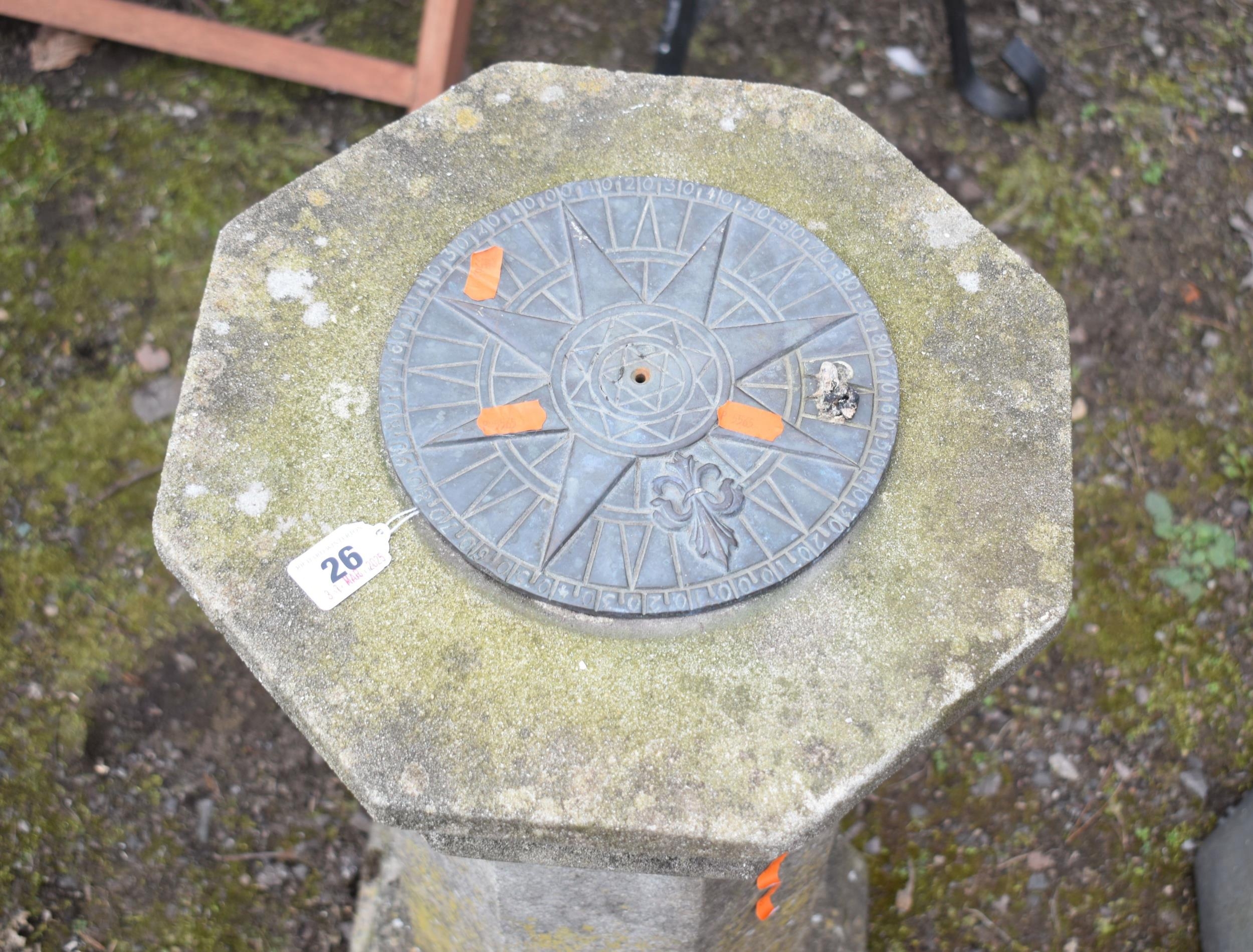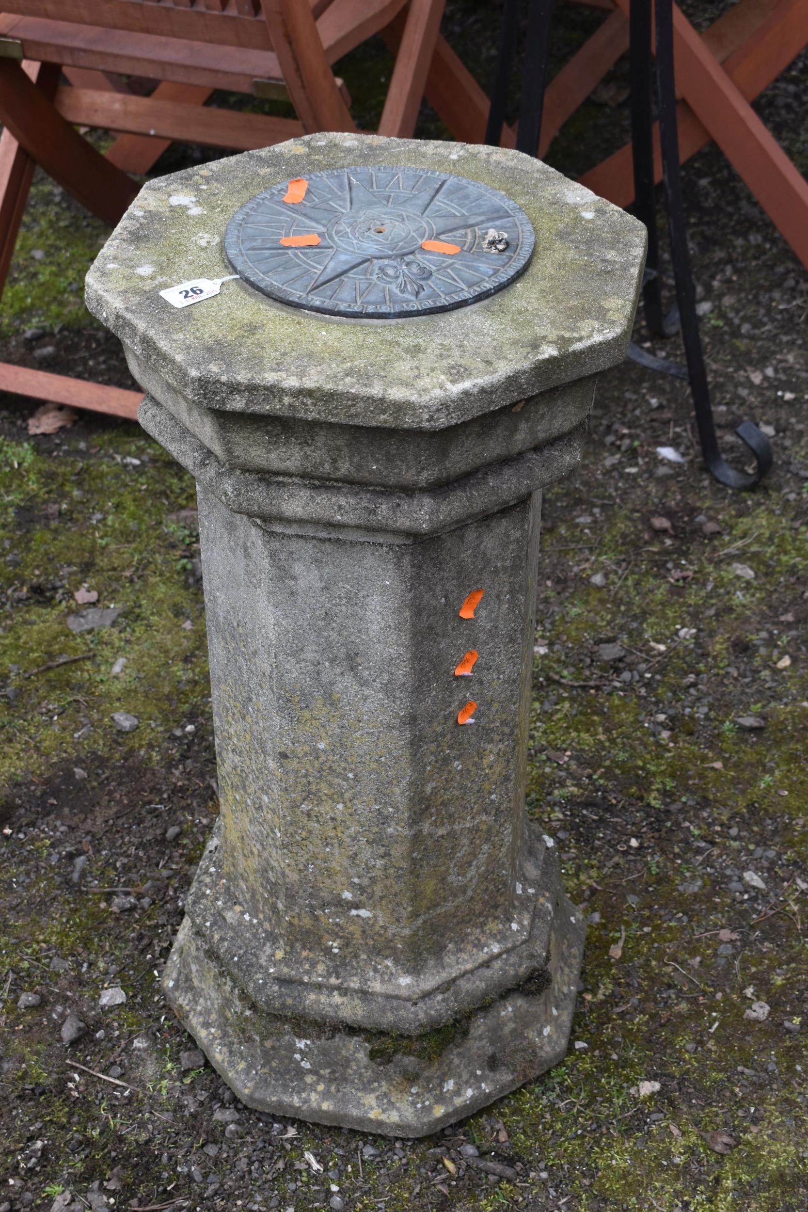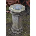 A WEATHERED COMPOSITE SUN DIAL, on an octagonal support, diameter 34cm x height 68cm, condition report: dial missing hand