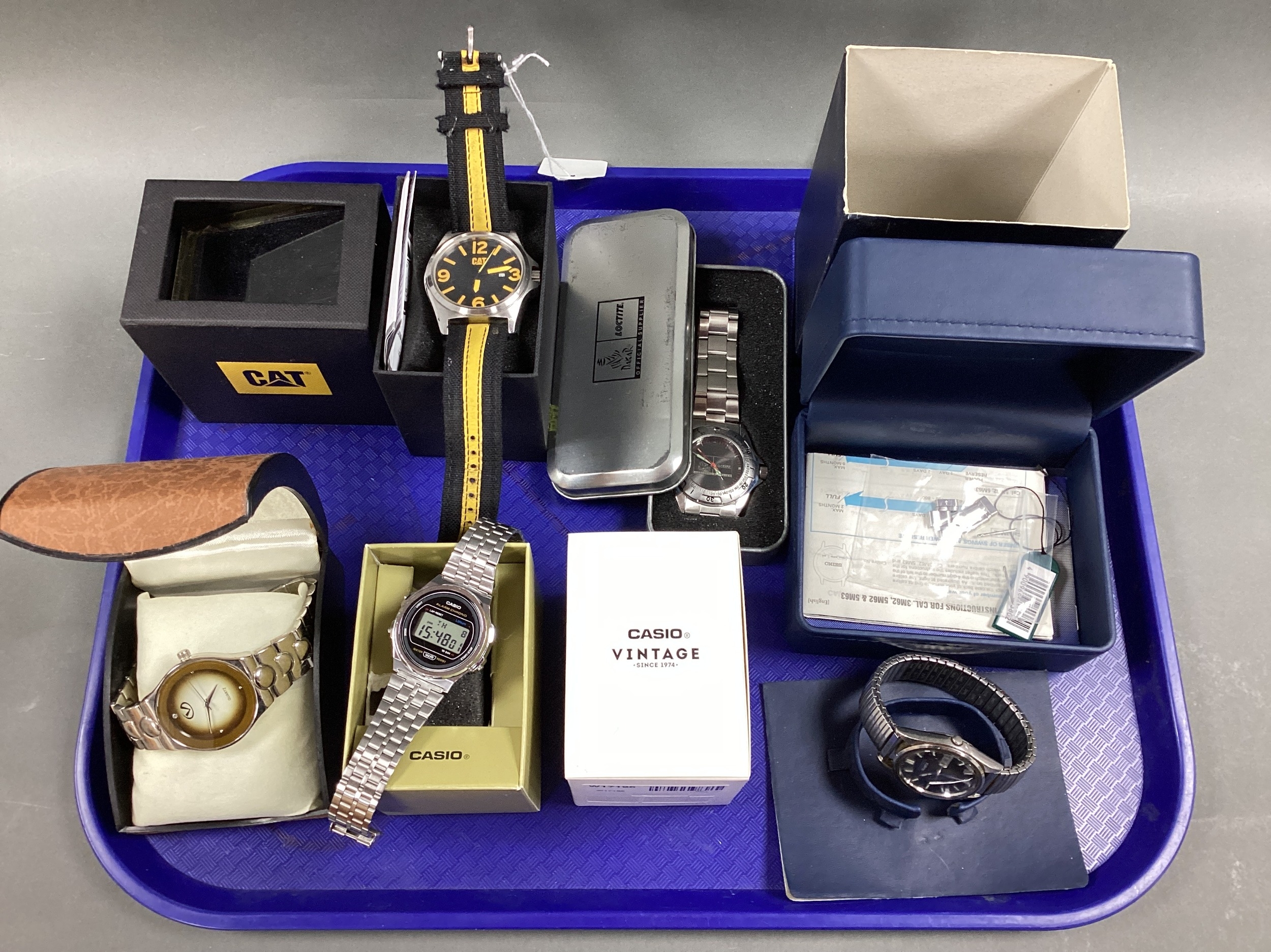 Retro 'Casio Vintage' Digital WR Wristwatch, boxed; Seiko SQ black dial wristwatch (later expanding bracelet); CAT chunky gent's wristwatch, boxed etc :- One Tray [943101]