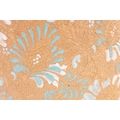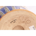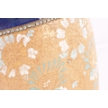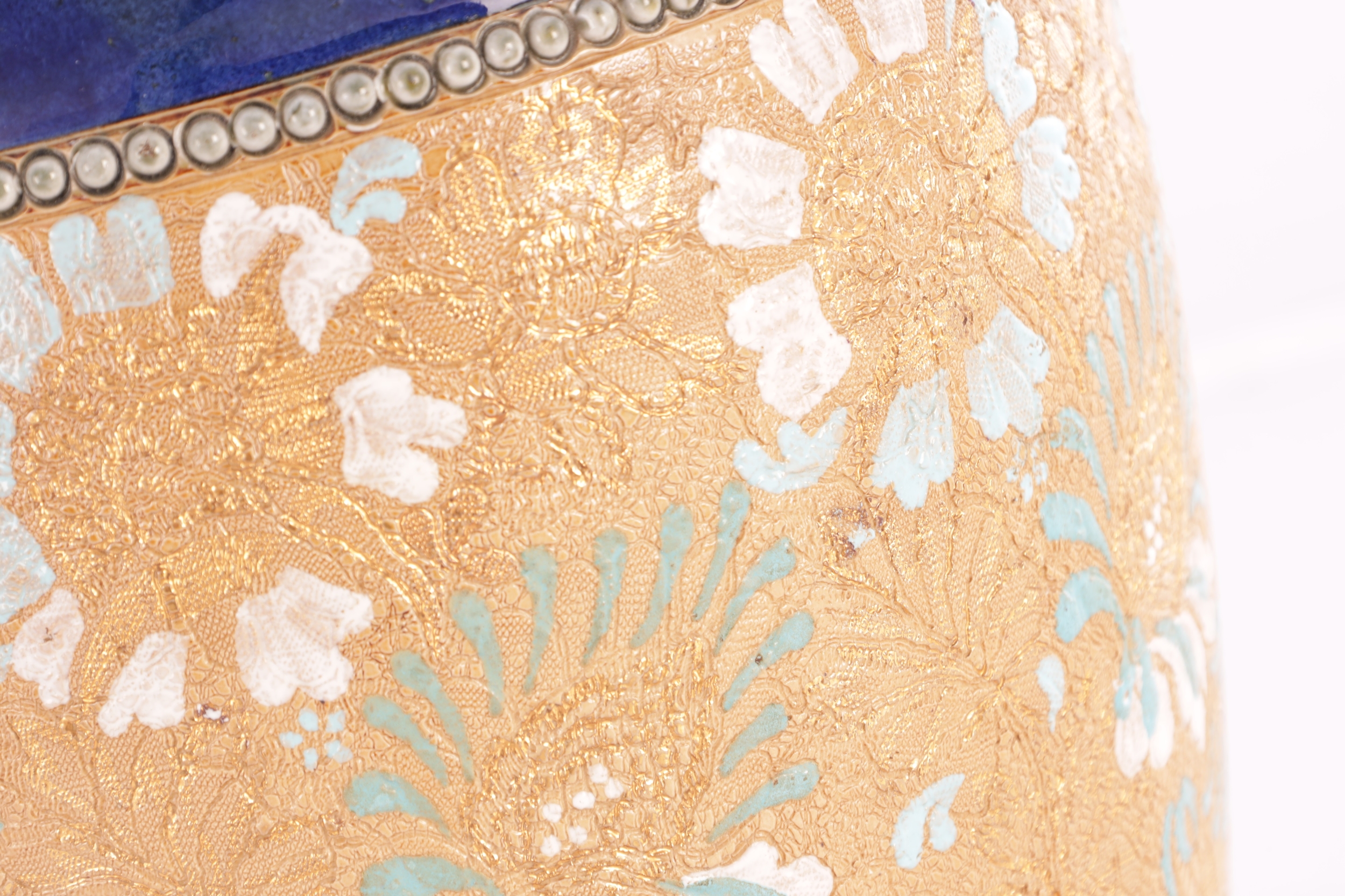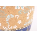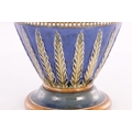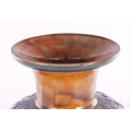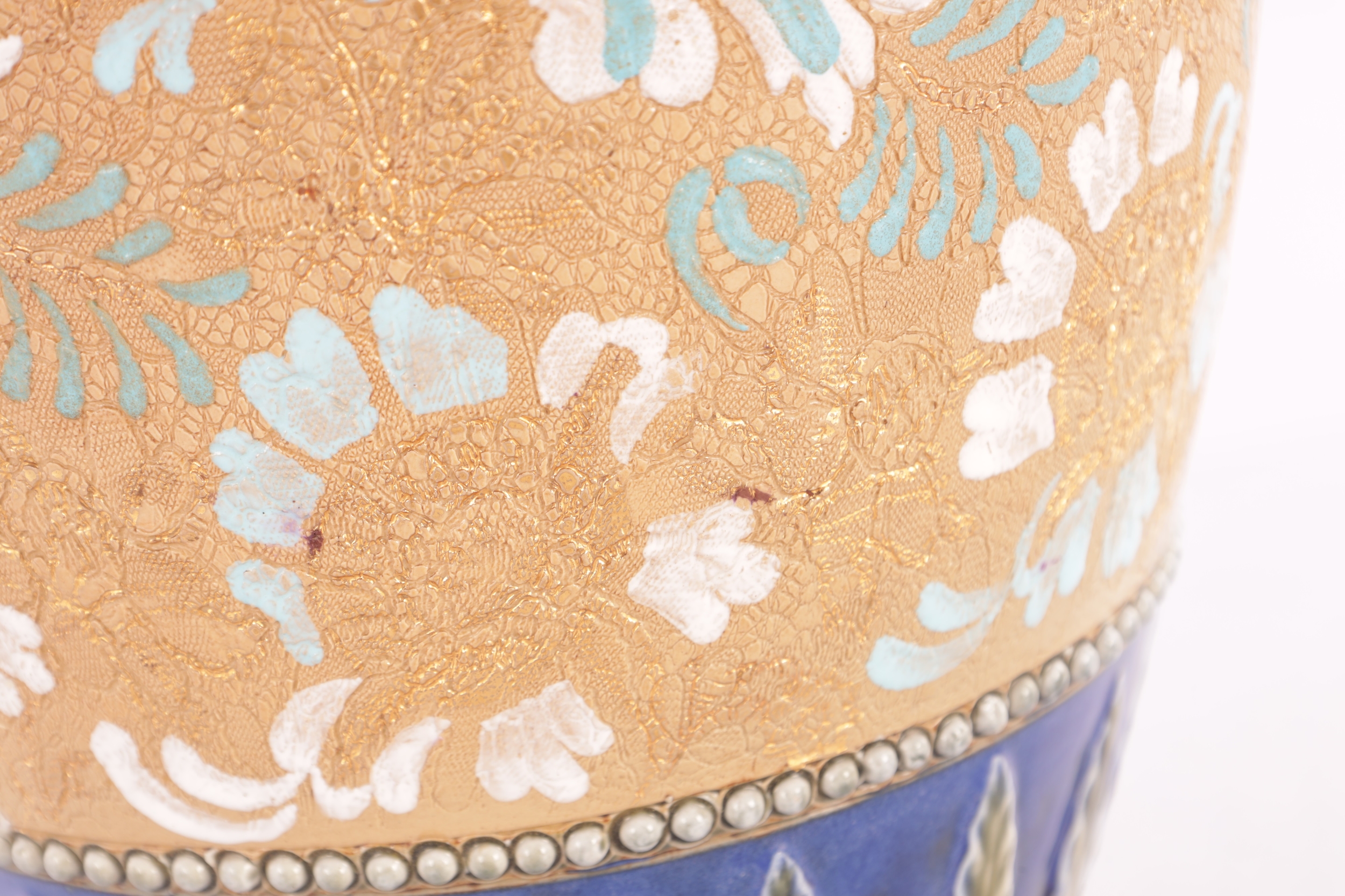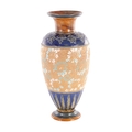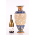 A DOULTON LAMBETH STONEWARE TAPERED SHOULDERED VASE WITH SLENDER NECK AND FLARED RIM decorated with raised floral blue shoulder above a central gilt chine band - impressed marks beneath. (44cm high)