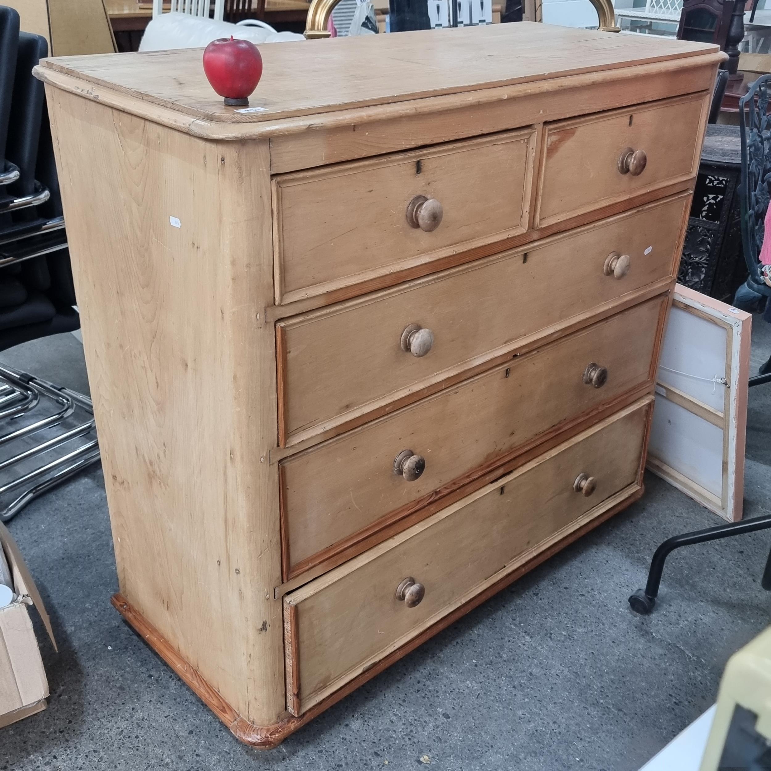 Star lot : A beautiful country rustic pine chest of drawers. This example is crafted from a pale golden pine wood with turned wood pull handles and five generously proportioned drawers. H110cm x W120cm x D52cm