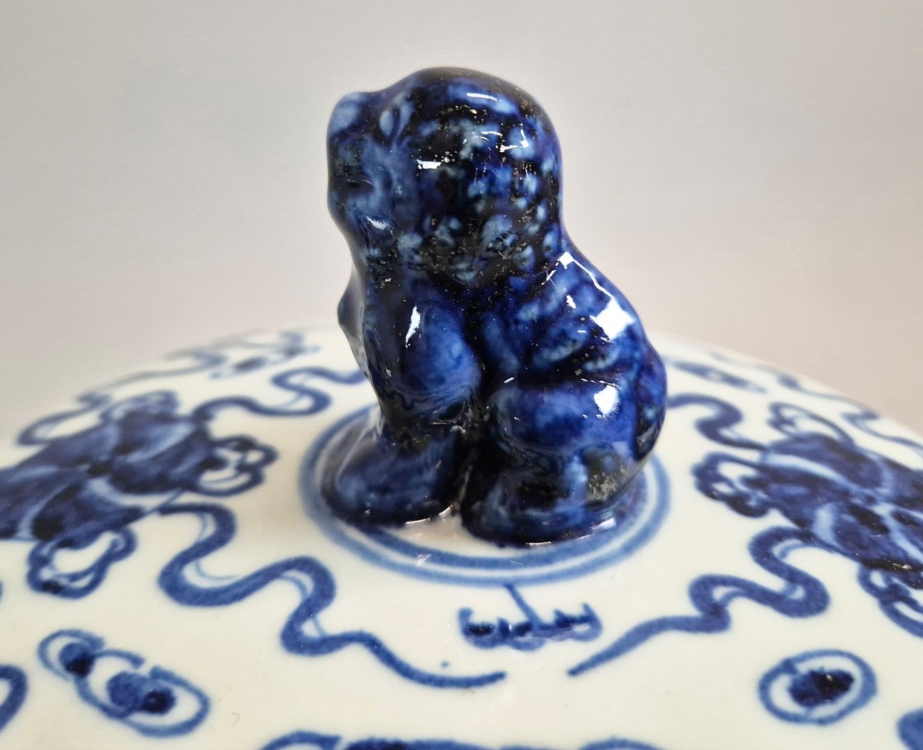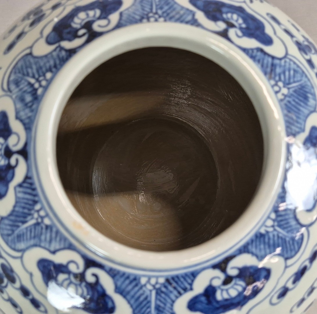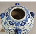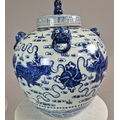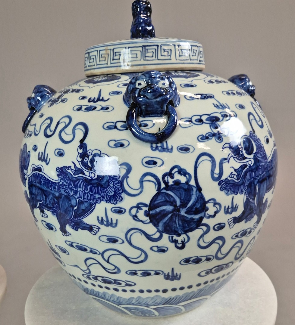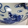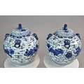 PAIR OF BLUE AND WHITE CHINESE CERAMIC LIDDED JARS. 42cm H x 34cm W.