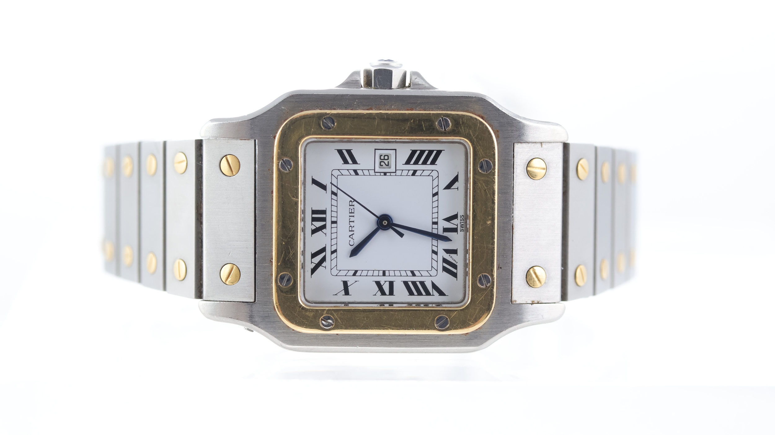 Dial features: Blue steel hands with black roman numeral hour markers.