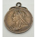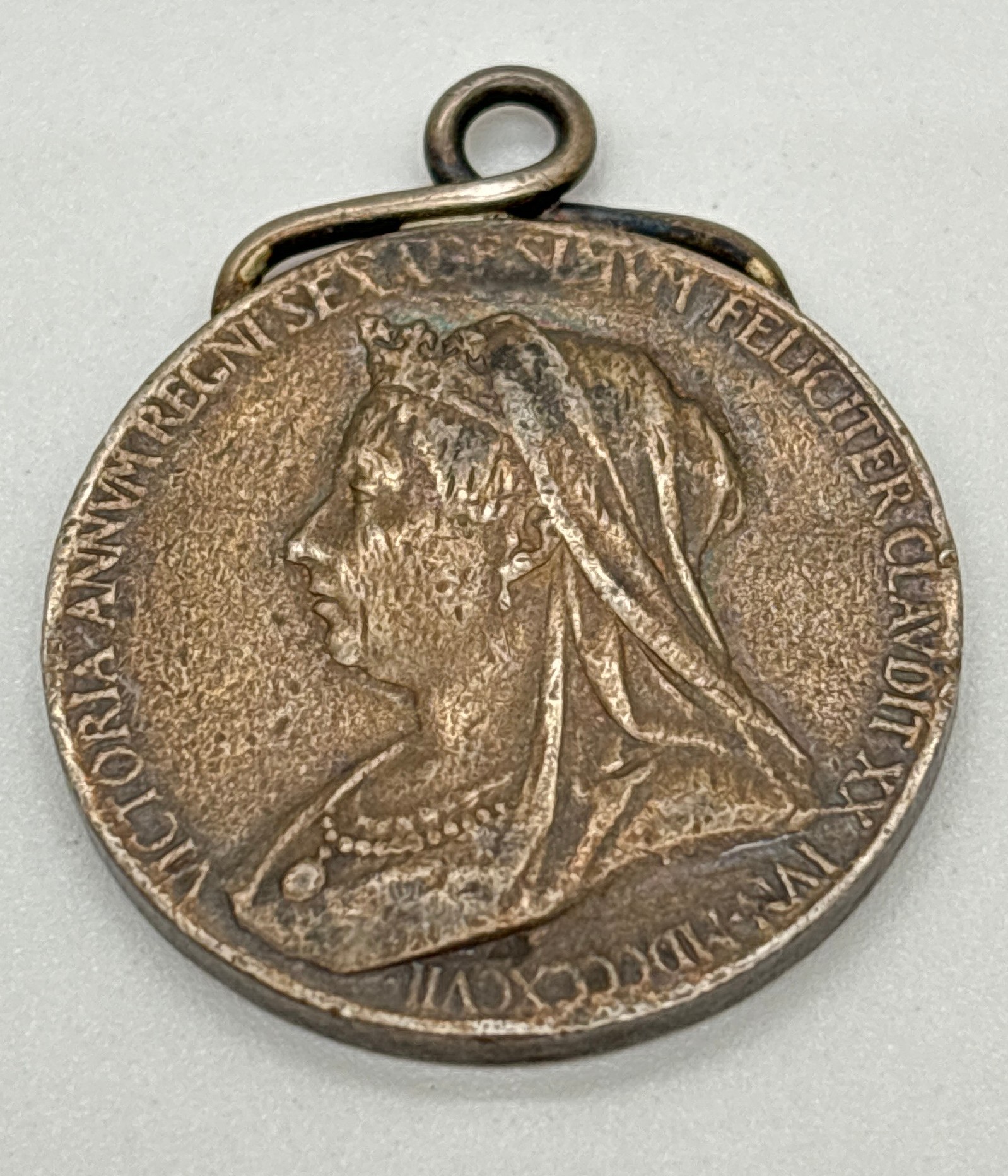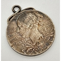 A silver Victoria 1897 Diamond Jubilee commemorative medallion with twisted design hanging bale fixed to rim. Veiled head 1897 head to obverse and young bunhead 1937 head to reverse. Approx. 2.5cm diameter & weighs 10.18g.