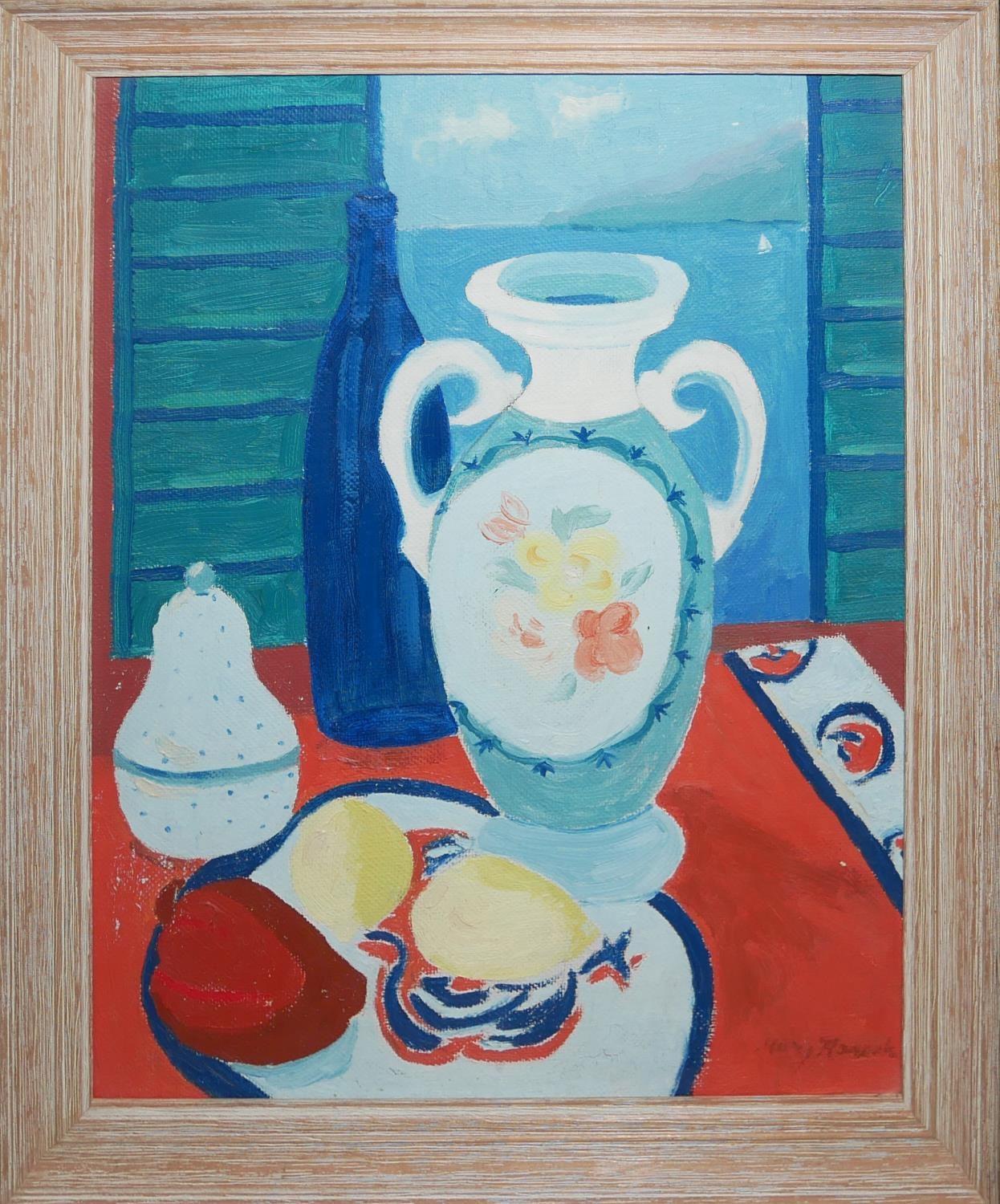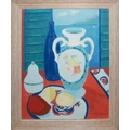 AN OIL ON CANVAS STILL LIFE, BLUE VASE WITH LEMONS