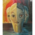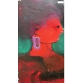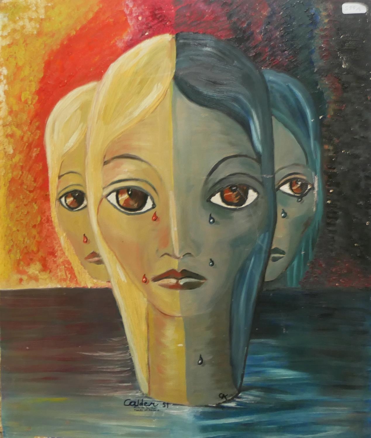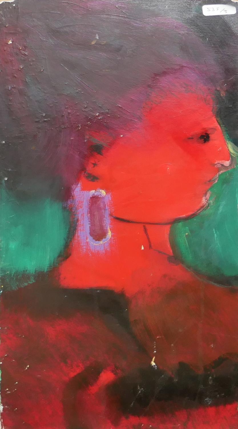 Indistinctly signed lower right, together with two abstract oils on board, portraits.