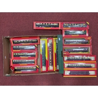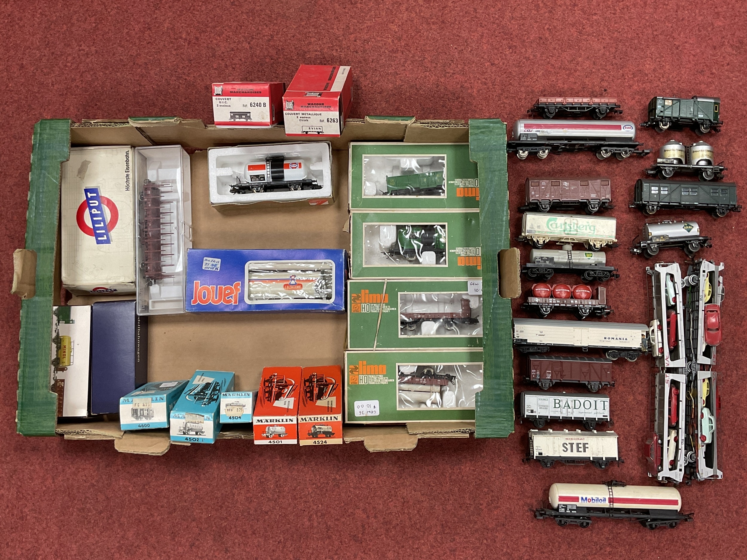 Approximately thirty HO scale European freight wagons (fifteen boxed) by Lilliput, Jouef, Hornby-Acho, and others, playworn.
