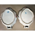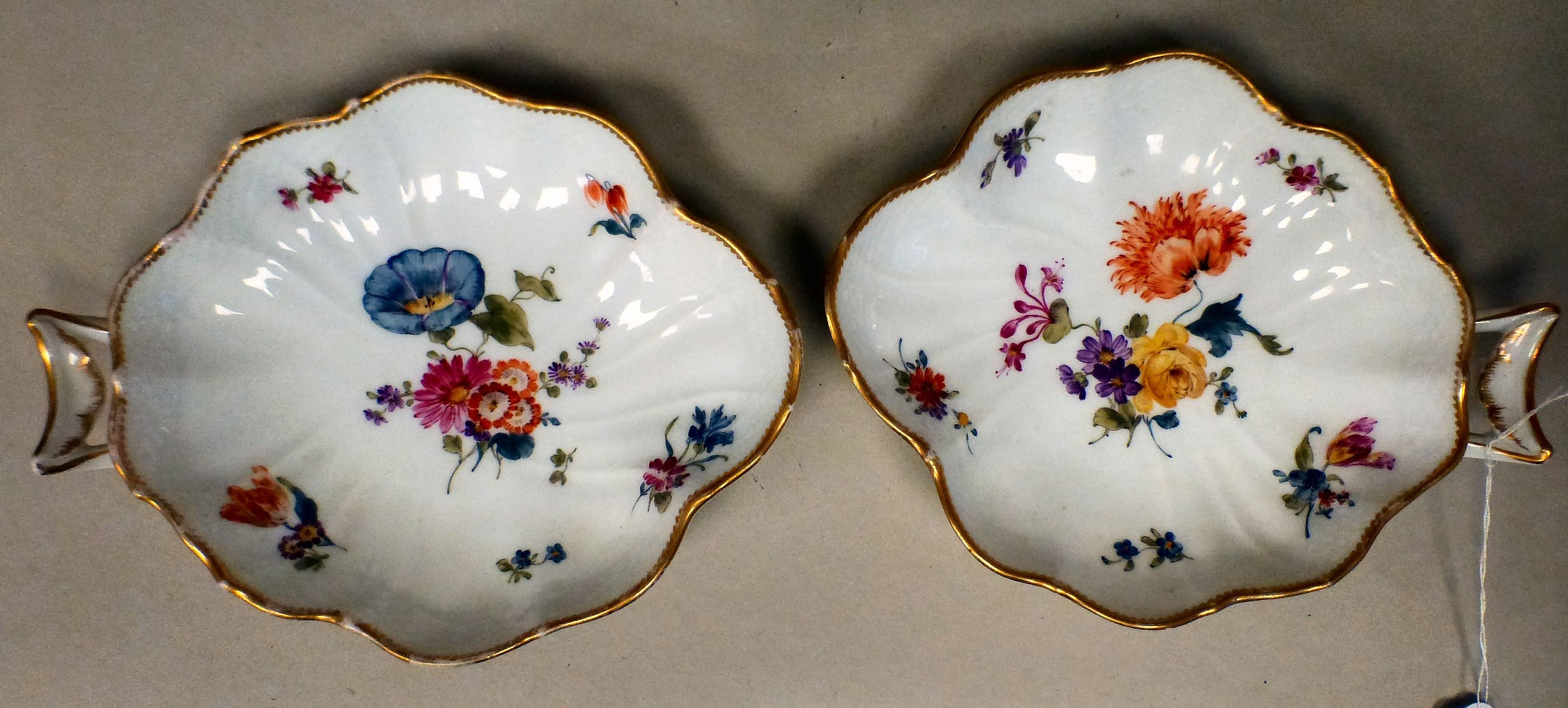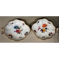 A pair of late 18th/early 19thC Copenhagen porcelain leaf design, open handled shallow dishes with gilt banding and handpainted floral decoration 7"w overall