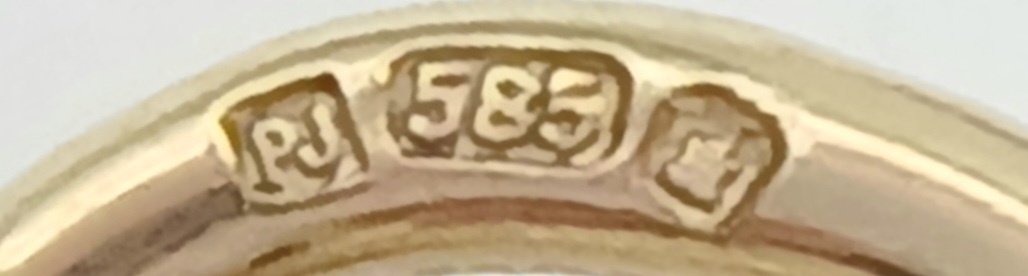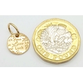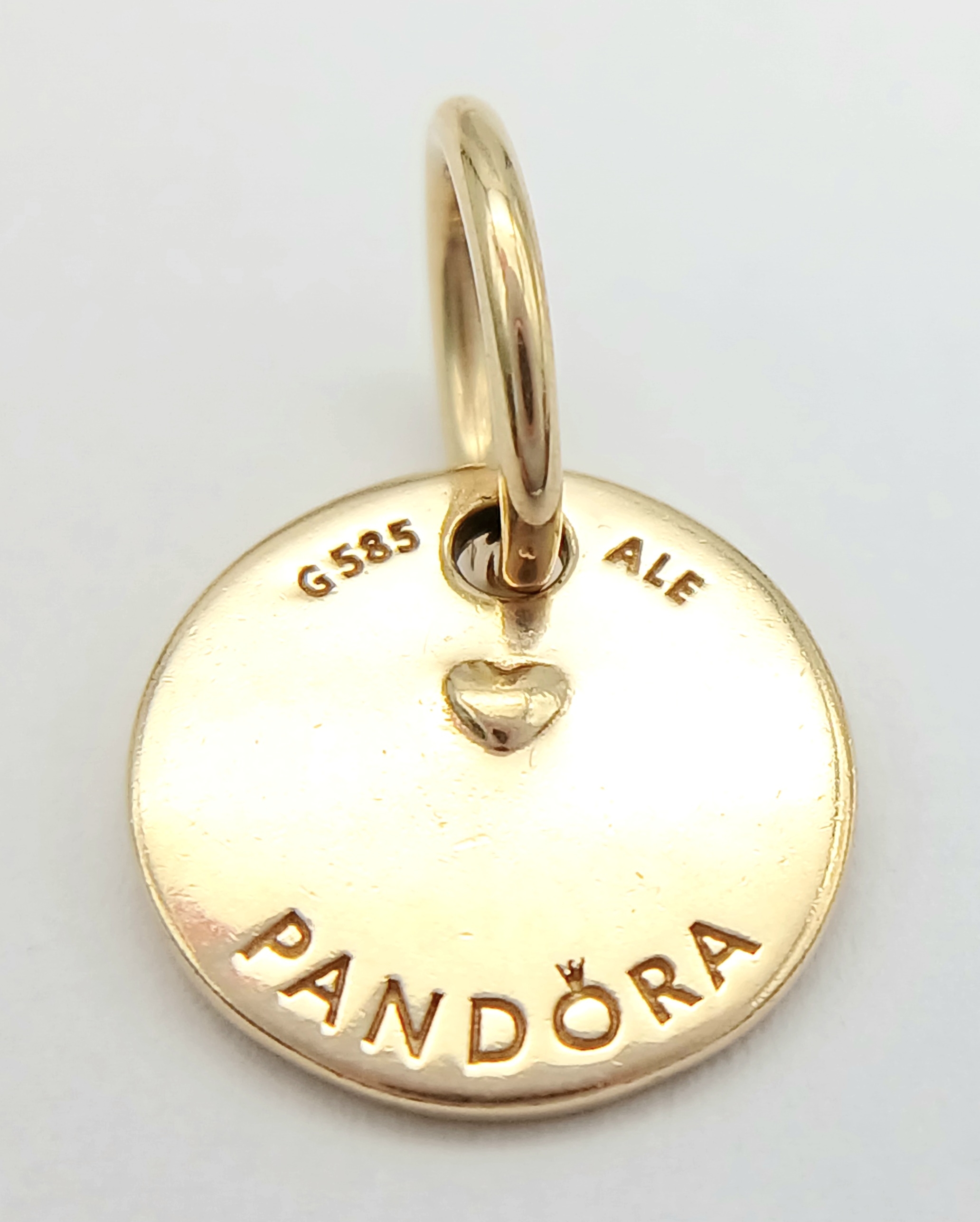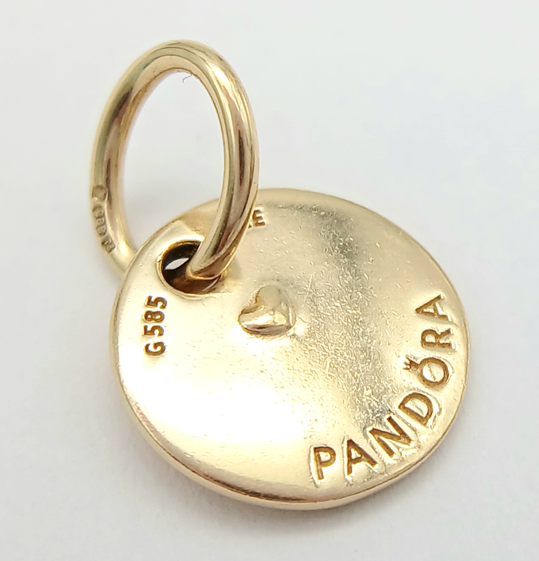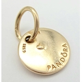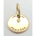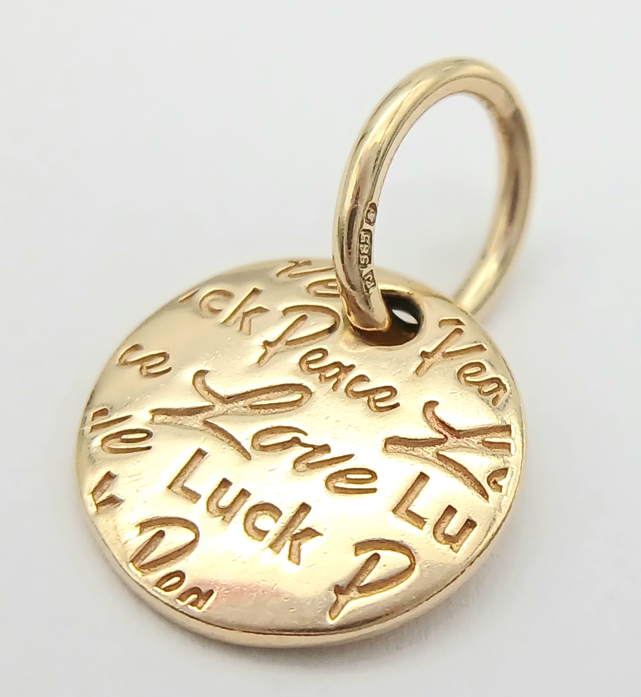 A PANDORA 14K YELLOW GOLD PEACE, LOVE AND LUCK CHARM. 1.5G. R9916.