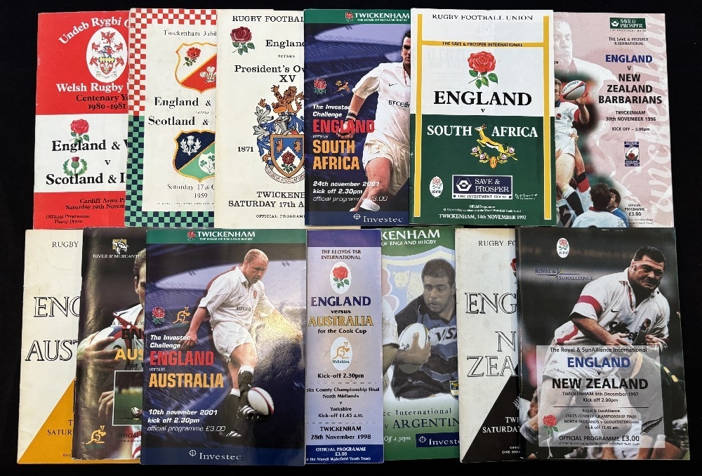 England v Tourists and Special Rugby Programmes (13): v NZ 1967 and 97, v S Africa 92 and 2001; v Australia 67, 97, 98 and 2001; v Argentina 2000; v NZ Baabaas 96; v Pres. Overseas XV 71; and Four Nations, E/W v S/I 59 and 80. G/VG