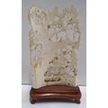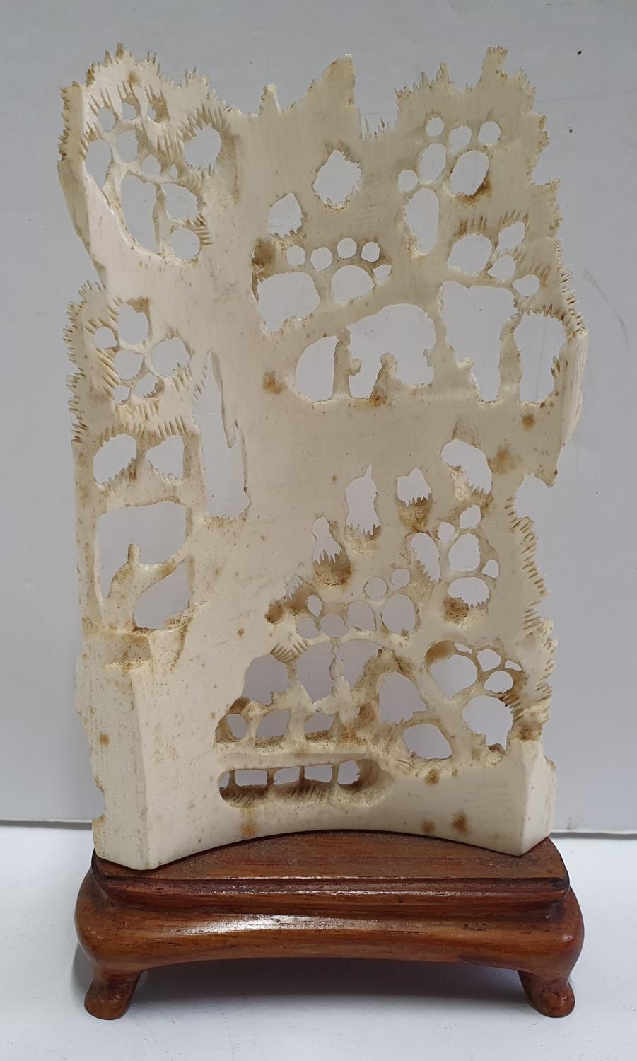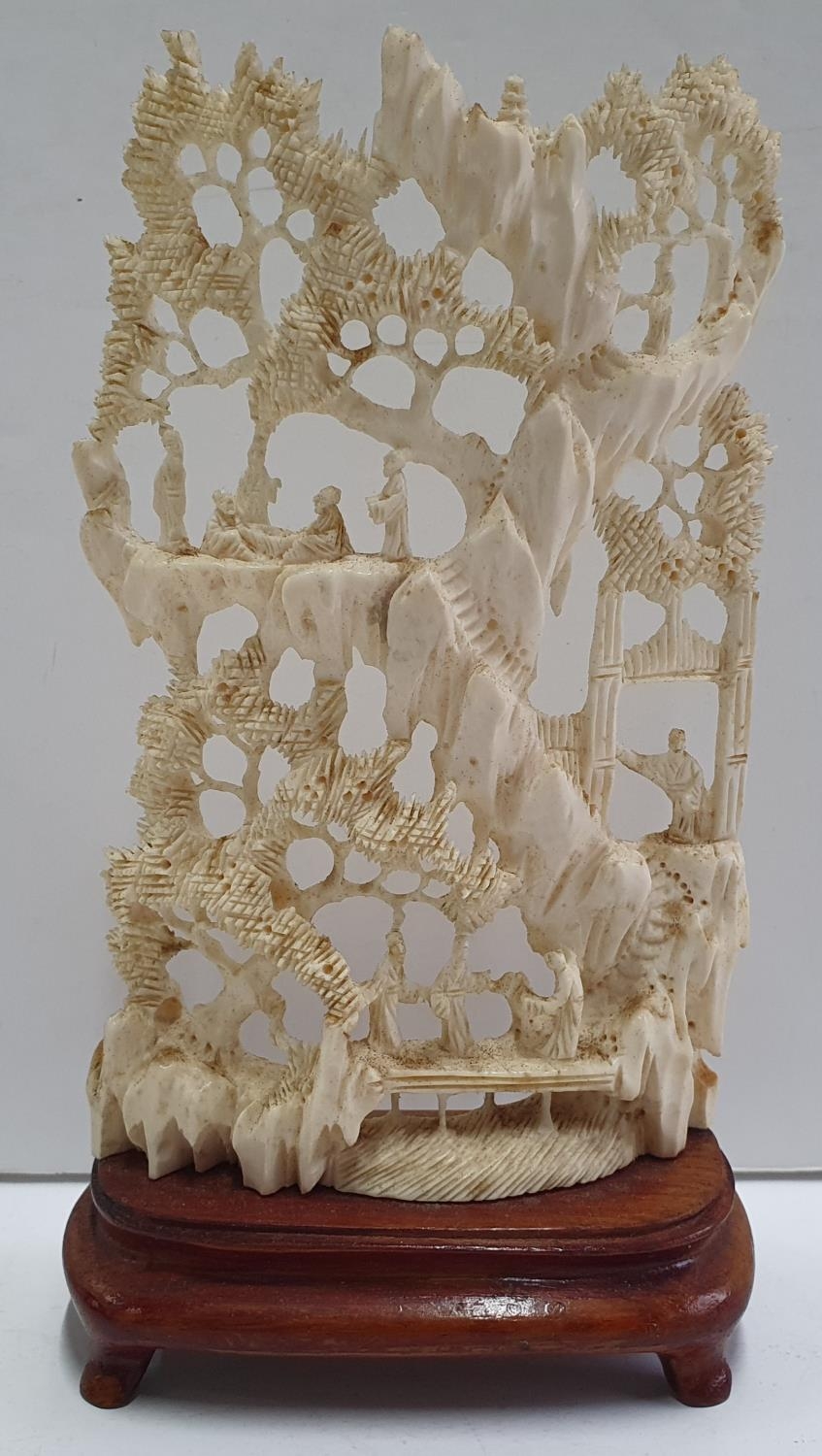 Fine carved, antique Ivory Japanese figures in landscape scene on wooden plinth