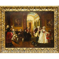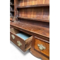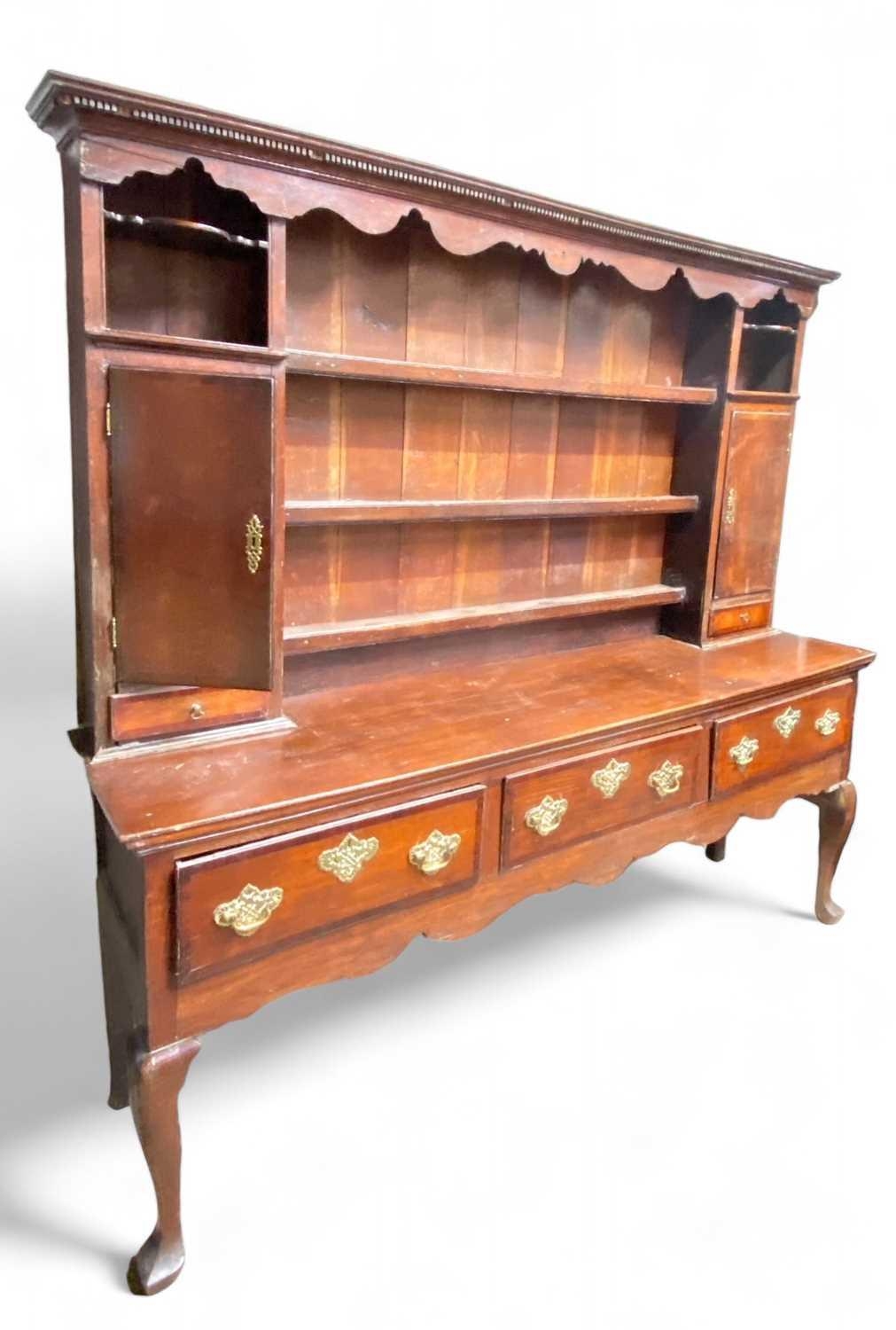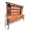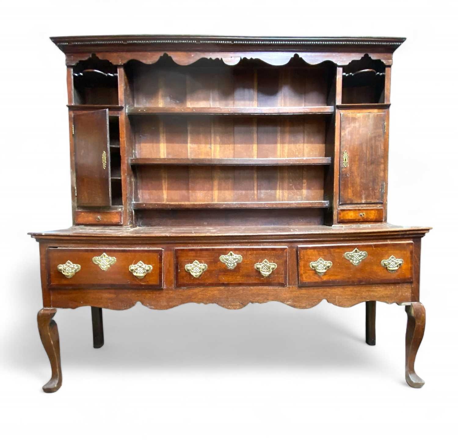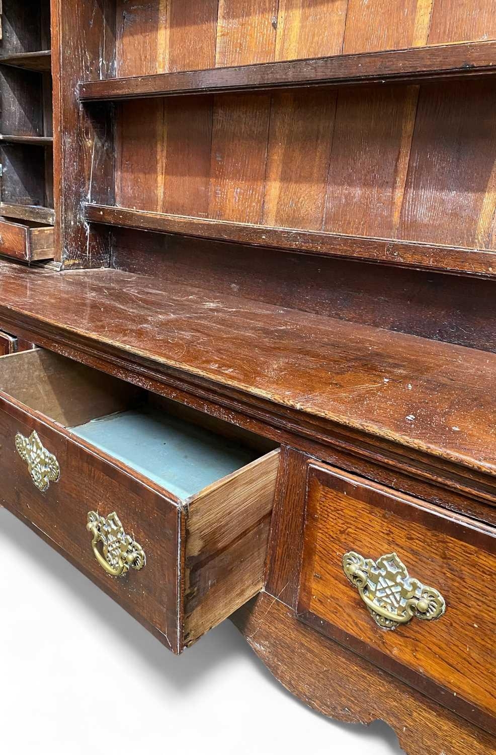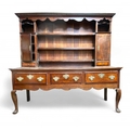 A George III oak dresser. The upper section with three central open shelves flanked by short alcove shelves over spice cupboards and short drawers the base with three short drawers rasied cabriole legs, height 191cm width 199cm depth 49cm.