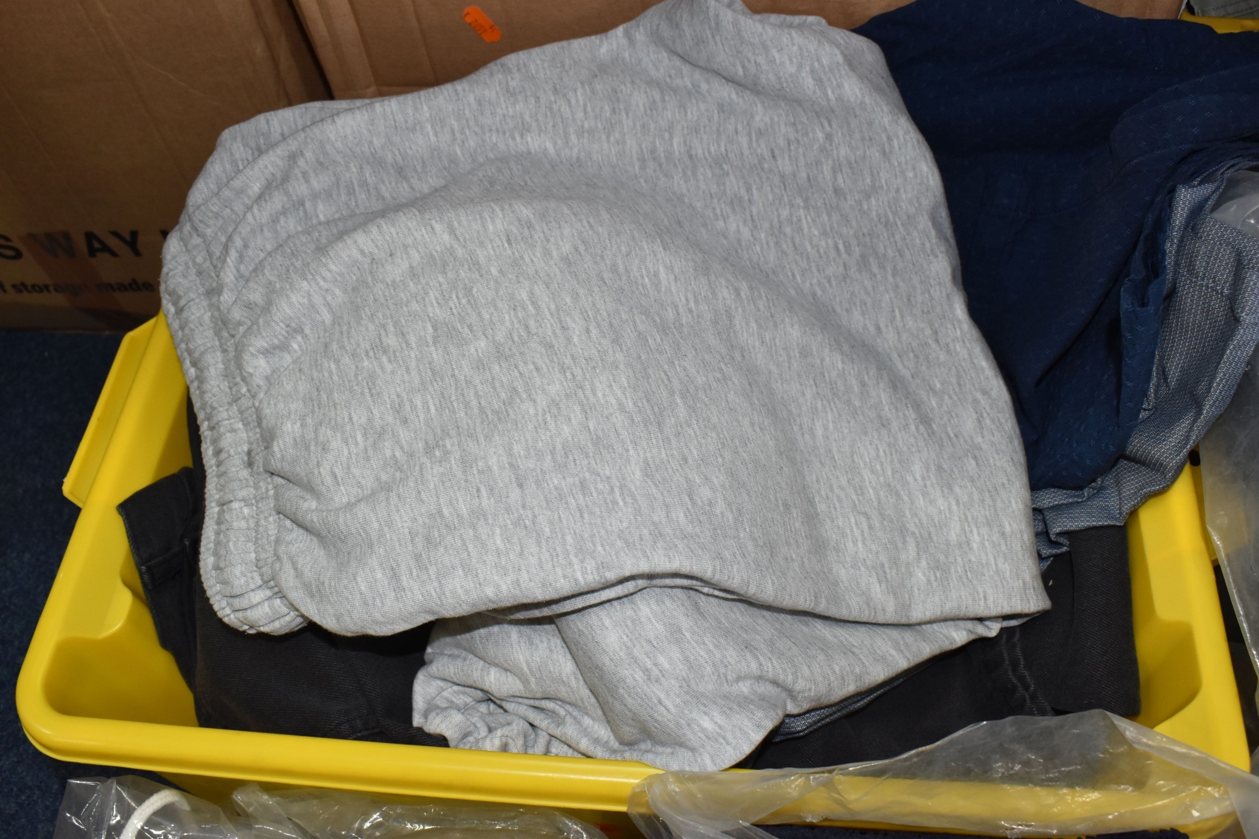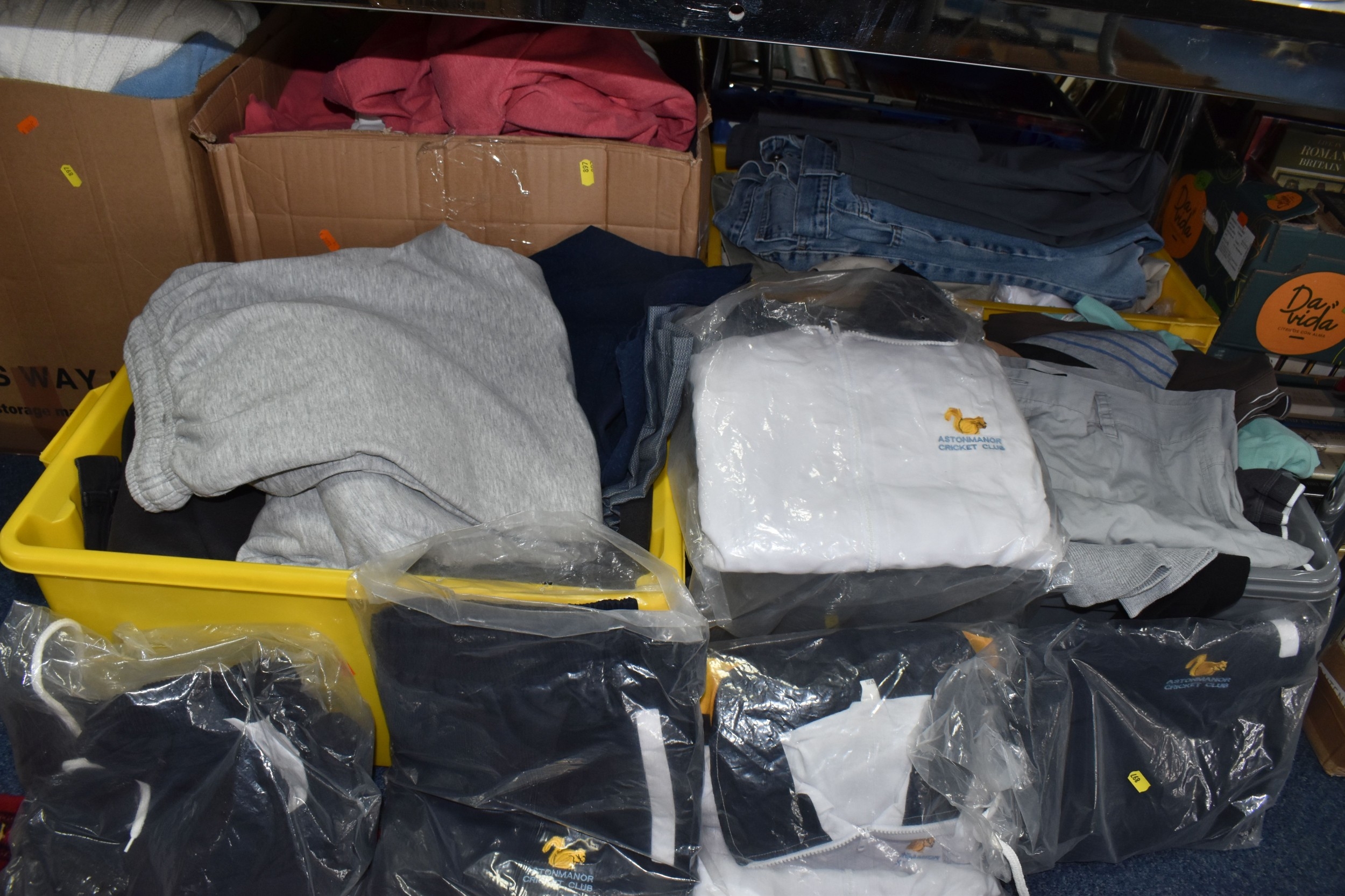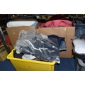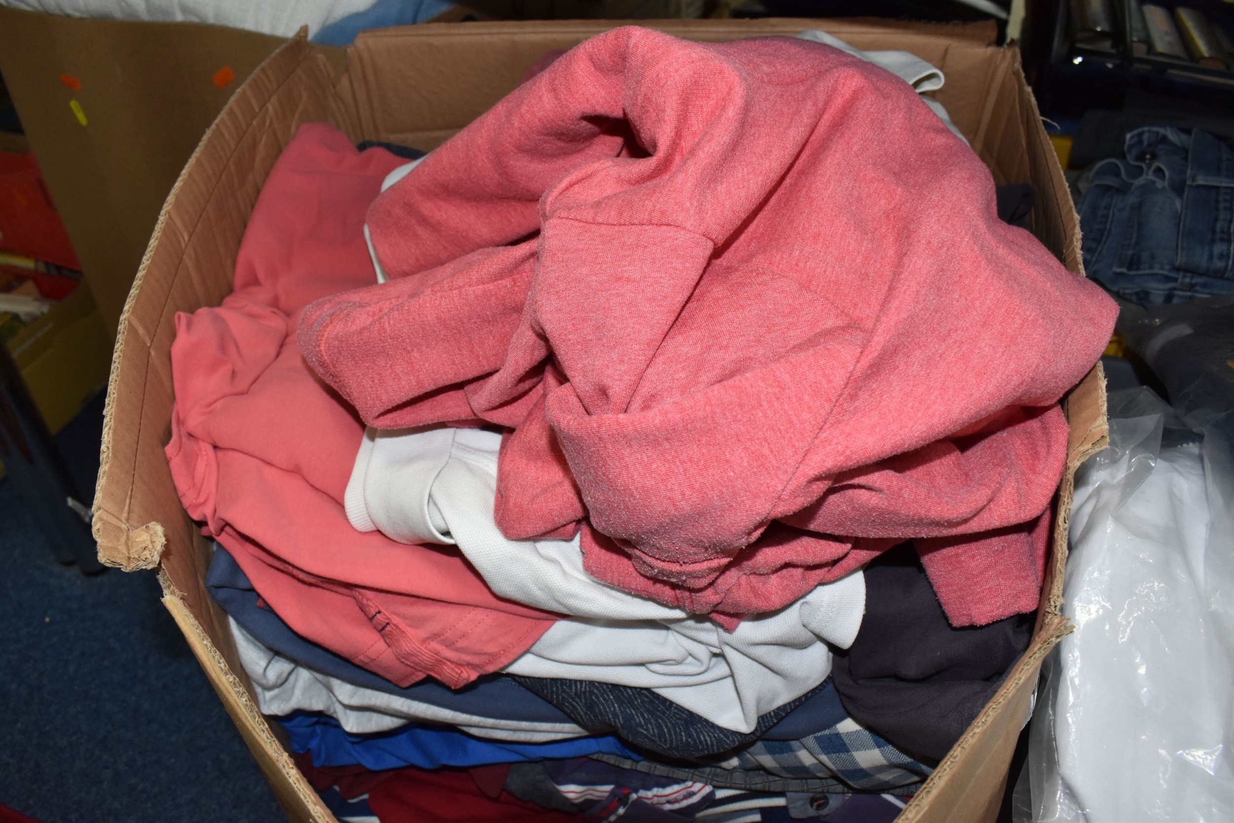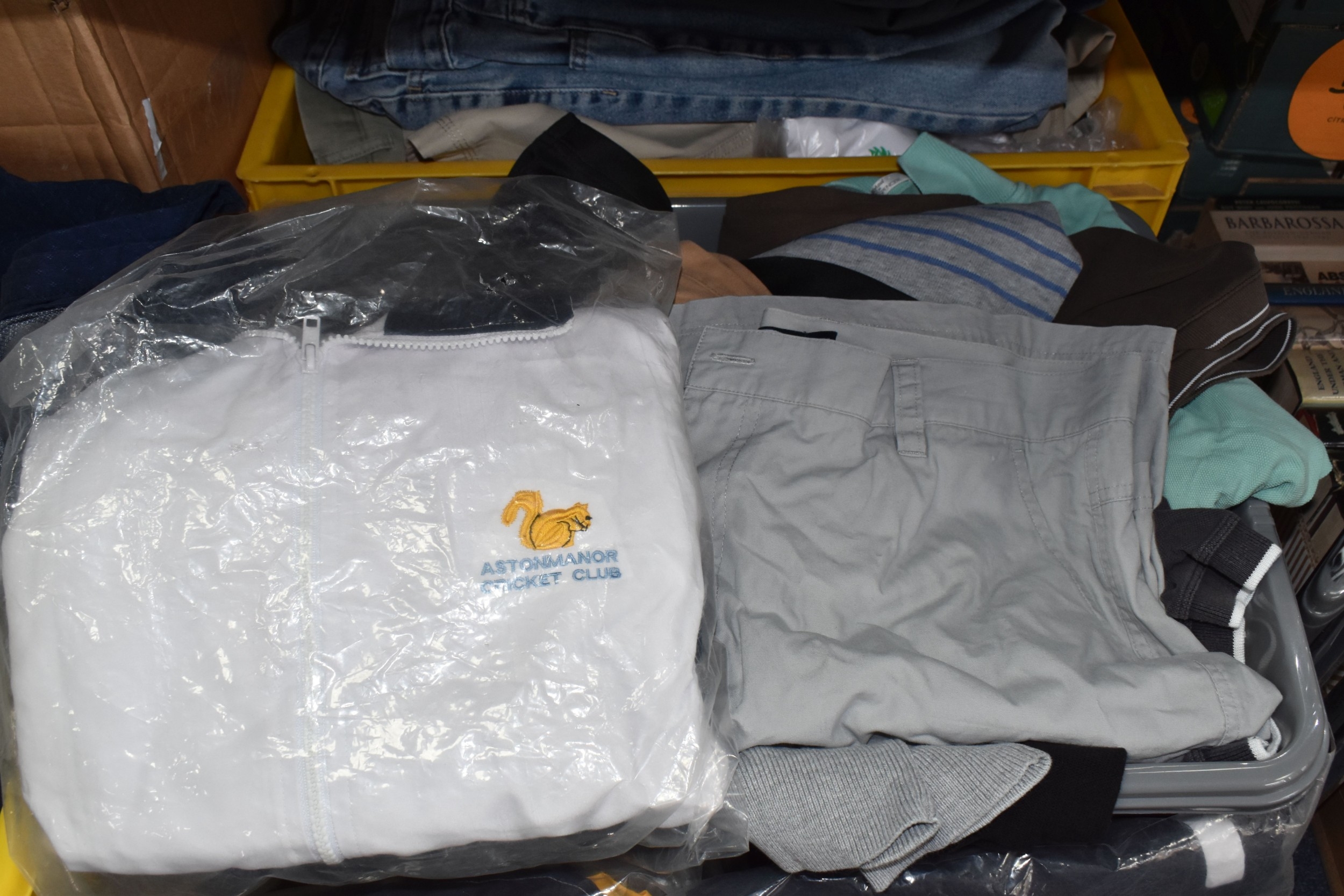 FIVE BOXES OF MEN'S CLOTHES, to include jumpers, jackets, shorts, trousers, jeans, and t-shirts, mostly high street supermarket brands such as George, TU, etc. some names include Blue Harbour, Reebok and Converse, also include Aston Manor Cricket Club jackets, sizes large to X-large and bottoms 38inch waist, (5 boxes), (sd/af)