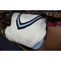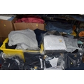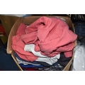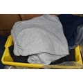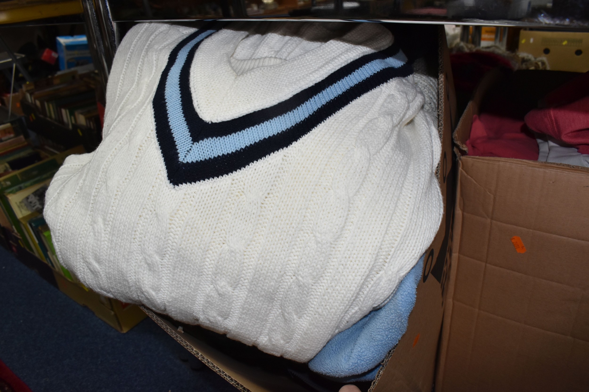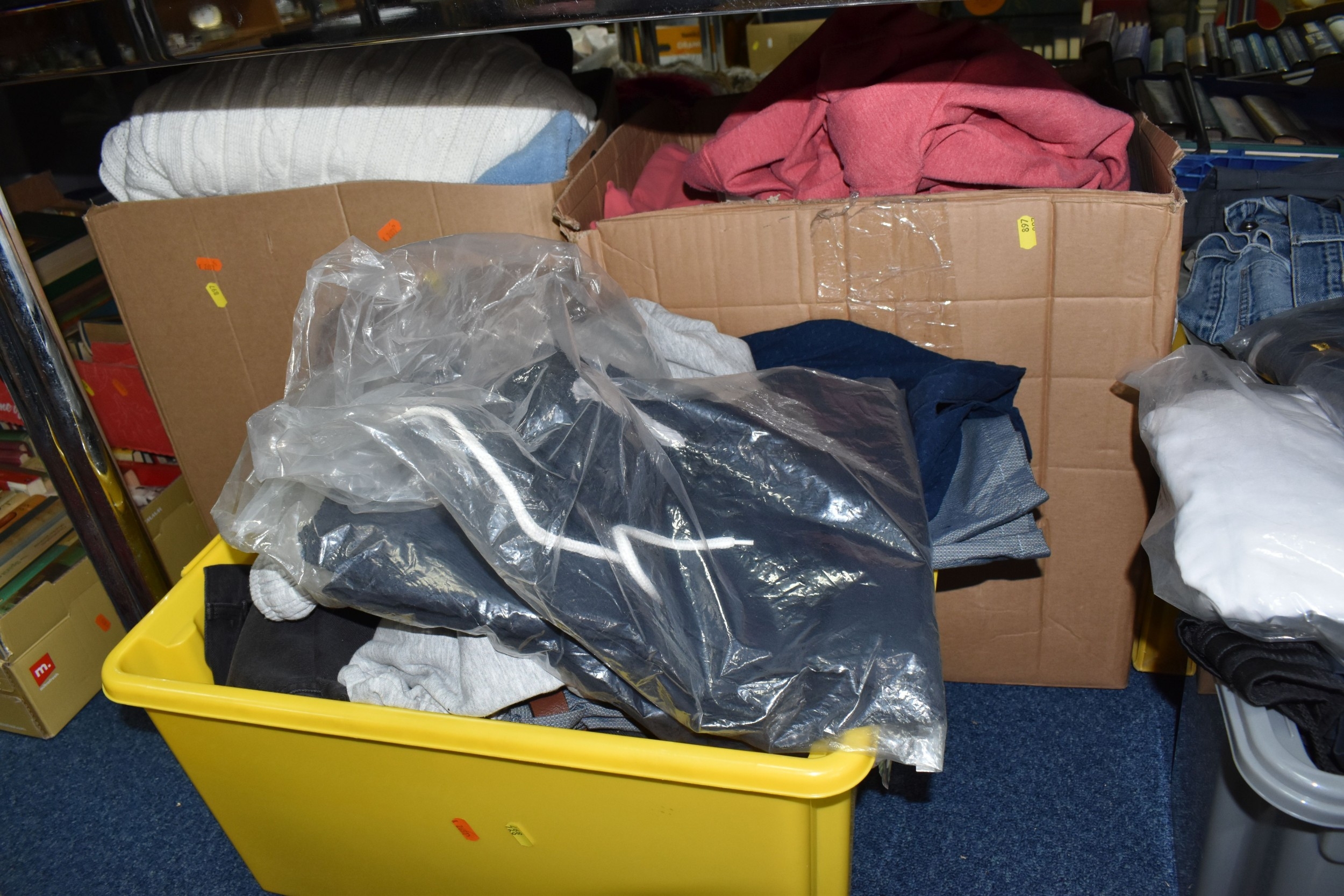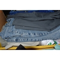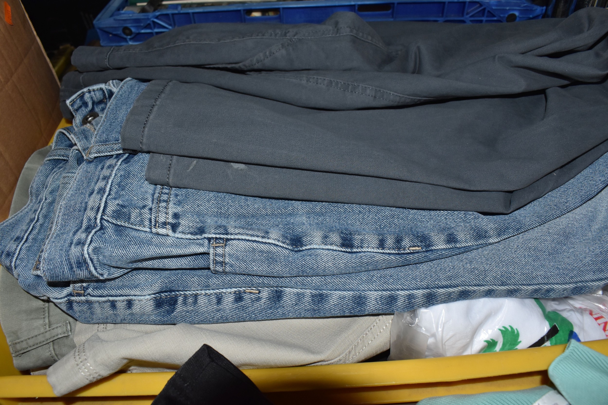 FIVE BOXES OF MEN'S CLOTHES, to include jumpers, jackets, shorts, trousers, jeans, and t-shirts, mostly high street supermarket brands such as George, TU, etc. some names include Blue Harbour, Reebok and Converse, also include Aston Manor Cricket Club jackets, sizes large to X-large and bottoms 38inch waist, (5 boxes), (sd/af)