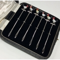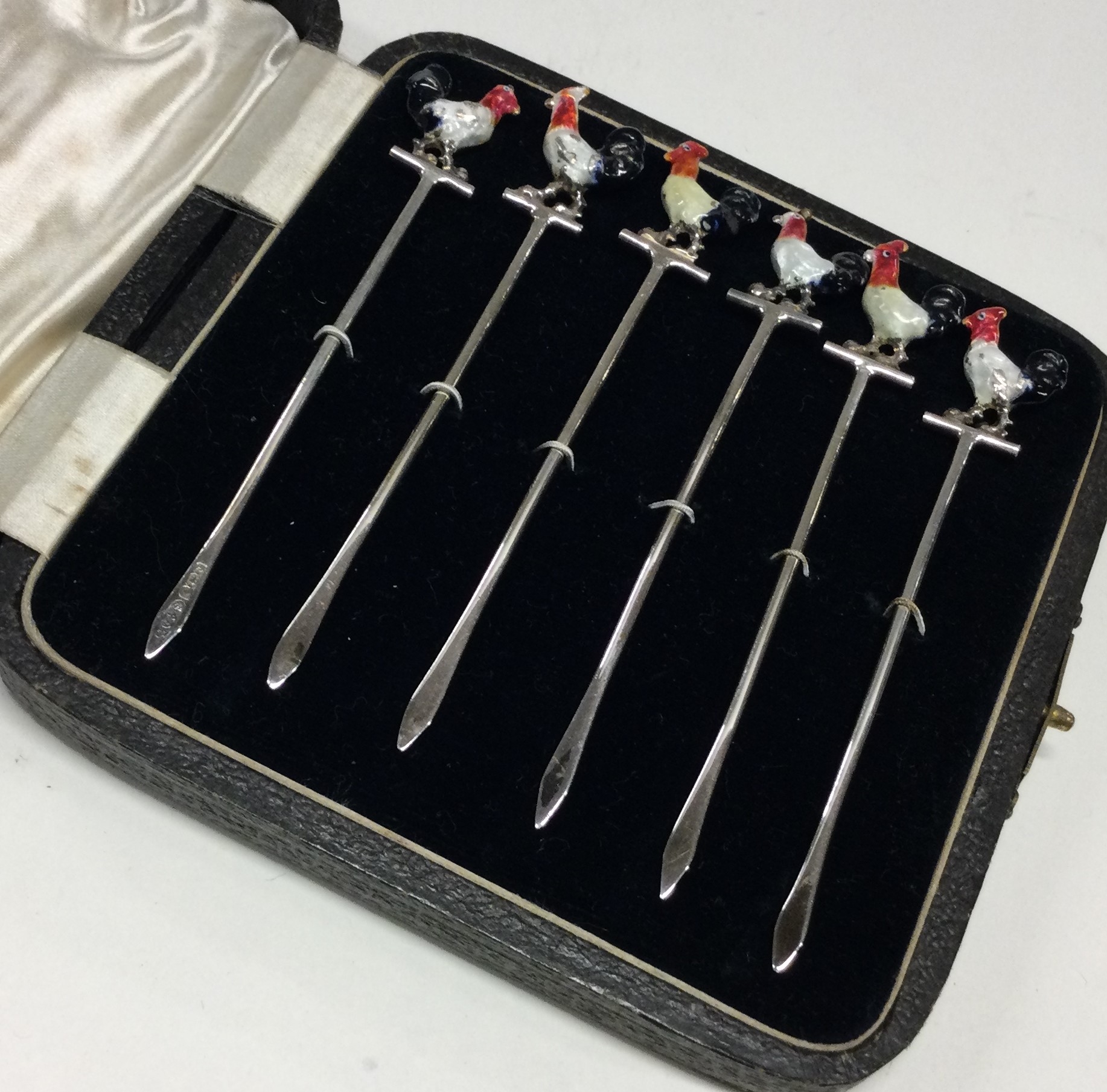A set of six silver and enamel cockerel sandwich holders. Birmingham 1958. By Joseph Gloster and Sons. Approx. 30 grams. Est. £140 - £160.
